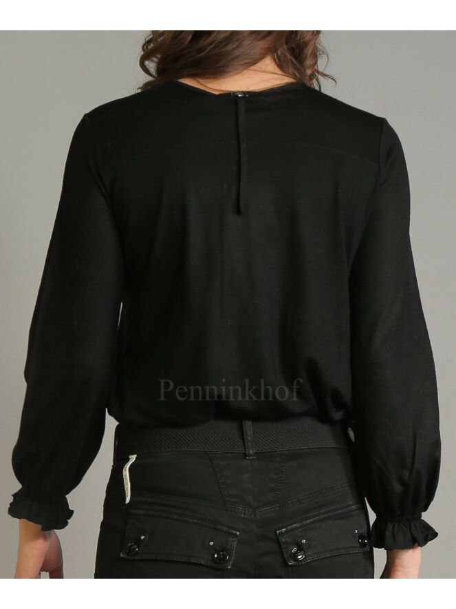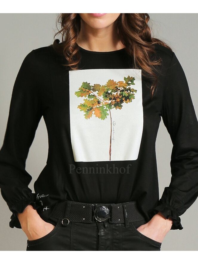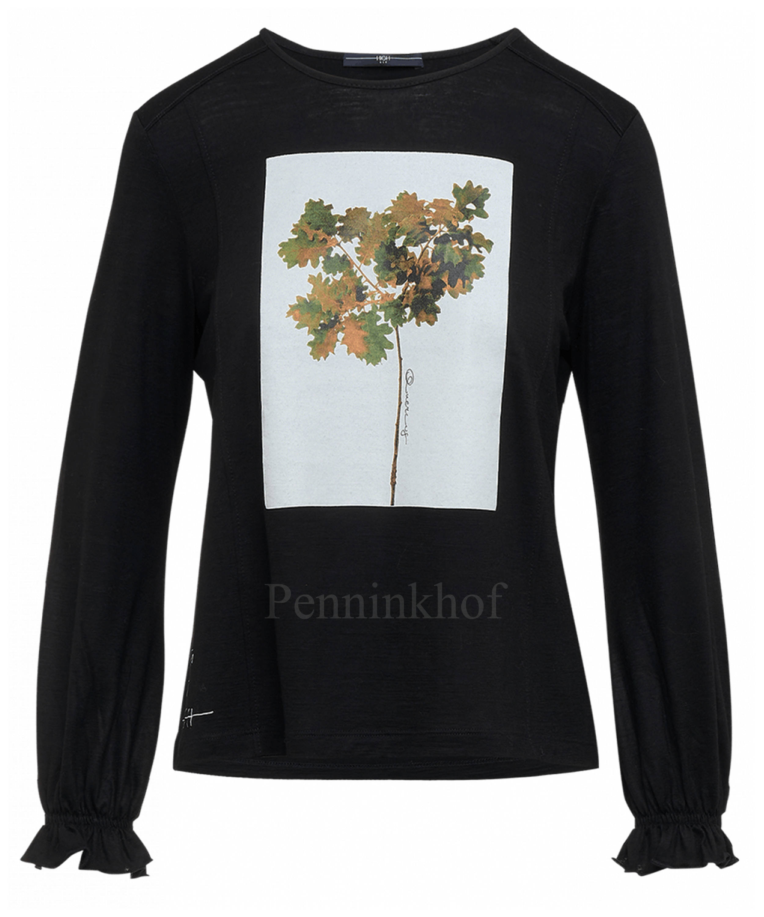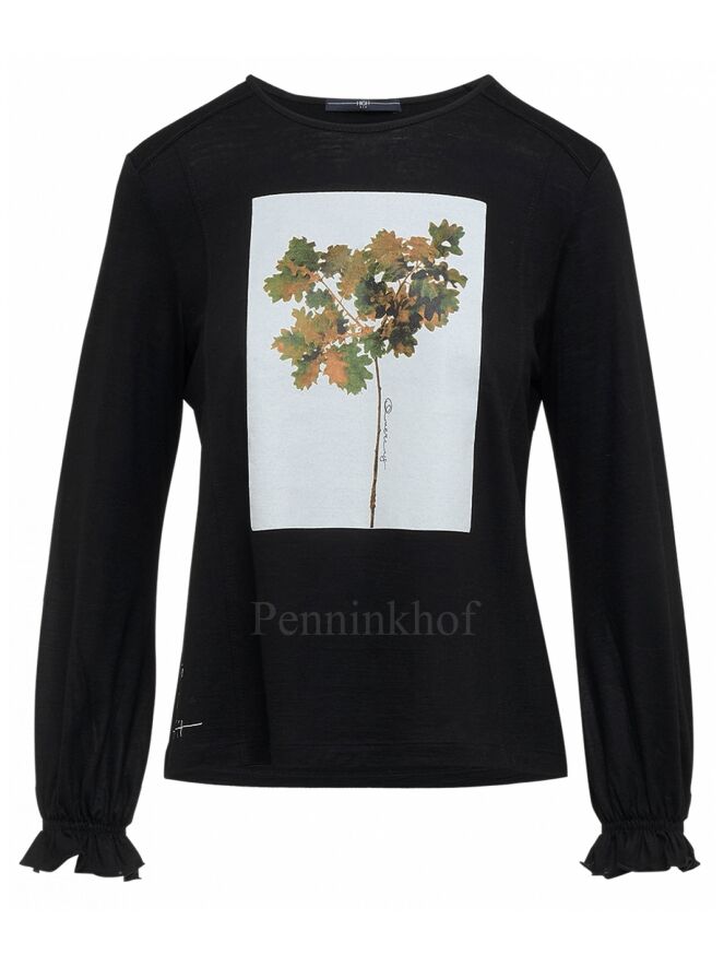 Ein marineblauer Pullover der Designermarke High. Auf der Vorderseite befindet sich ein Fotodruck von Enrico de Luigi von einem Eichenzweig. An den Ärmelenden befindet sich ein fein plissierter Gummizug. Dieser Pullover darf von Hand gewaschen werden.