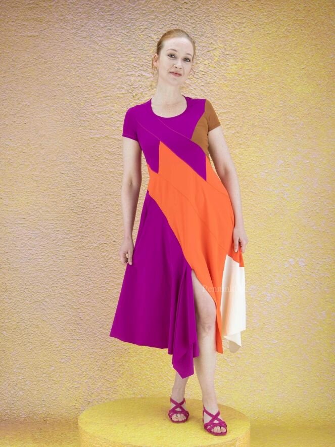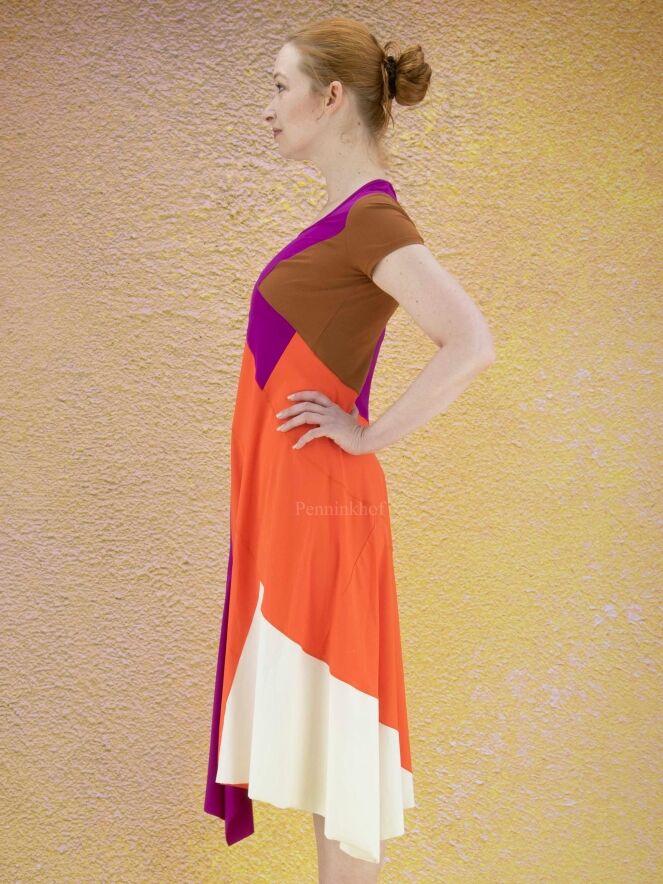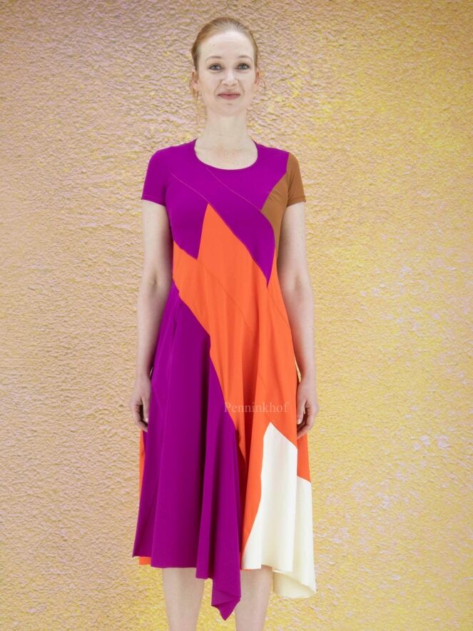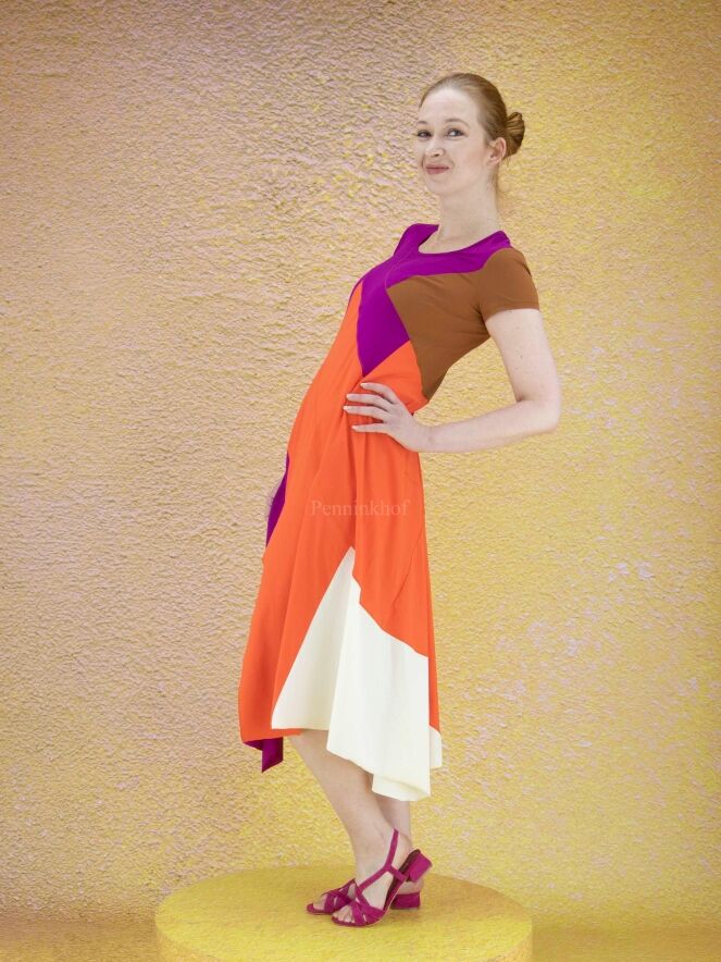 Ein Kleid der Designermarke High in drei Farbbereichen: Cognac, Orange und Lila. Auf der linken Seite der Taille befindet sich eine Tasche. Der untere Saum ist auf der Vorderseite in der Mitte mit einem Schlitz versehen. Das Kleid hat eine A-Linie ab der Taille, einen Rundhalsausschnitt und kurze Ärmel. Dieses Kleid darf von Hand gewaschen werden.