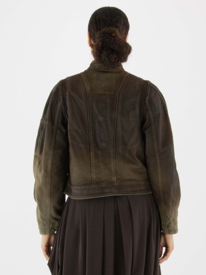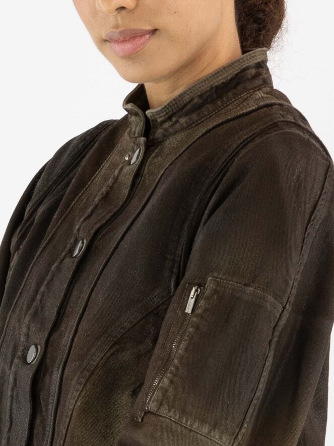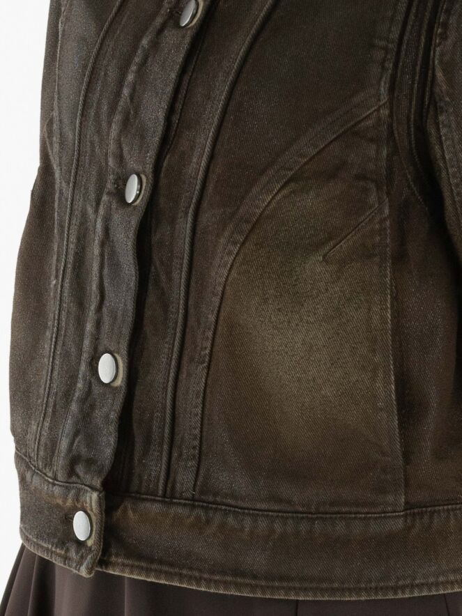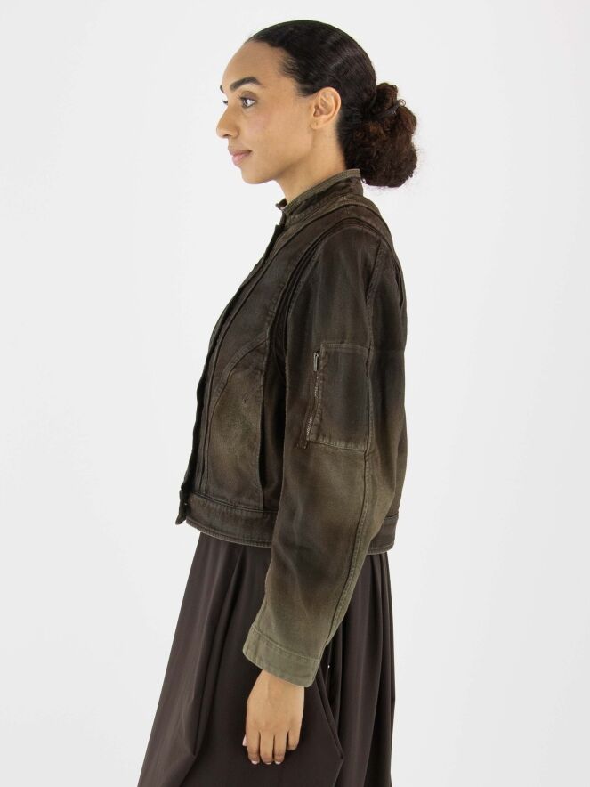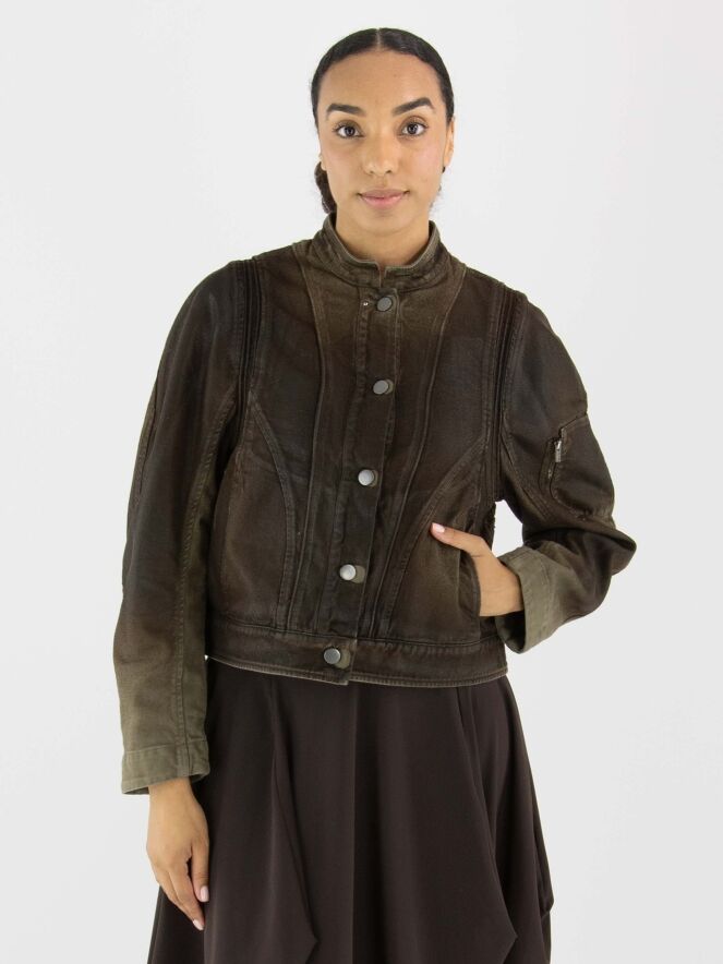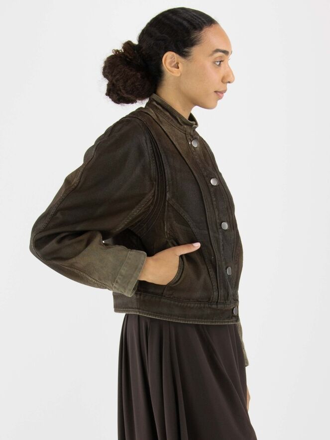 Ein gewachster Jeansblazer im Used-Look in Mokkabraun. Der Blazer hat Taillentaschen und eine Knopfleiste mit fünf Knöpfen. Dieser Blazer sollte von Hand gewaschen werden.