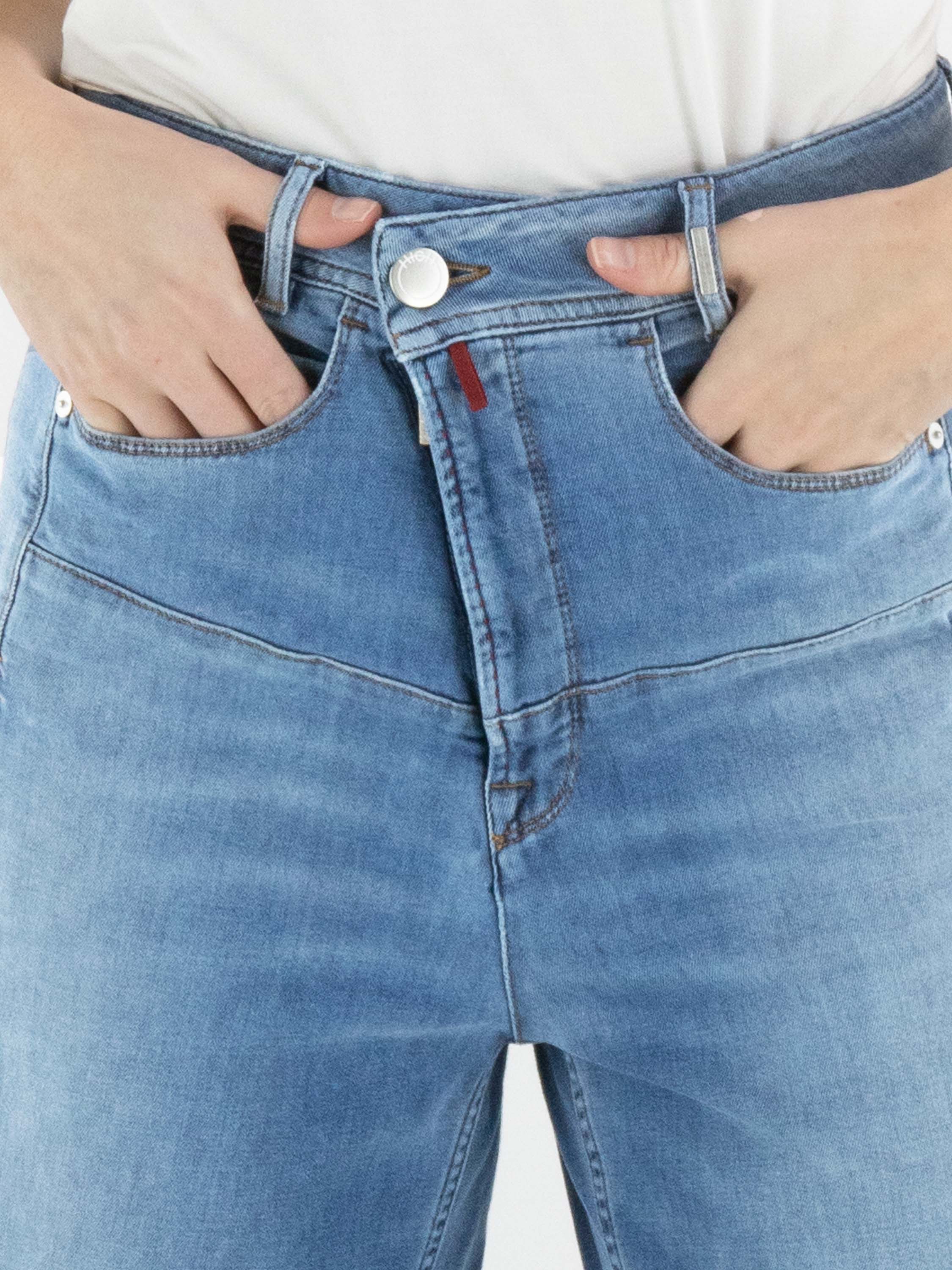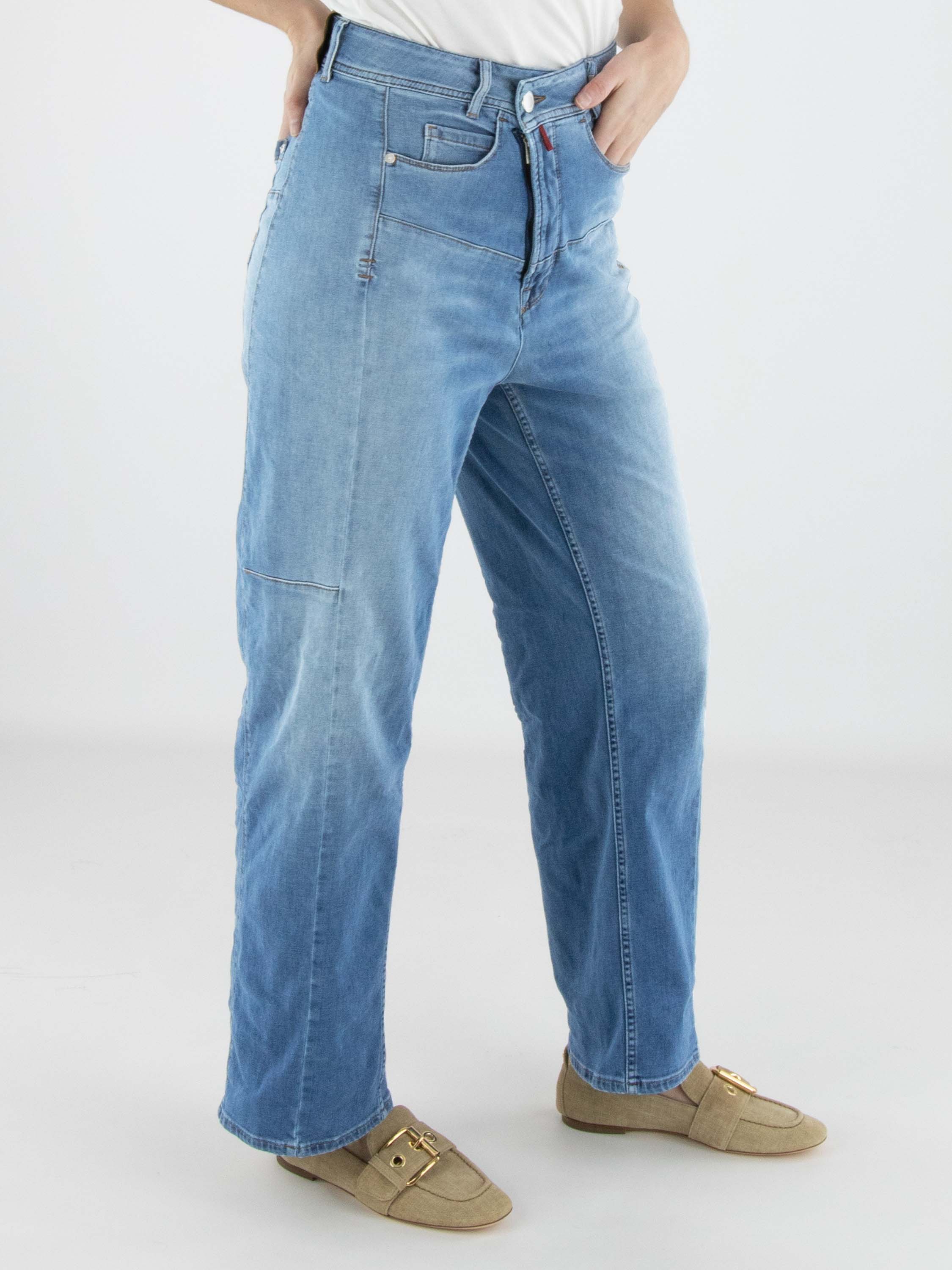 Hochgeschnittene Jeans von High in Used-Denimfarbe. Das 5-Pocket-Modell ist oberhalb der Knie an der Außenseite mit einer dezenten formgebenden Naht versehen, die die Silhouette elegant betont. Diese exklusive Designerjeans kann bei 30 Grad gewaschen werden.