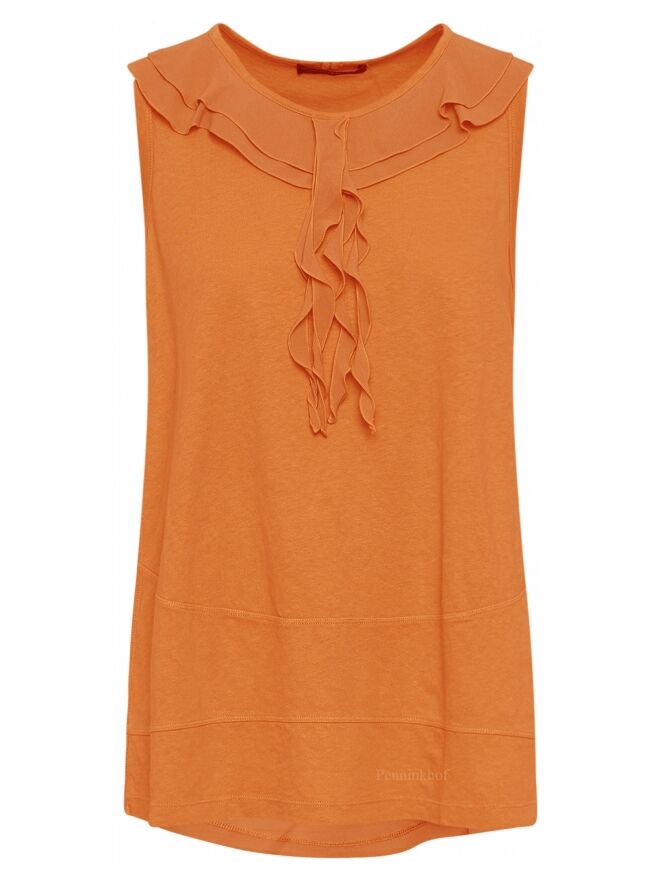 Ein Top der Designermarke High in Orange. Das Top hat eine A-Linie wobei die Rückseite 15 cm länger ist als die Vorderseite. Am Rand des Rundhalsausschnitts befindet sich ein leicht transparentes Doppelgewebe mit zwei Bändern in der Mitte. Die Rückseite und die Seiten sind ebenfalls aus einem leicht transparenten Stoff. Dieses Top darf von Hand gewaschen werden.