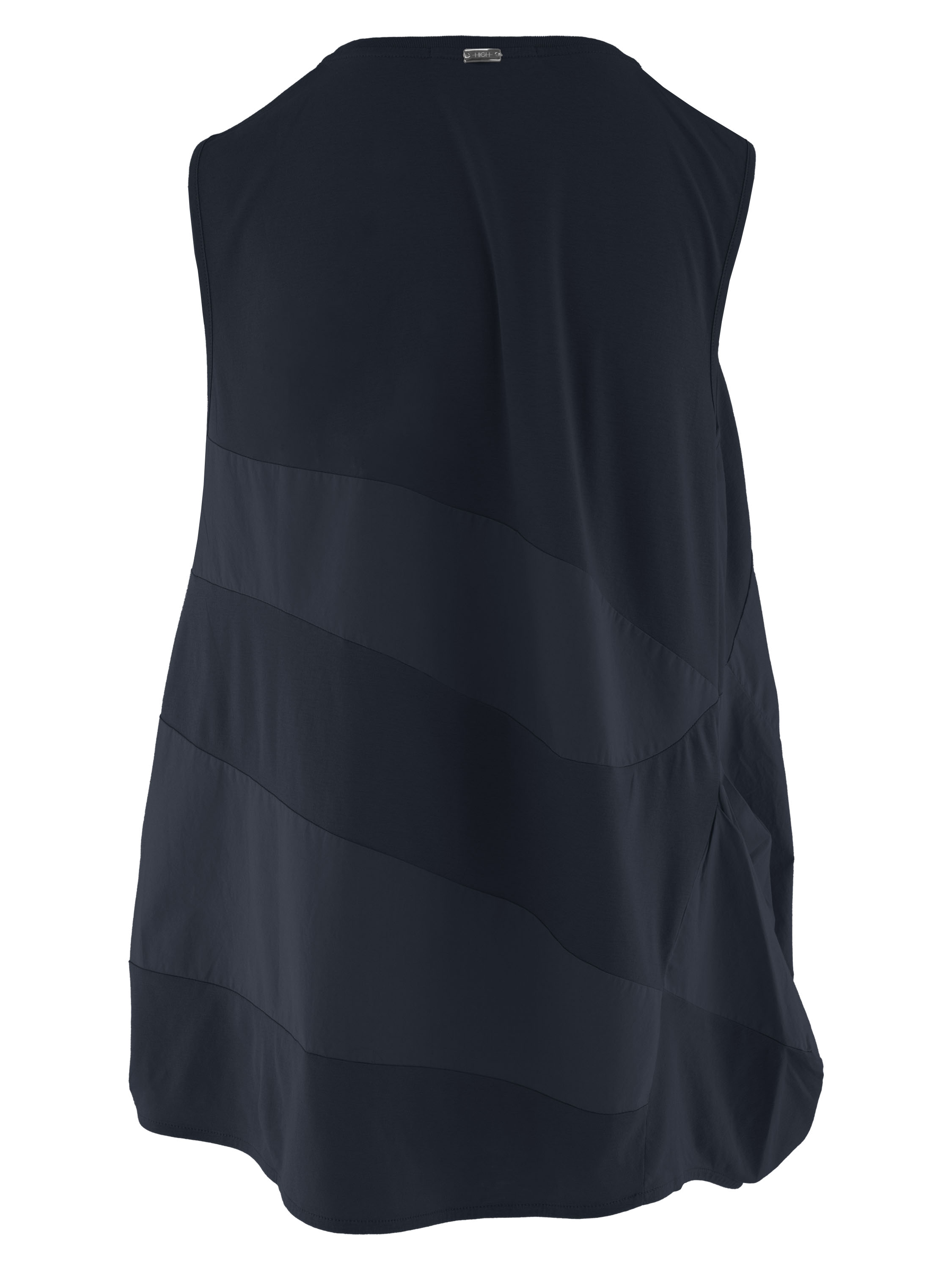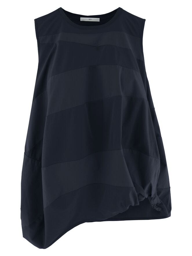 Ein Top von High mit einem breiten Streifenmuster in Nachtblau und Marineblau. Entlang des Rundhalsausschnitts ist eine fein plissierte Strickborte verarbeitet. Am Saum ist der Stoff seitlich plissiert. Dieser Top kann von Hand gewaschen werden.