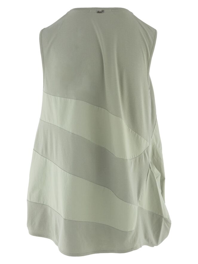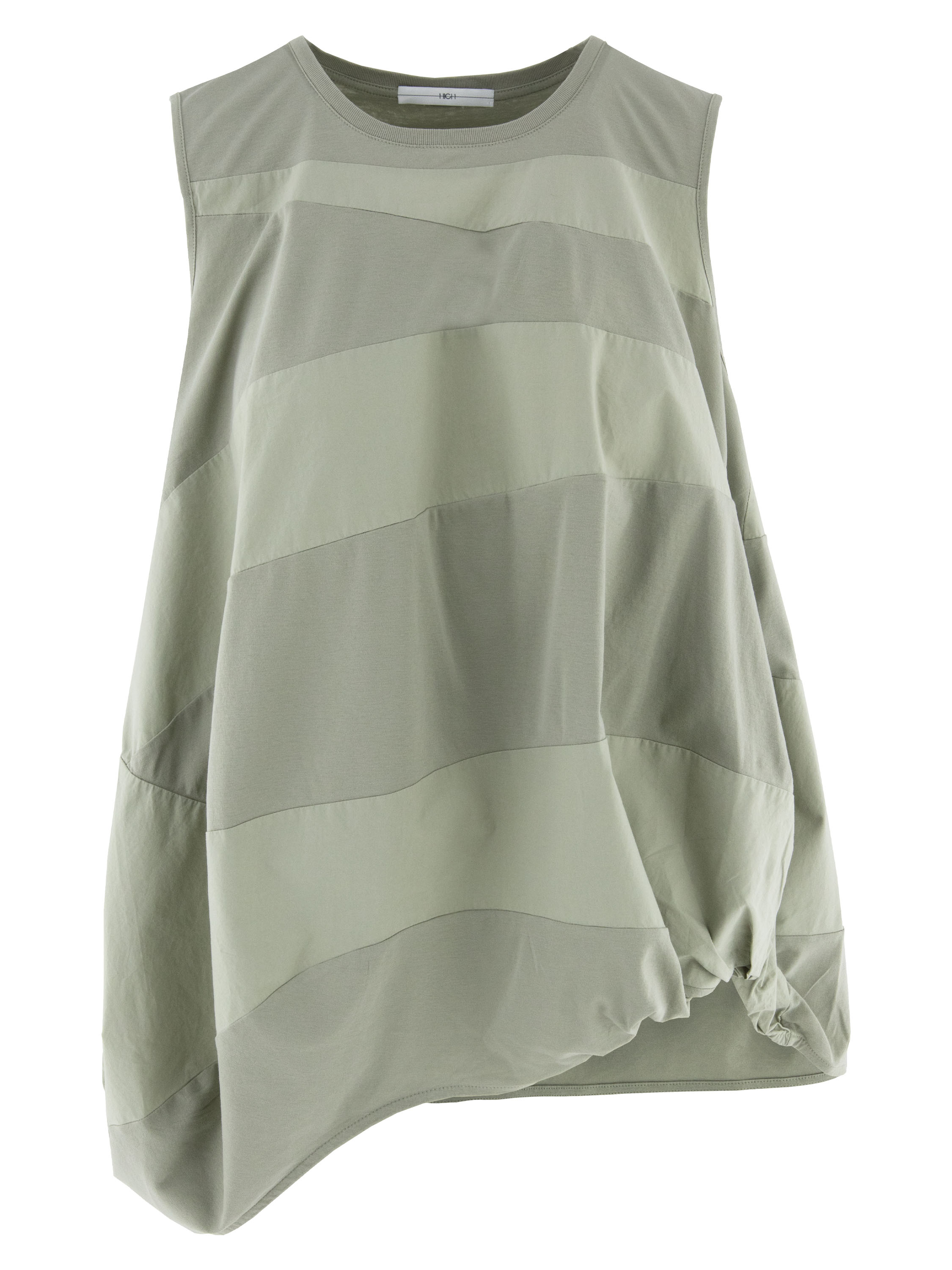 Ein Top von High mit einem breiten Streifenmuster in zwei Olivgrüntönen. Entlang des Rundhalsausschnitts ist eine fein plissierte Strickbiese verarbeitet. Am Saum ist der Stoff seitlich plissiert. Dieses Top kann von Hand gewaschen werden.
