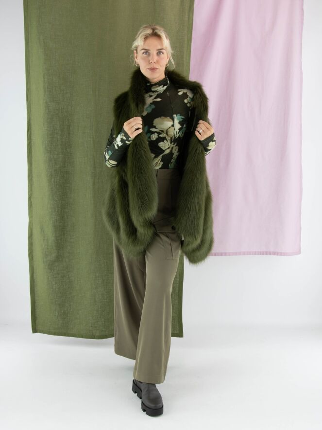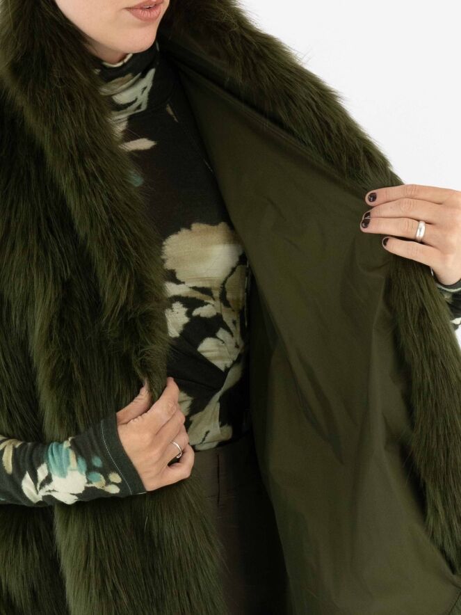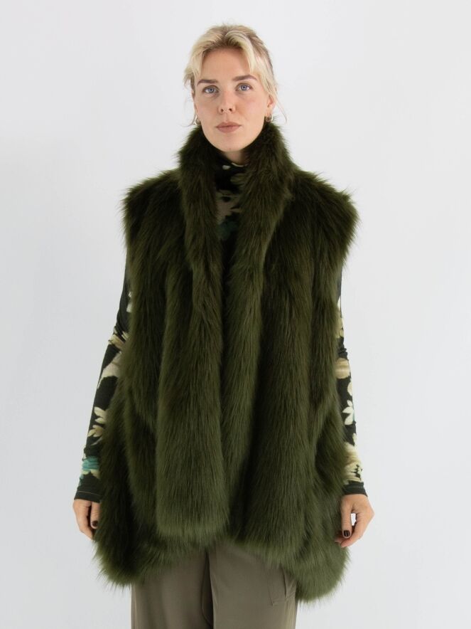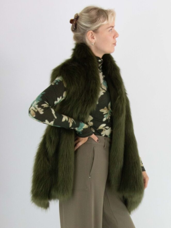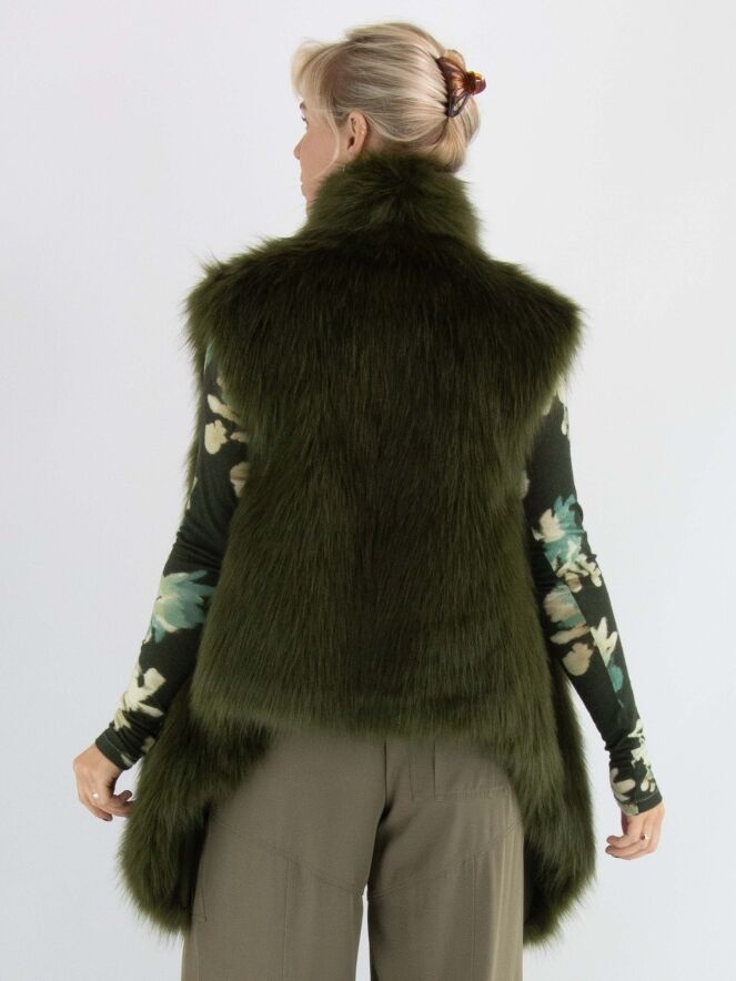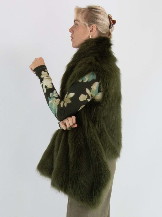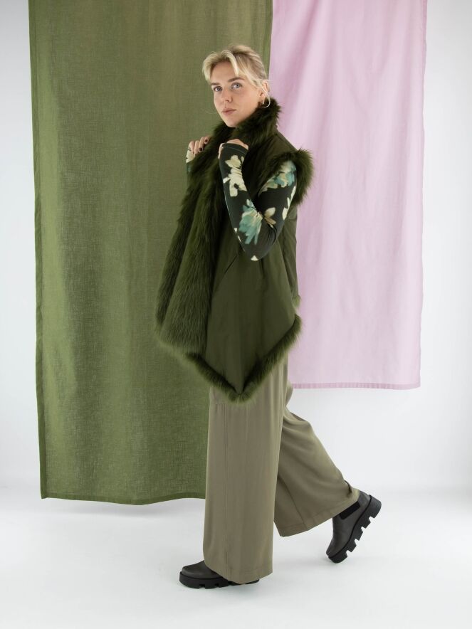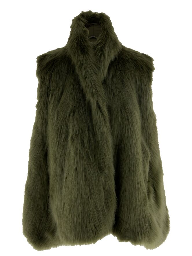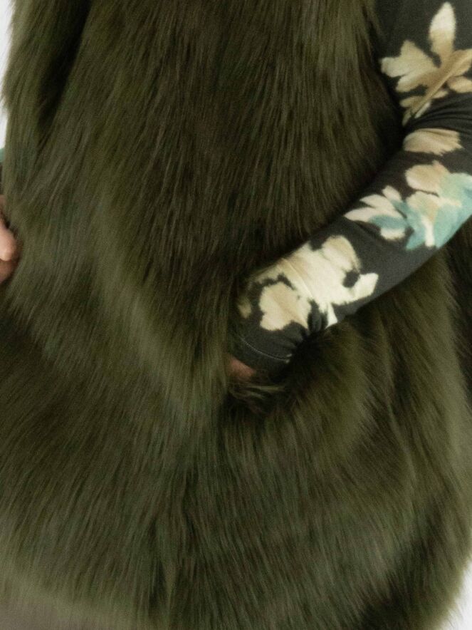 Wendbare Weste aus Kunstfell von High in Olivgrün. Die Weste hat auf beiden Seiten Eingrifftaschen und darf nicht gewaschen werden.