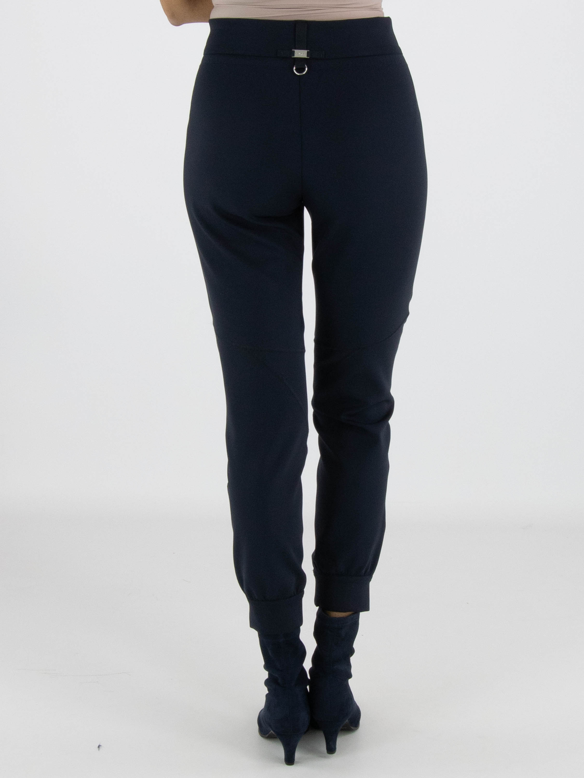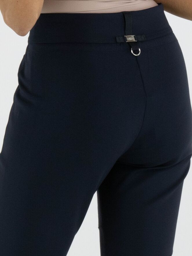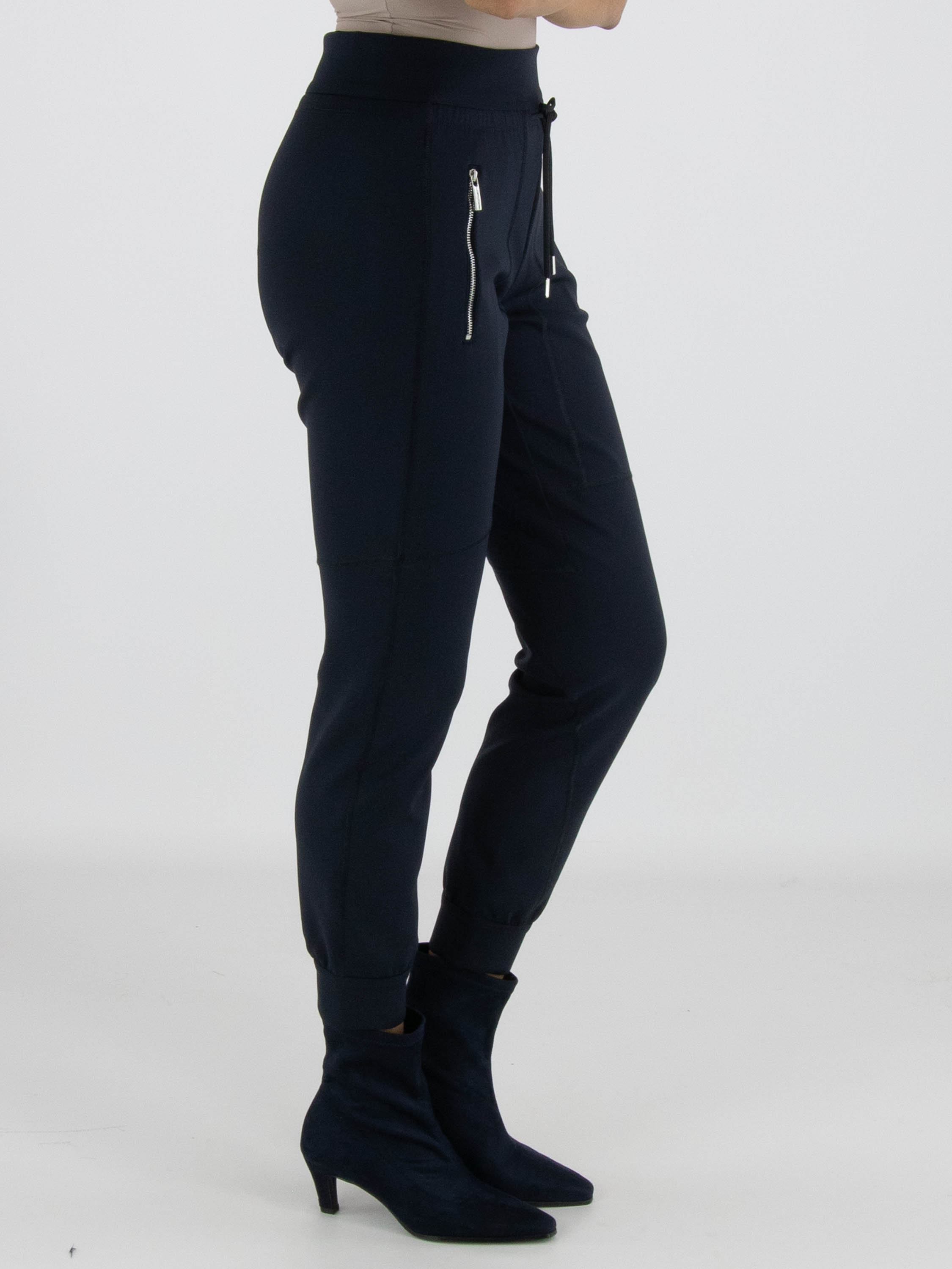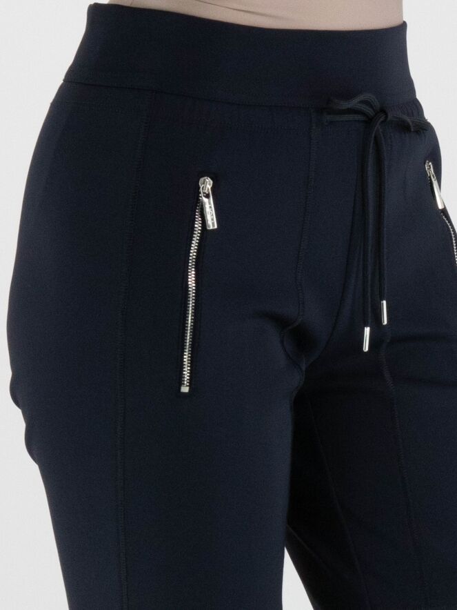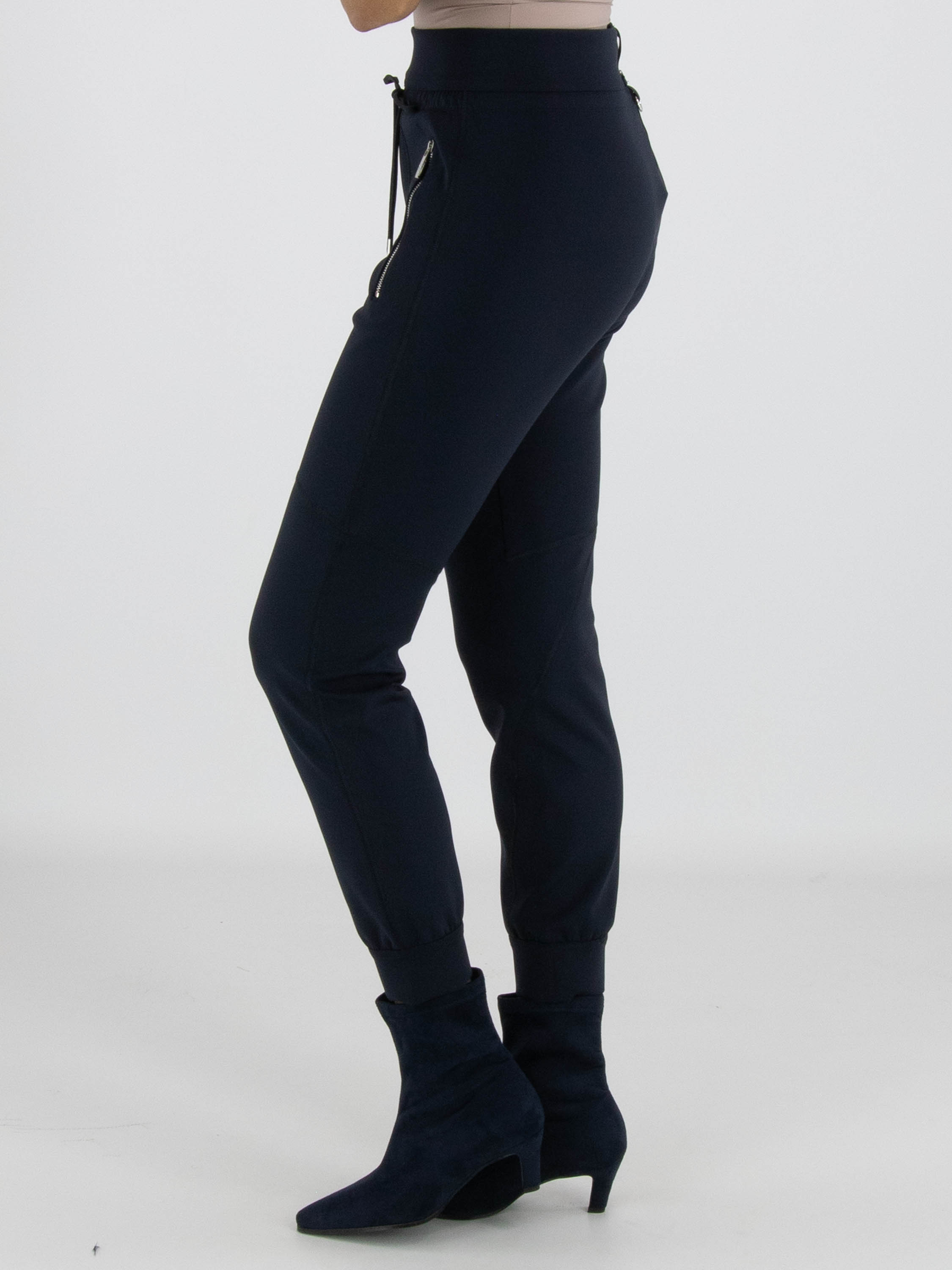 Eine Jogginghose von High in Marineblau. In der Taille und an den Beinabschlüssen befindet sich ein glatter elastischer Bund. Direkt unter dem Taillenbund verläuft ein Kordelzug in einer Tunnelverarbeitung. Die tiefen Eingrifftaschen sind mit Reißverschlüssen versehen. Am Oberschenkel, an den Knien und entlang der Seiten des Unterschenkels sind mehrere dekorative Nähte angebracht. Diese Hose kann bei 30 Grad gewaschen werden.