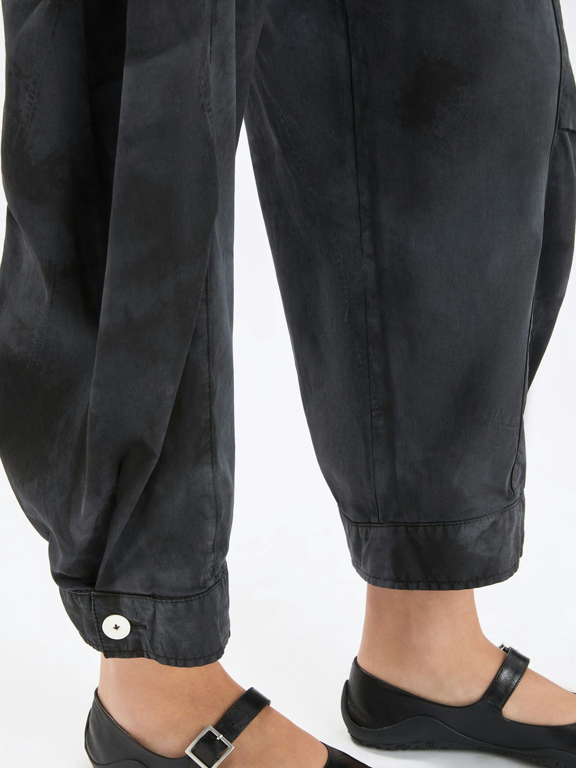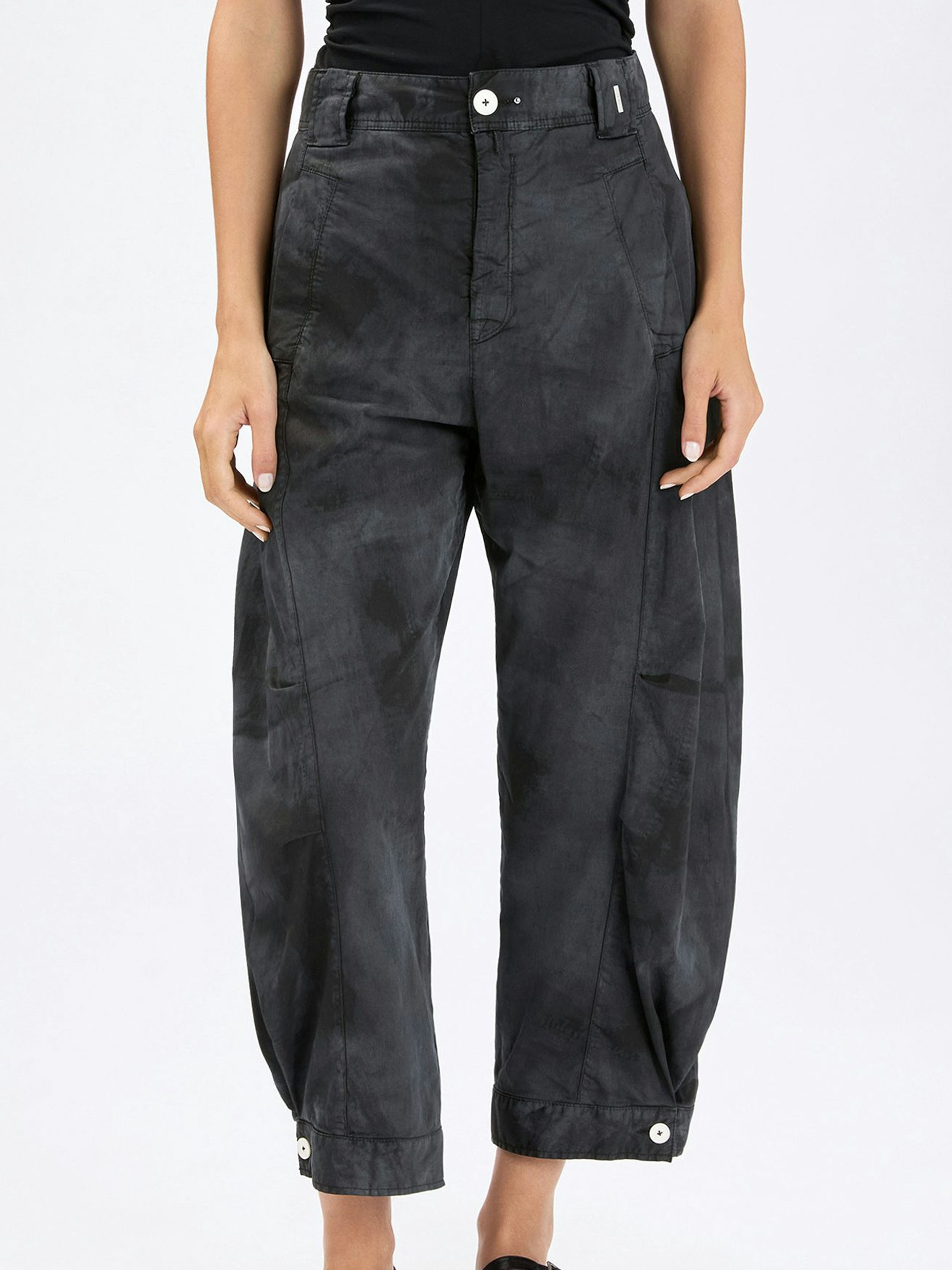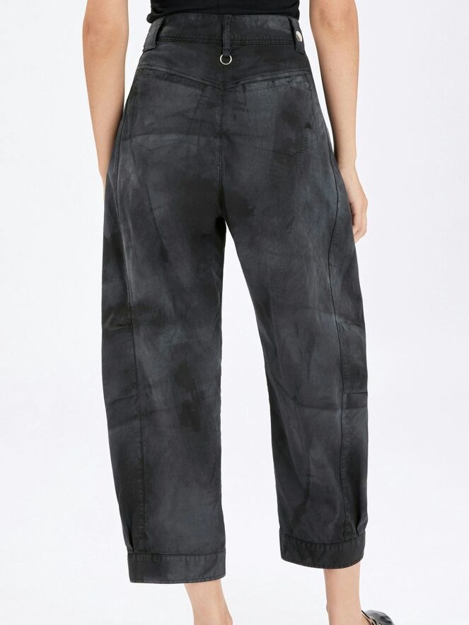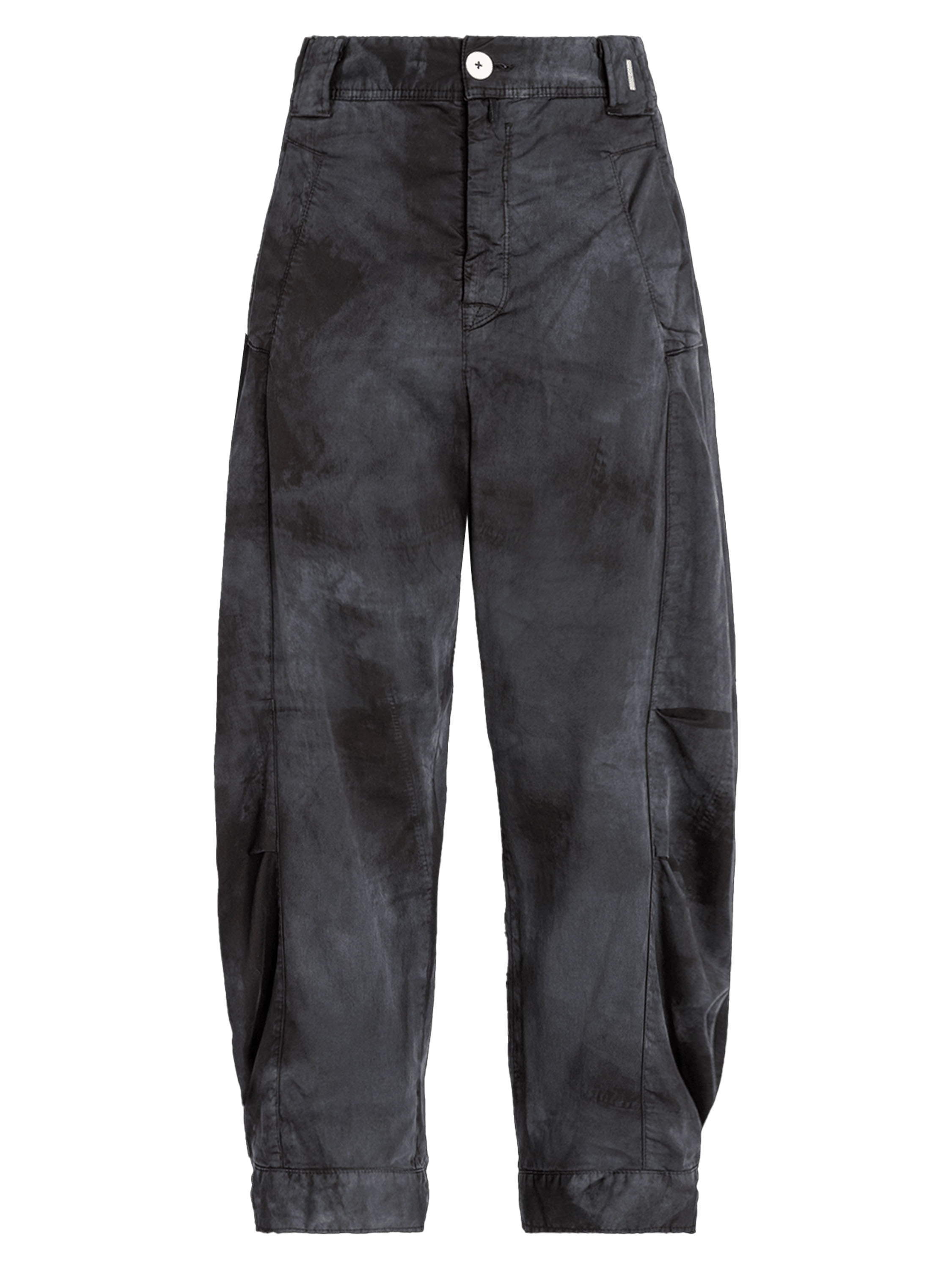 Hose von High in einem Ton-in-Ton Batik-Print. Kurze formgebende Nähte auf Kniehöhe modellieren die Silhouette dezent. Die Hosenbeine laufen zum Saum hin leicht schmal zu und sind mit einem dekorativen weißen Knopf am Abschluss versehen. Mit Eingrifftaschen ausgestattet, kann diese exklusive Designerhose bei 30 Grad gewaschen werden.