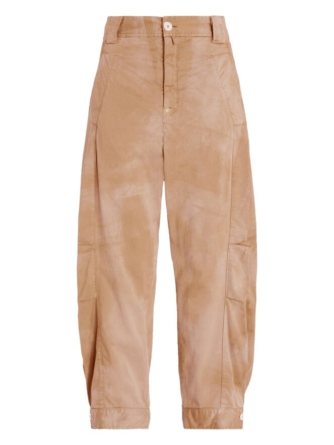 Eine Hose von High mit einem Ton-in-Ton batikartigen Print in verschiedenen mediterranen Rosttönen. Auf Kniehöhe sorgen kurze Abnäher für eine dezente Formgebung der Silhouette. Die Beine laufen nach unten leicht schmal zu und sind am Saum mit einem dekorativen weißen Knopf versehen. Die Hose verfügt über seitliche Eingrifftaschen und kann bei 30 Grad gewaschen werden.