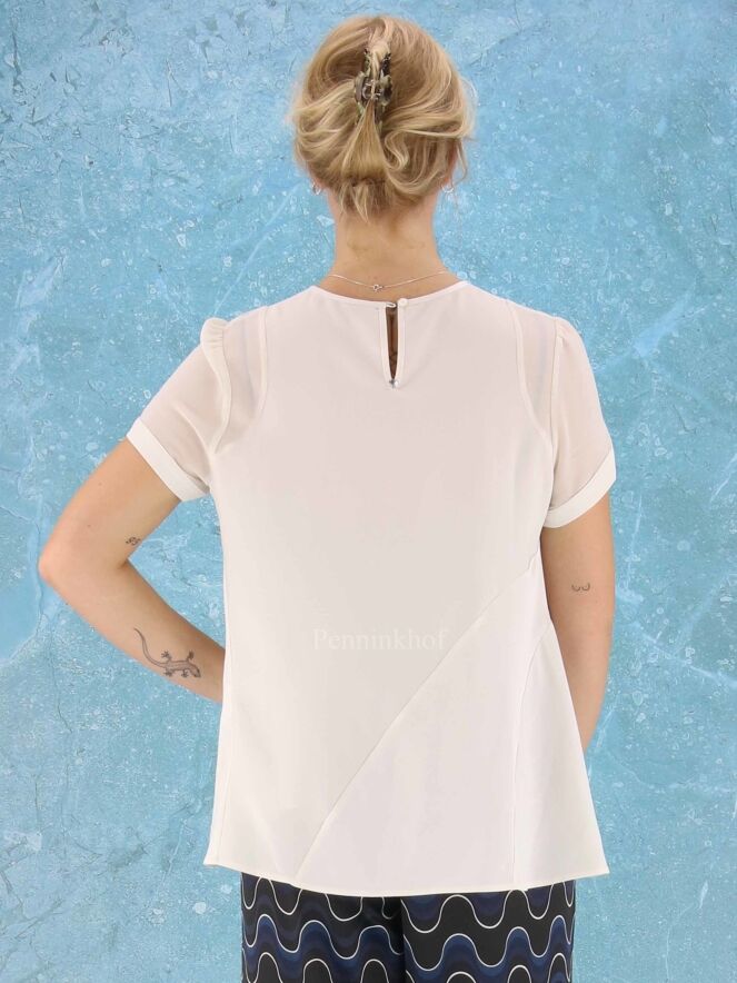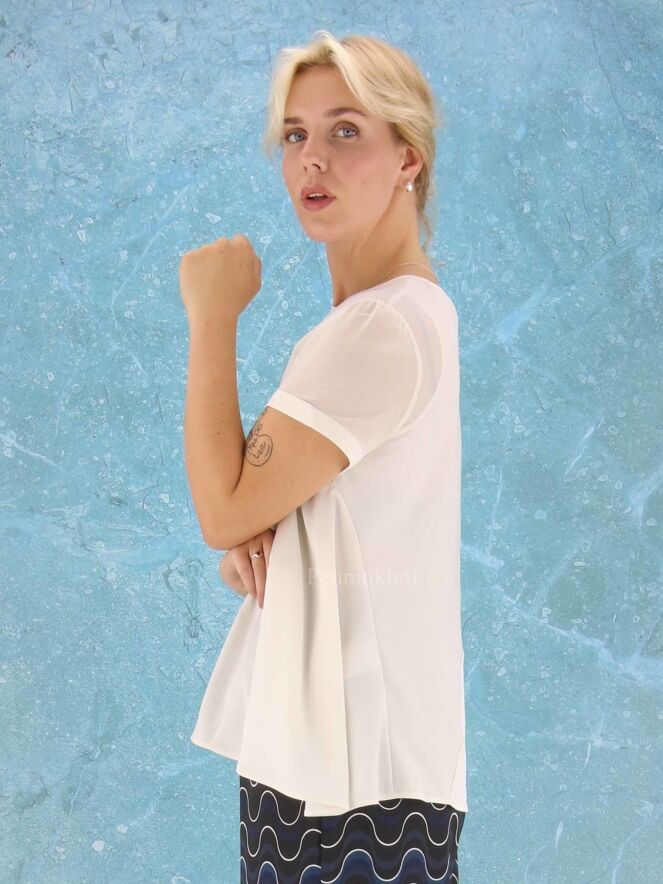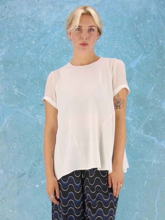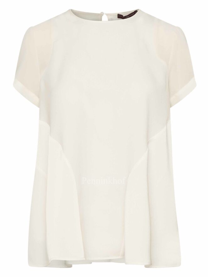 Ein Shirt aus Mattsatin der Designermarke High in zwei Cremeweiß-Tönen. Die kurzen Ärmel sind leicht transparent. Das Shirt hat eine breite A-Linie und kann von Hand gewaschen werden.