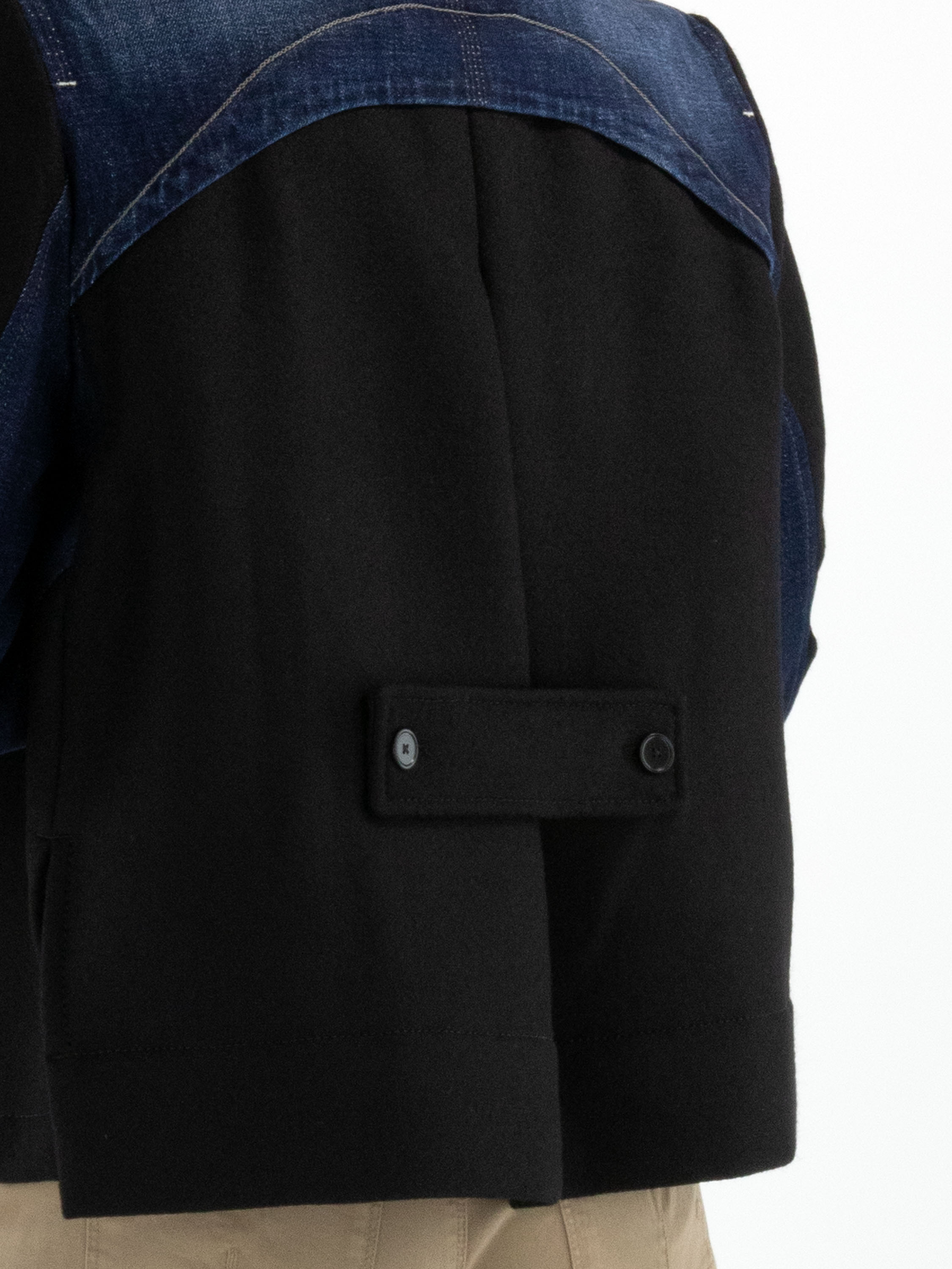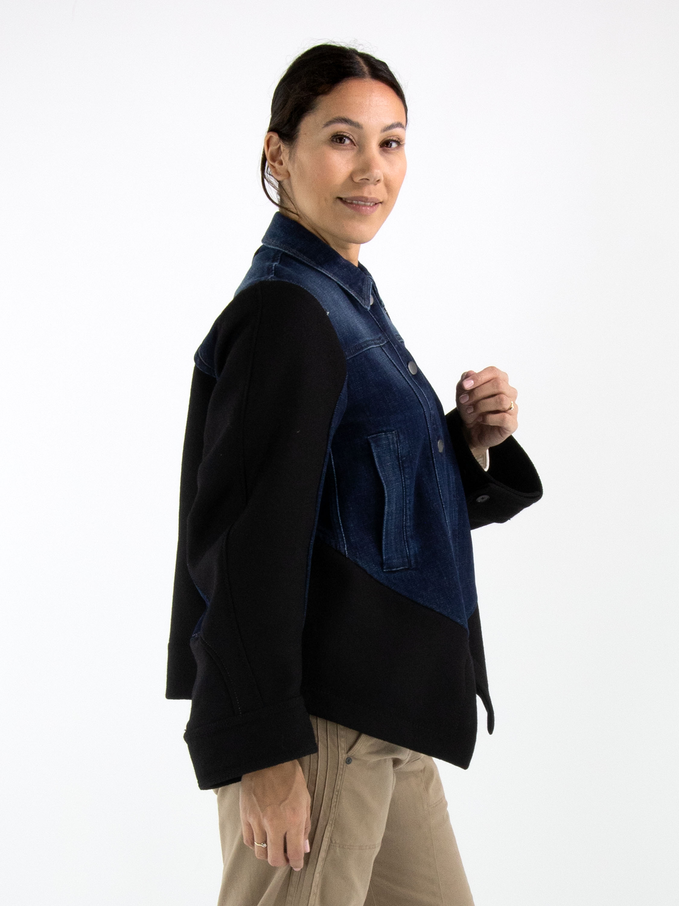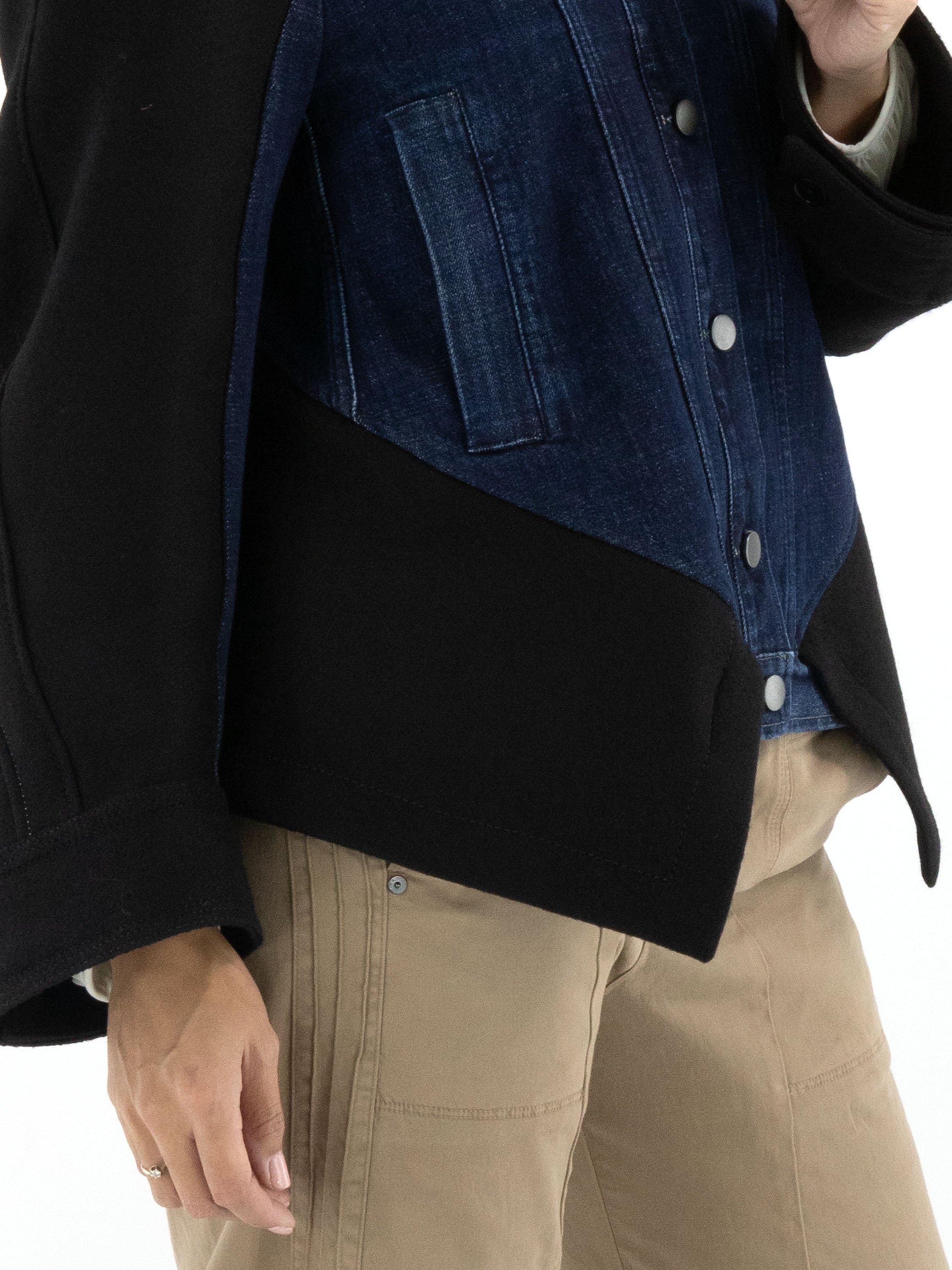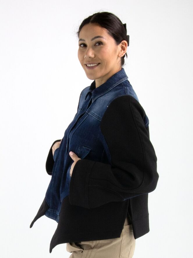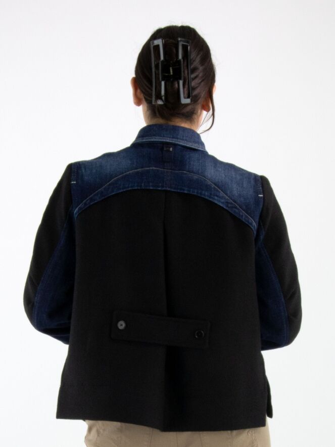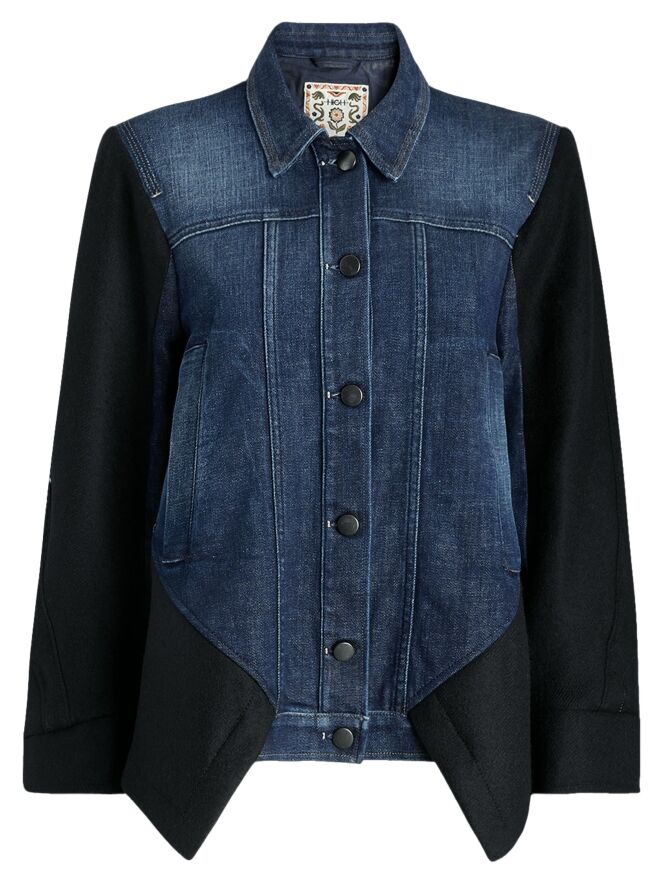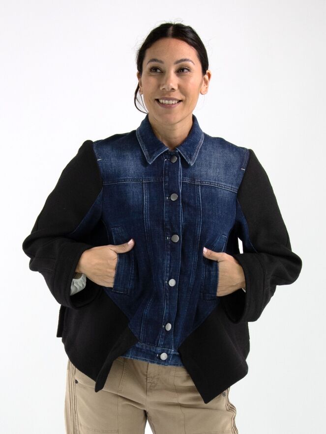 Ein Jeansblazer von High in Dark Denim, kombiniert mit edler gekochter Wolle am Rücken, am Saum und teilweise an den Ärmeln. Der Blazer hat einen Knopfverschluss und Eingrifftaschen auf Taillenhöhe. Dieser Blazer darf nicht gewaschen werden.