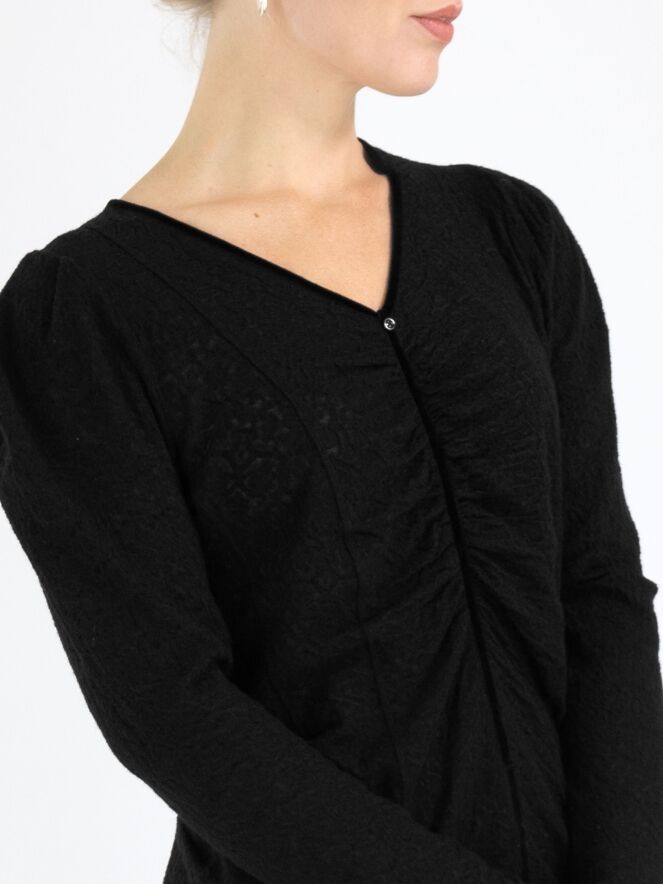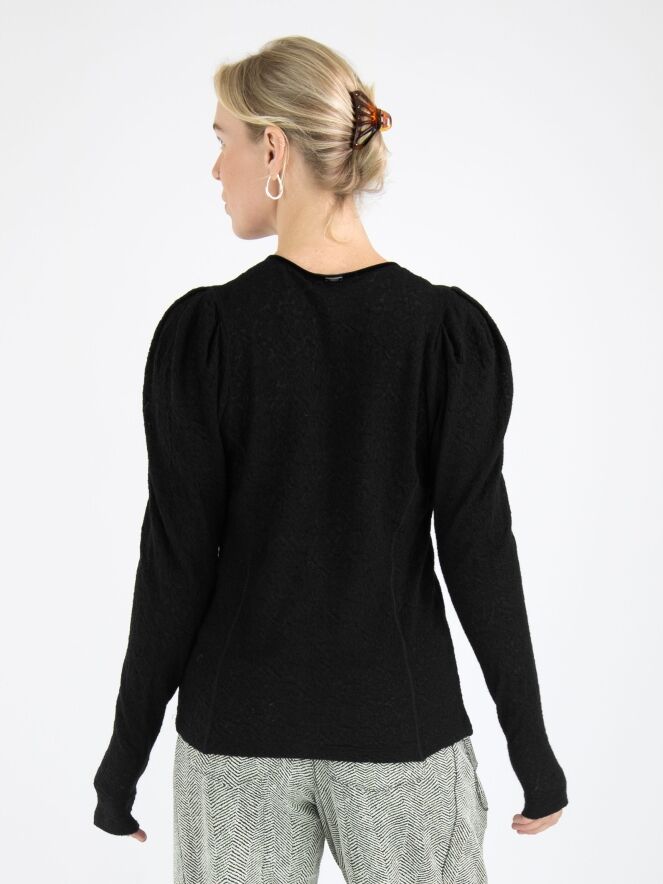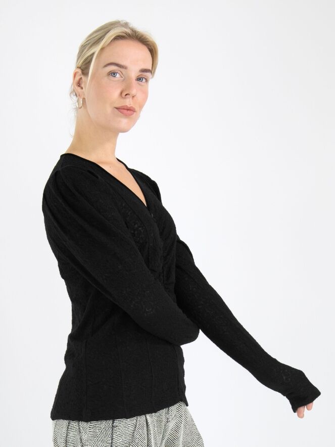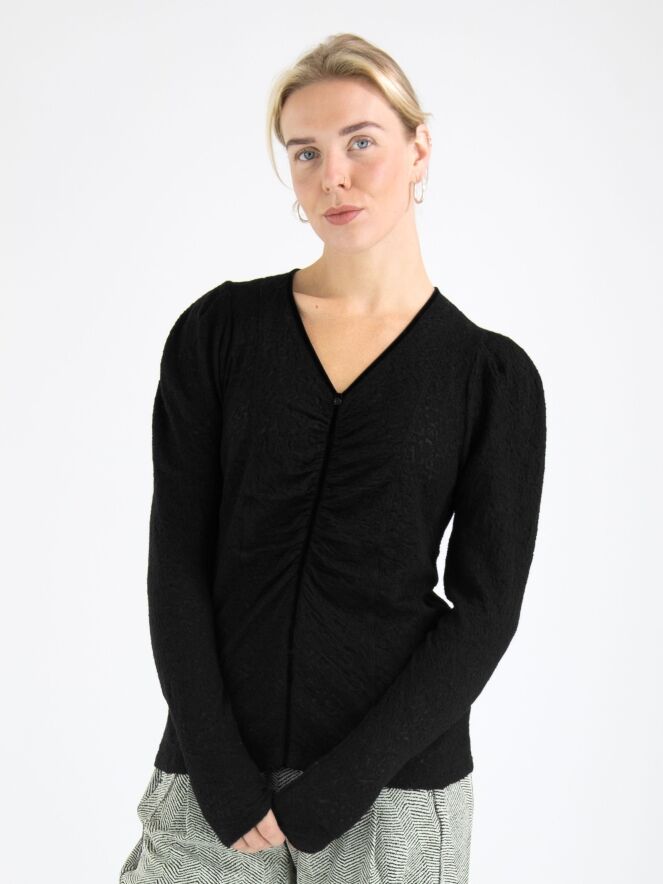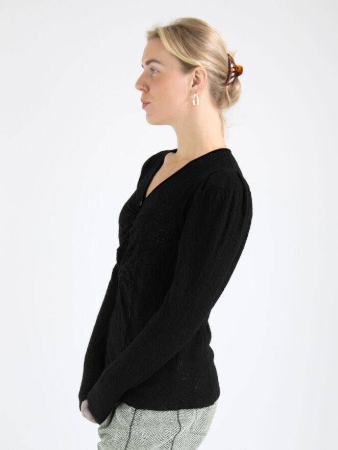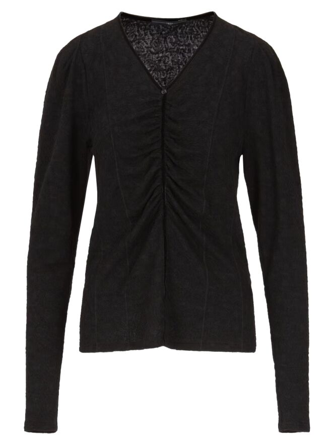 Ein leicht transparentes Shirt von High mit einer Reliefstruktur in Schwarz. Entlang des Randes des V-Ausschnitts befindet sich eine Samtborte, die vorne vom Mittelpunkt des V-Ausschnitts weiter nach unten verläuft. Entlang dieser Borte ist der Stoff fein gefaltet. Dieses Shirt kann von Hand gewaschen werden.