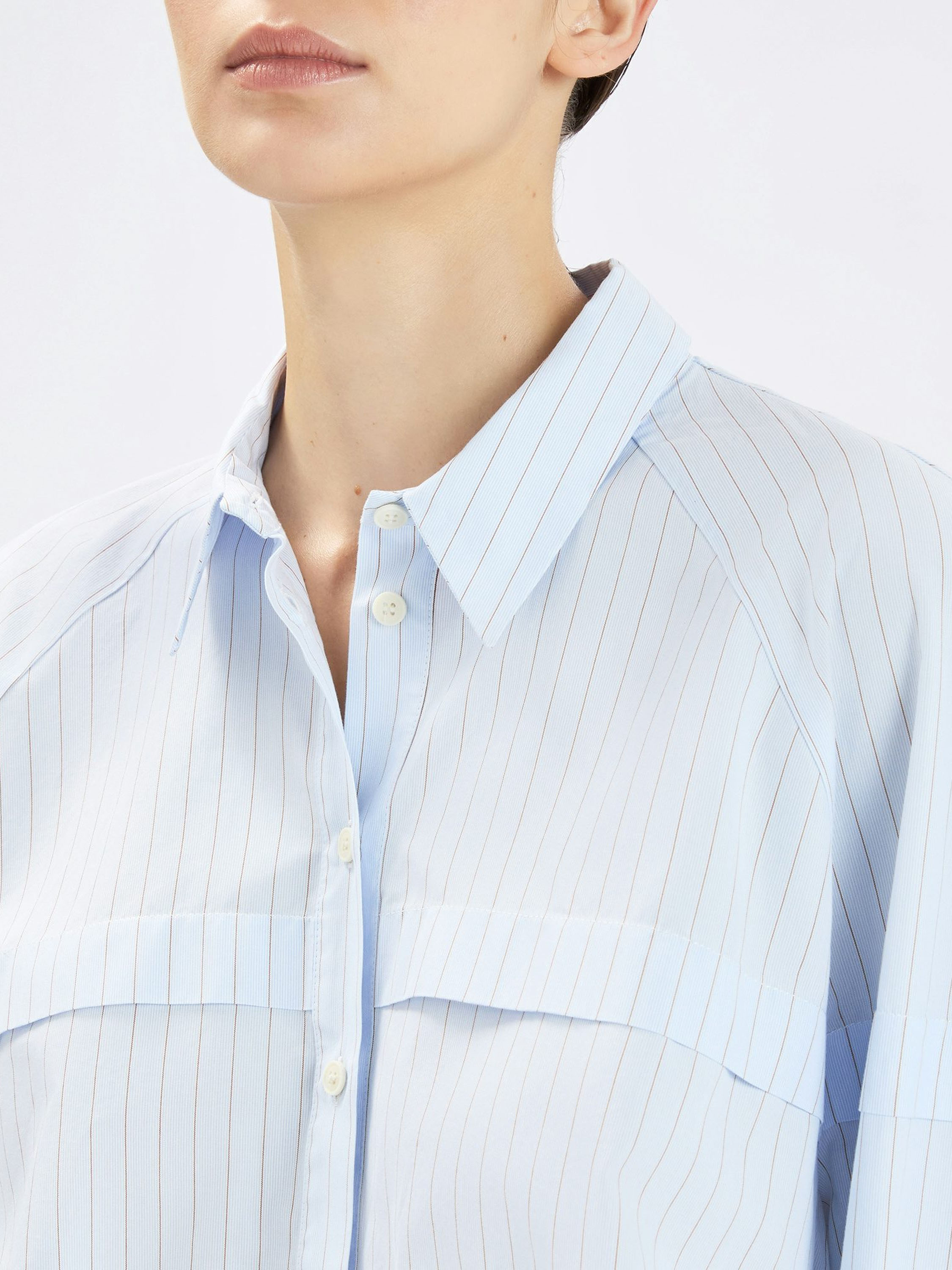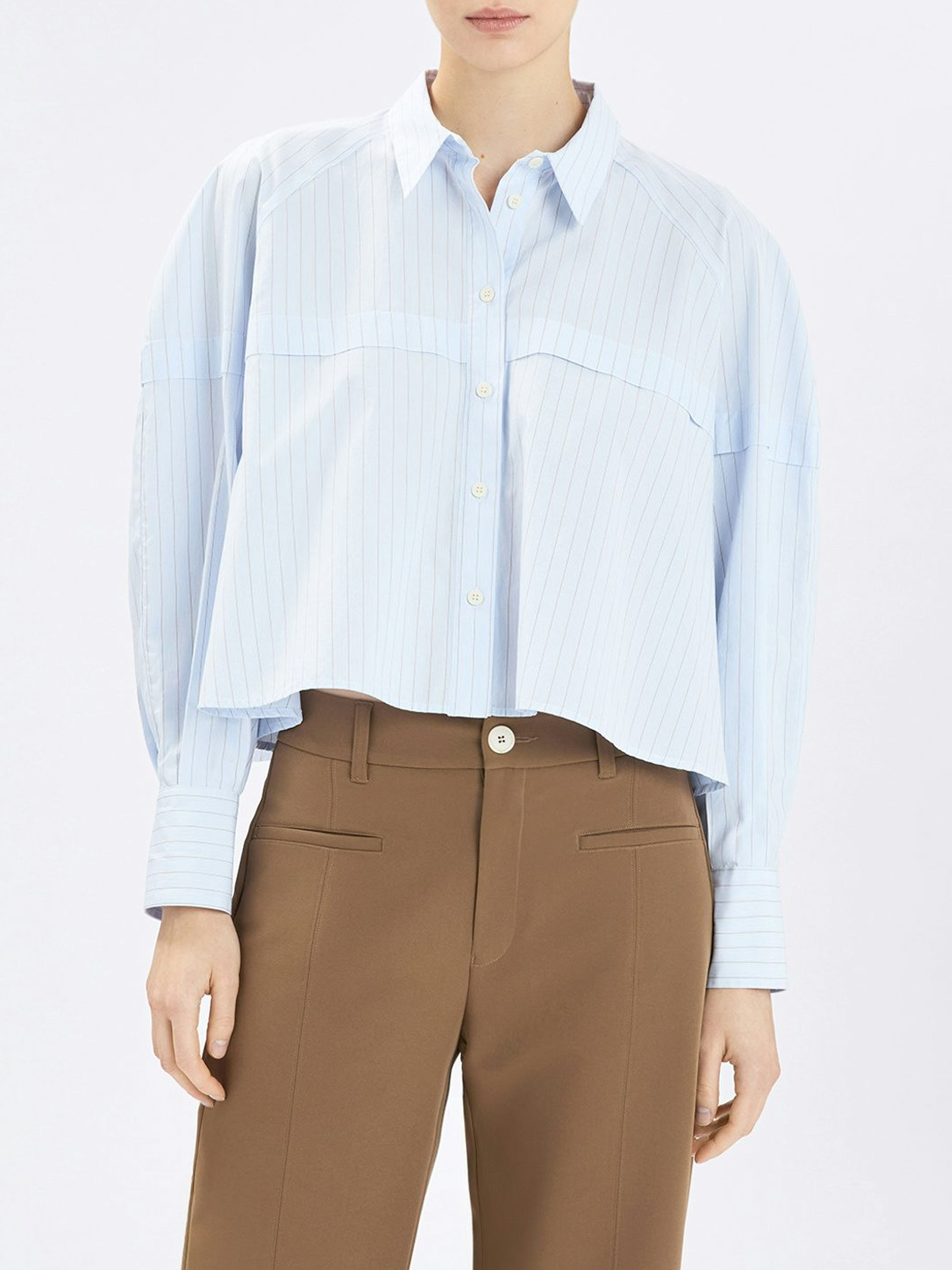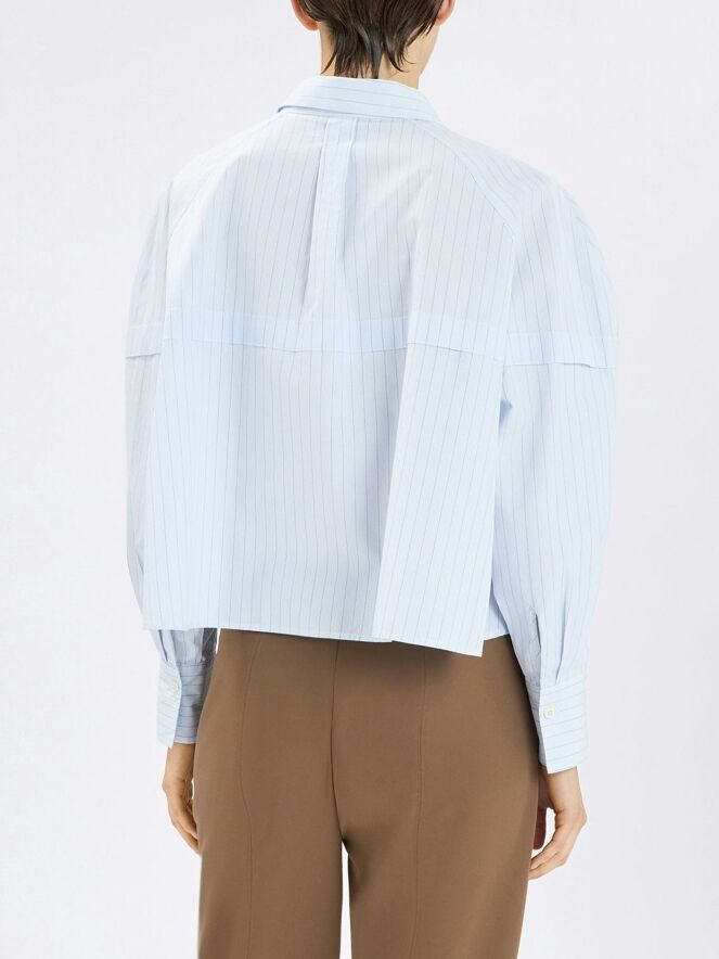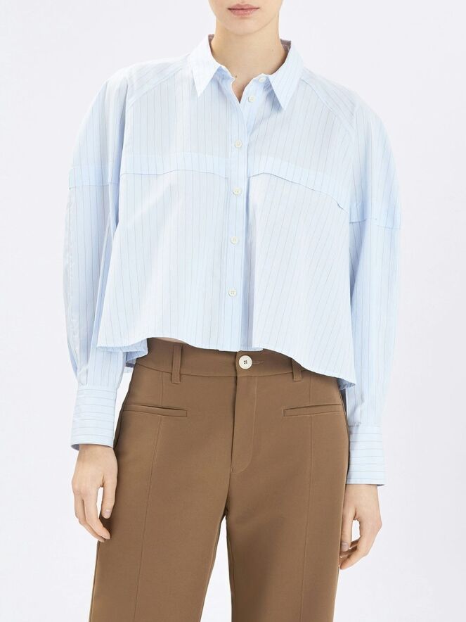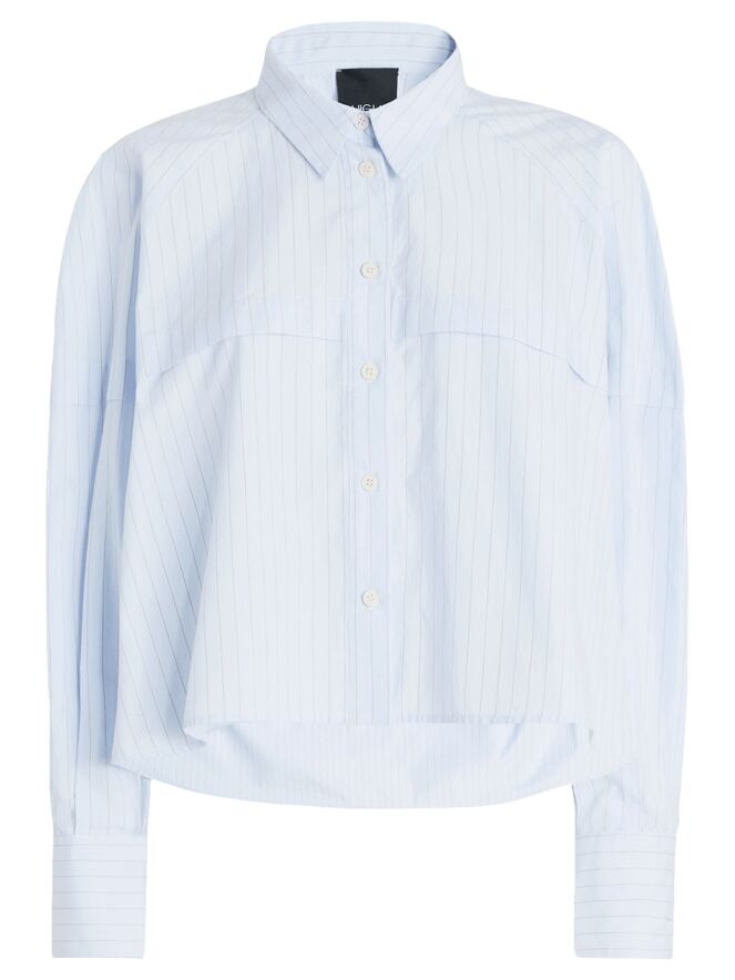 Kurze, weit geschnittene Bluse von High in einem edlen Nadelstreifenmuster in Hellblau mit Cognac. Knapp oberhalb der Brust verläuft eine Naht mit Überlappungsdetail, das sich über die Ärmel bis zur Rückseite fortsetzt und einen dezenten, architektonischen Effekt erzeugt. Diese exklusive Designerbluse kann bei 30 Grad gewaschen werden.