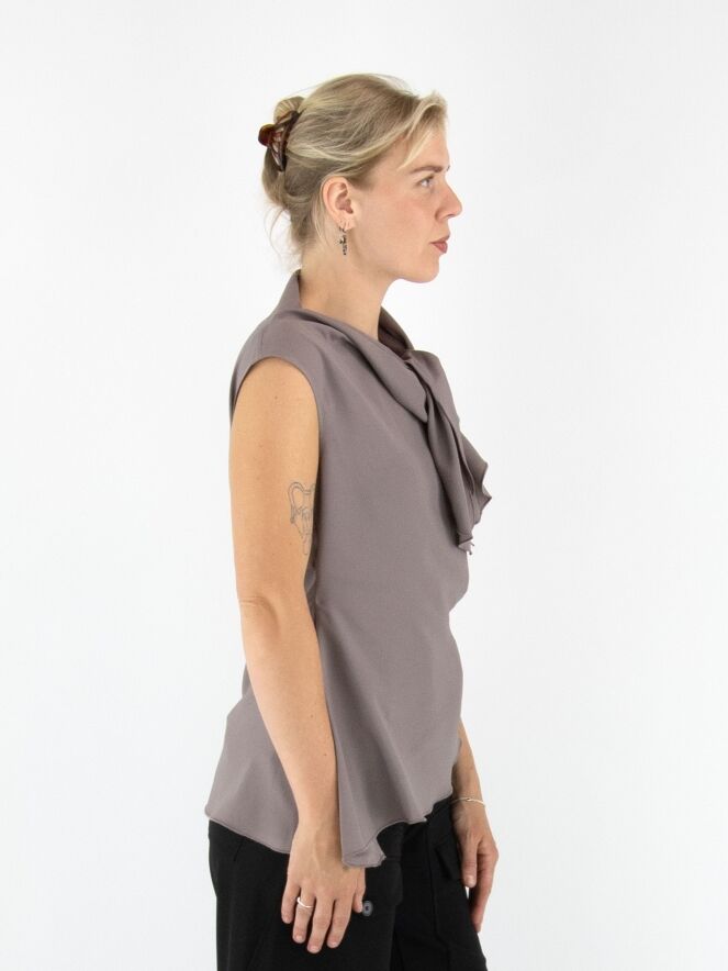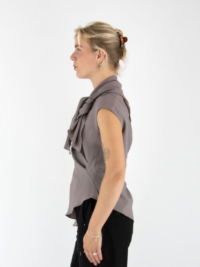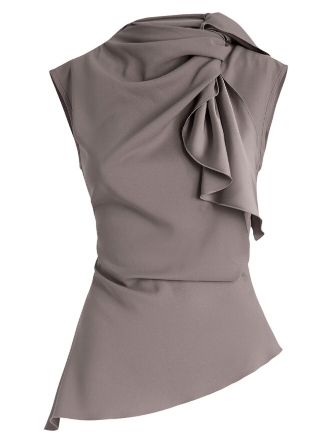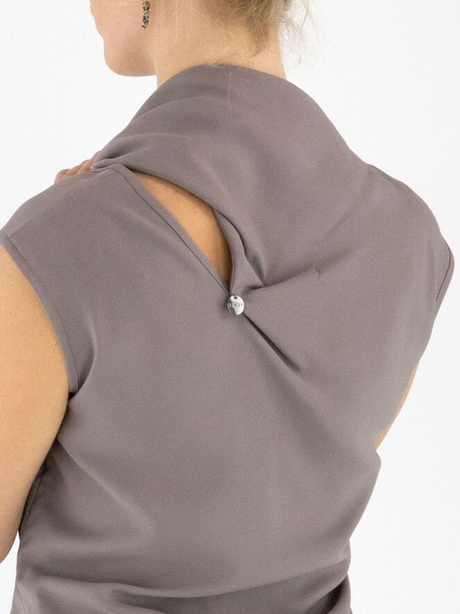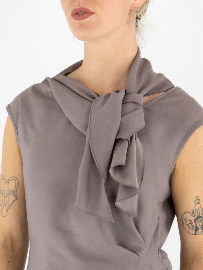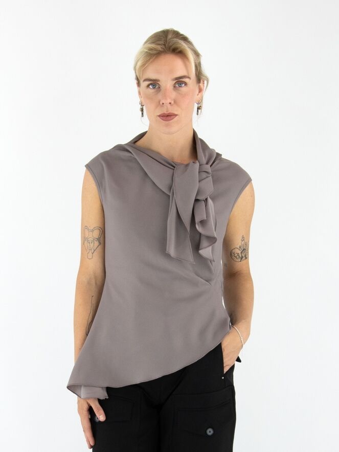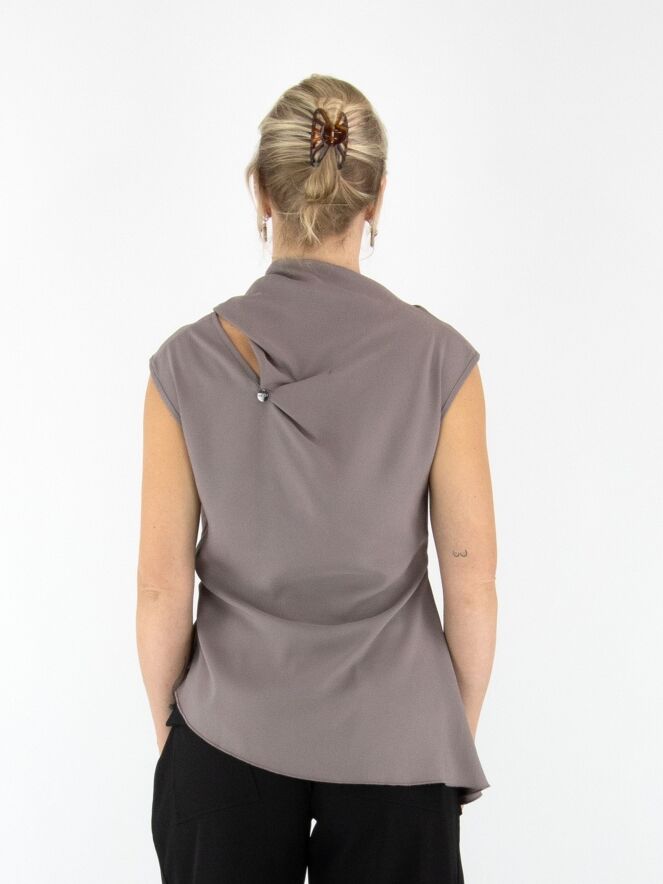 A top by High in grey. Both the front and back feature a double layer of fabric extending from the right shoulder to the centre, revealing part of the matte satin reverse along the V-neckline. On the left side at the waist, a gathered detail creates a draped effect. This top can be washed at 30 degrees.
