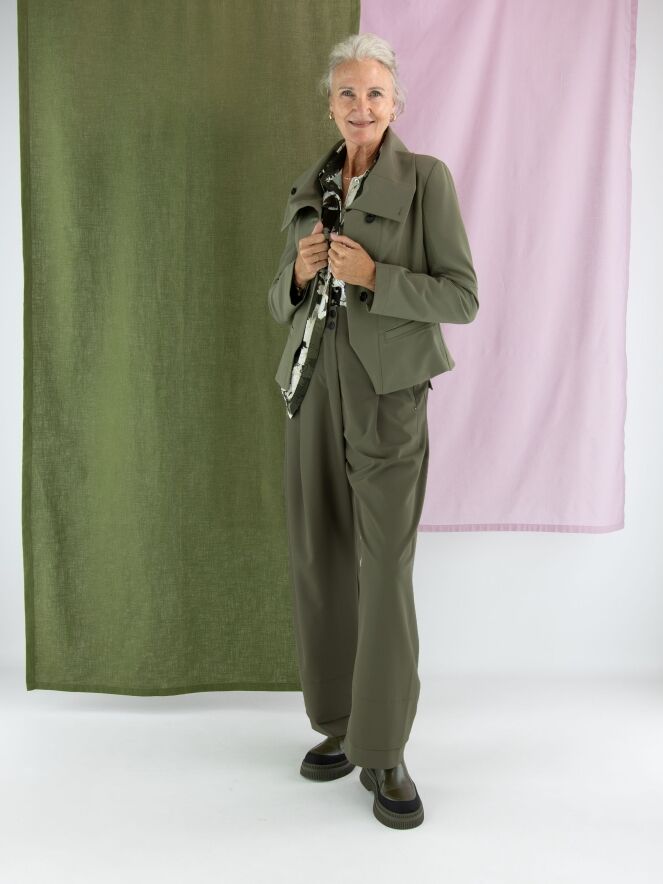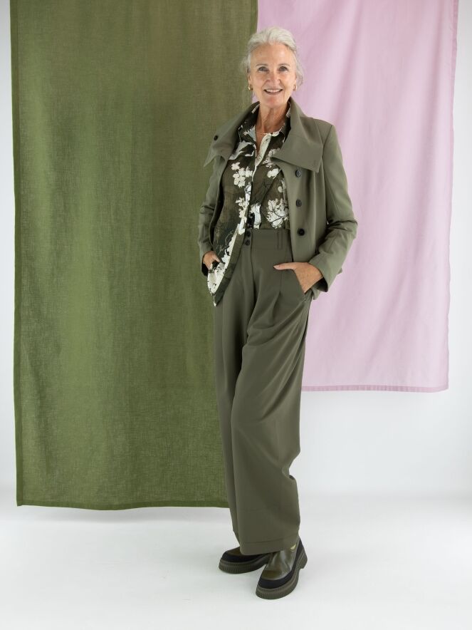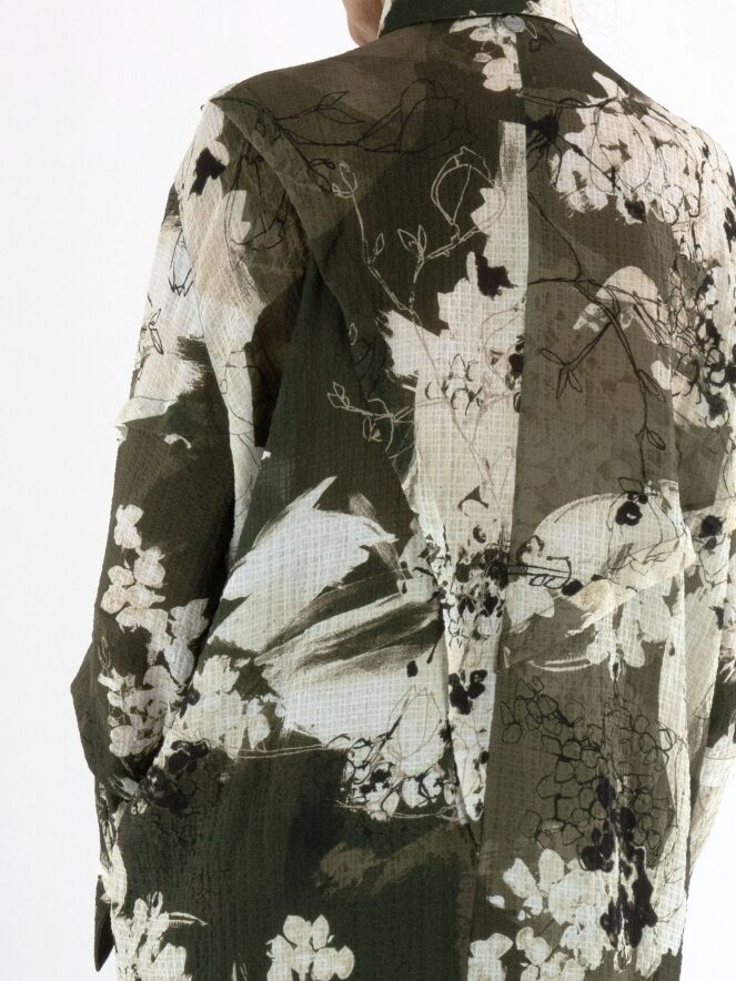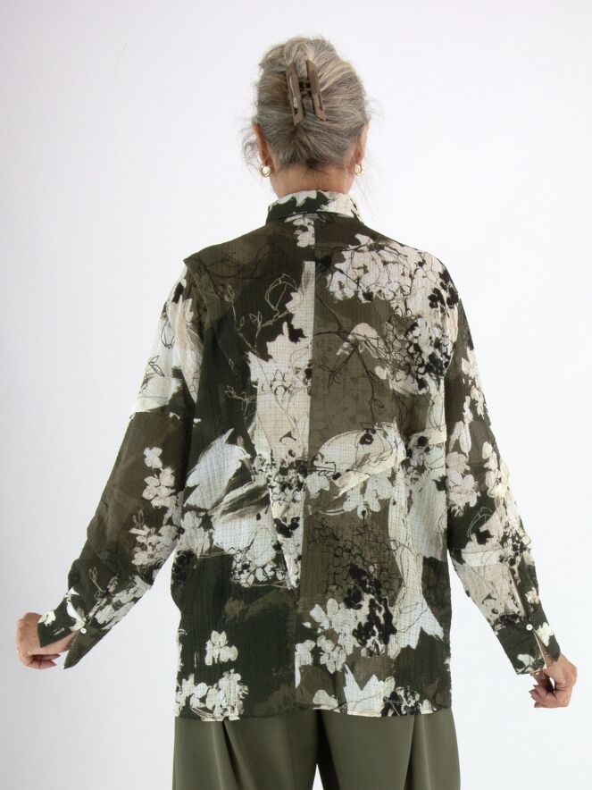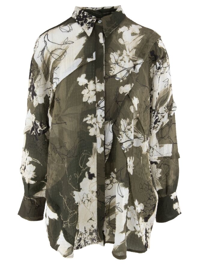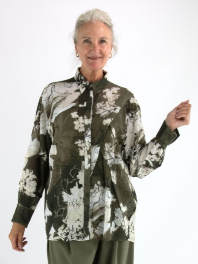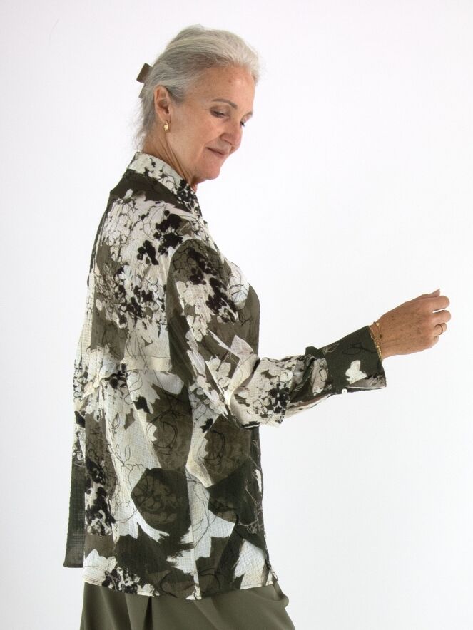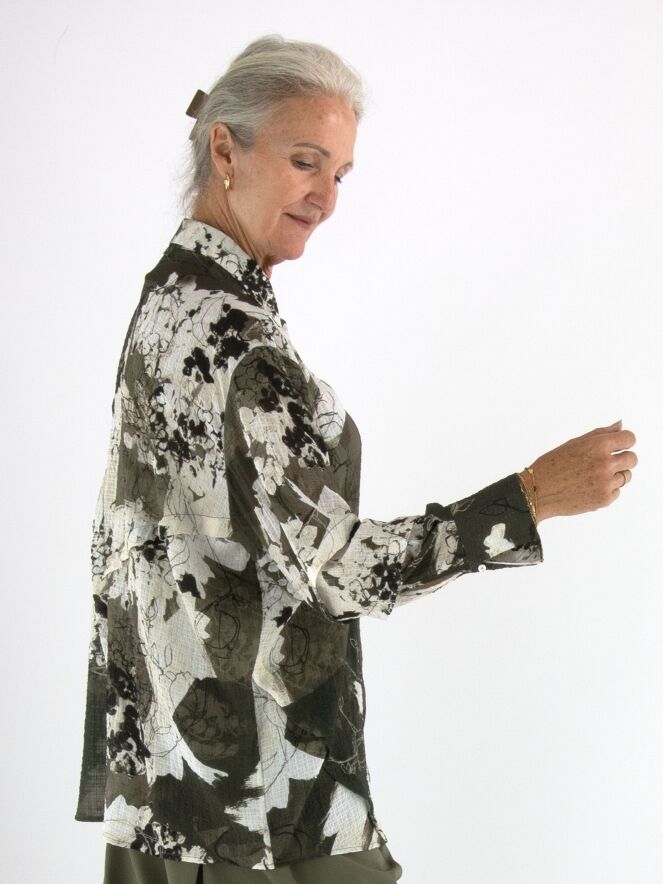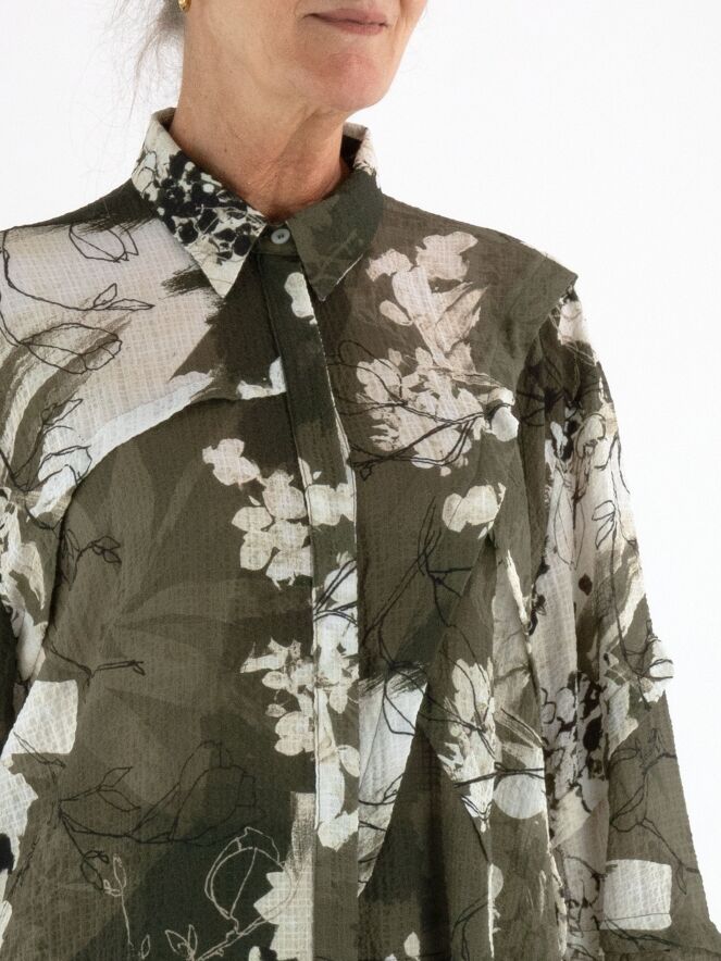 Eine Crêpebluse von High mit einem grafischen Muster in Olivgrün, Cremeweiß und Schwarz. Die Bluse hat an mehreren Stellen dekorative Nähte mit überlappenden Blenden. Sie hat eine verdeckte Knopfleiste und sollte per Hand gewaschen werden.