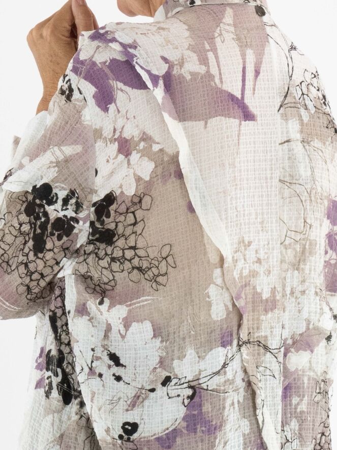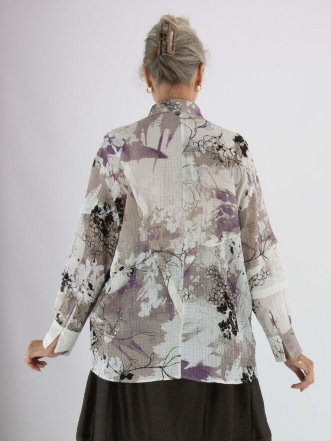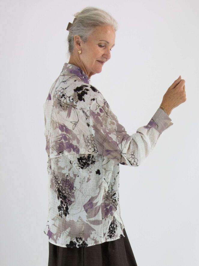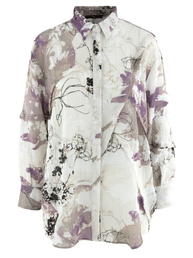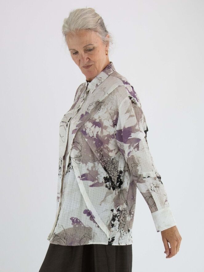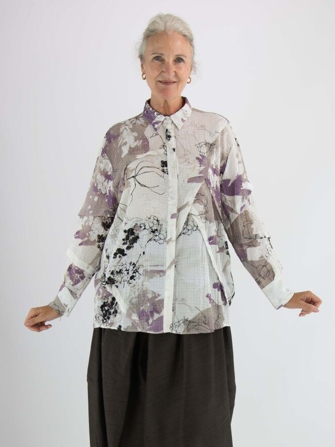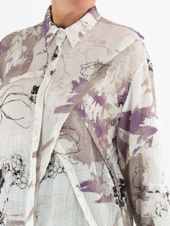 Eine Crêpe-Bluse von High mit einem grafischen Print in den Farben Flieder, Mauve, Off-White und Schwarz. Die Bluse ist an mehreren Stellen mit dekorativen Ziernähten und überlappenden Blenden entlang der Nähte versehen. Sie hat eine verdeckte Knopfleiste und sollte von Hand gewaschen werden.