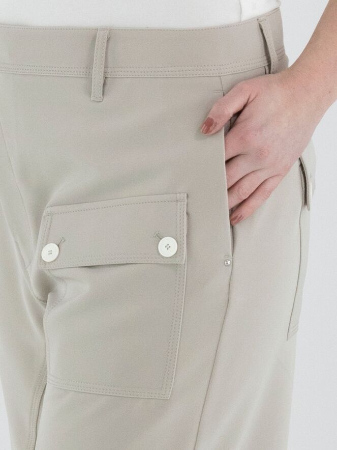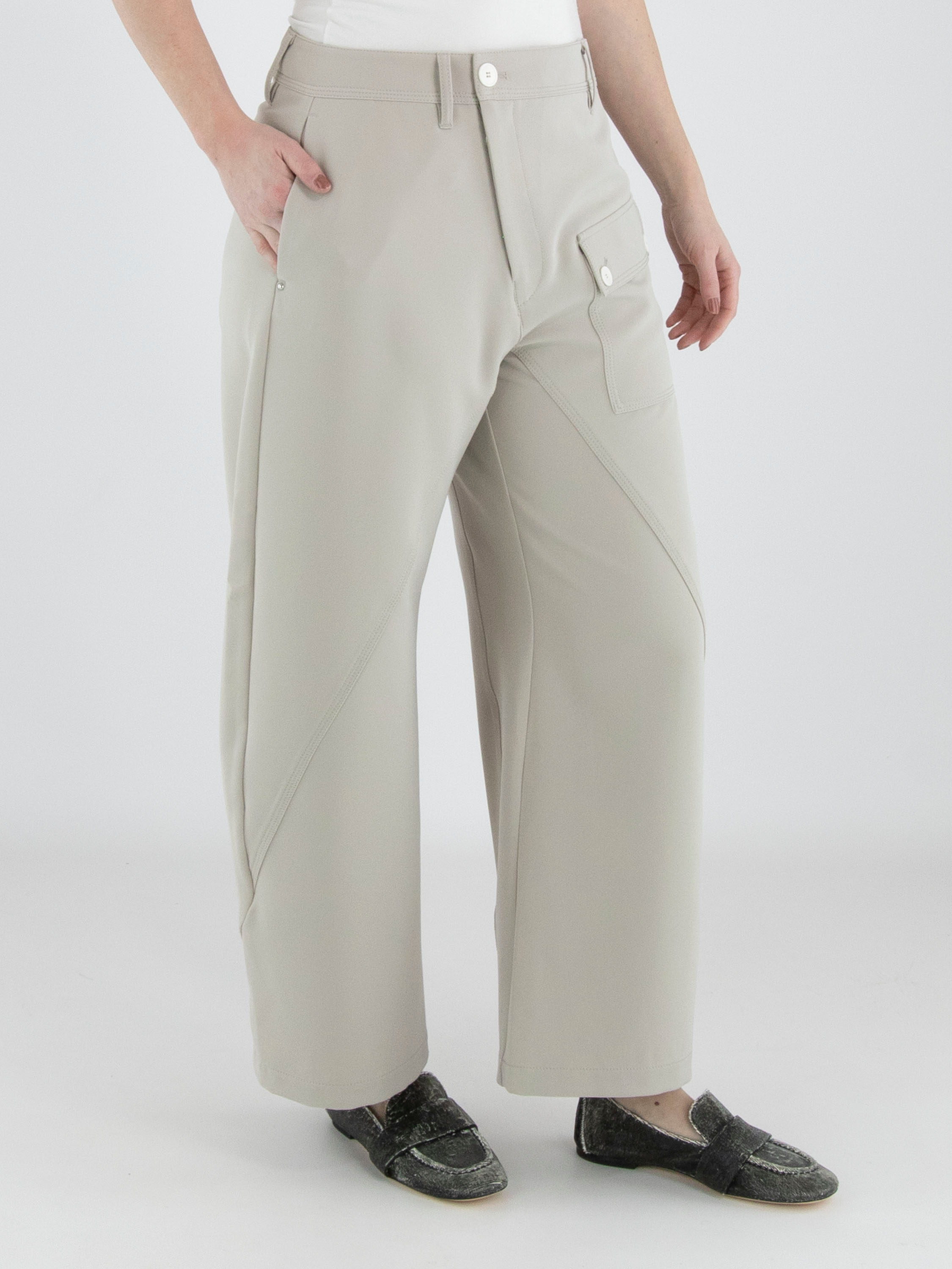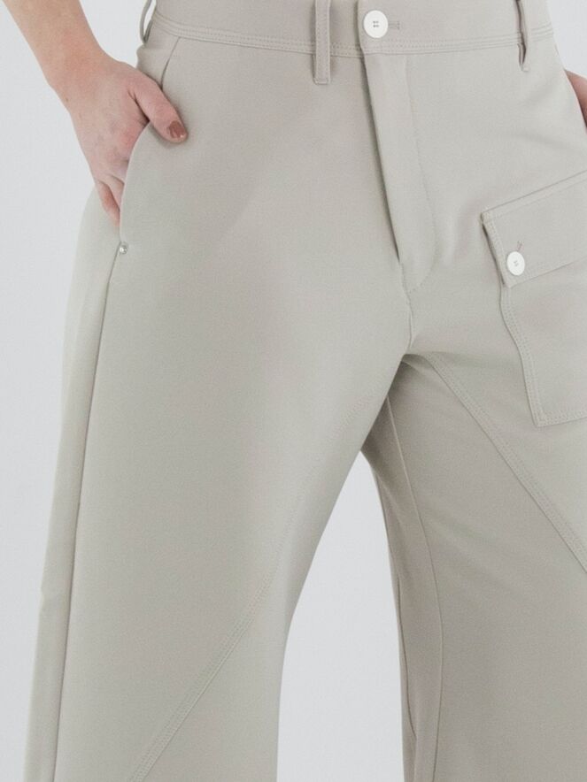 Eine Hose von High in Beige. Die Hose hat einen diagonalen Reißverschluss. Am unteren Rand der Eingrifftaschen ist ein silberfarbener Stud angebracht. Am linken Oberschenkel befindet sich eine Tasche. Auf der Vorderseite verläuft eine dekorative diagonale Naht. Diese Hose kann per Hand gewaschen werden.