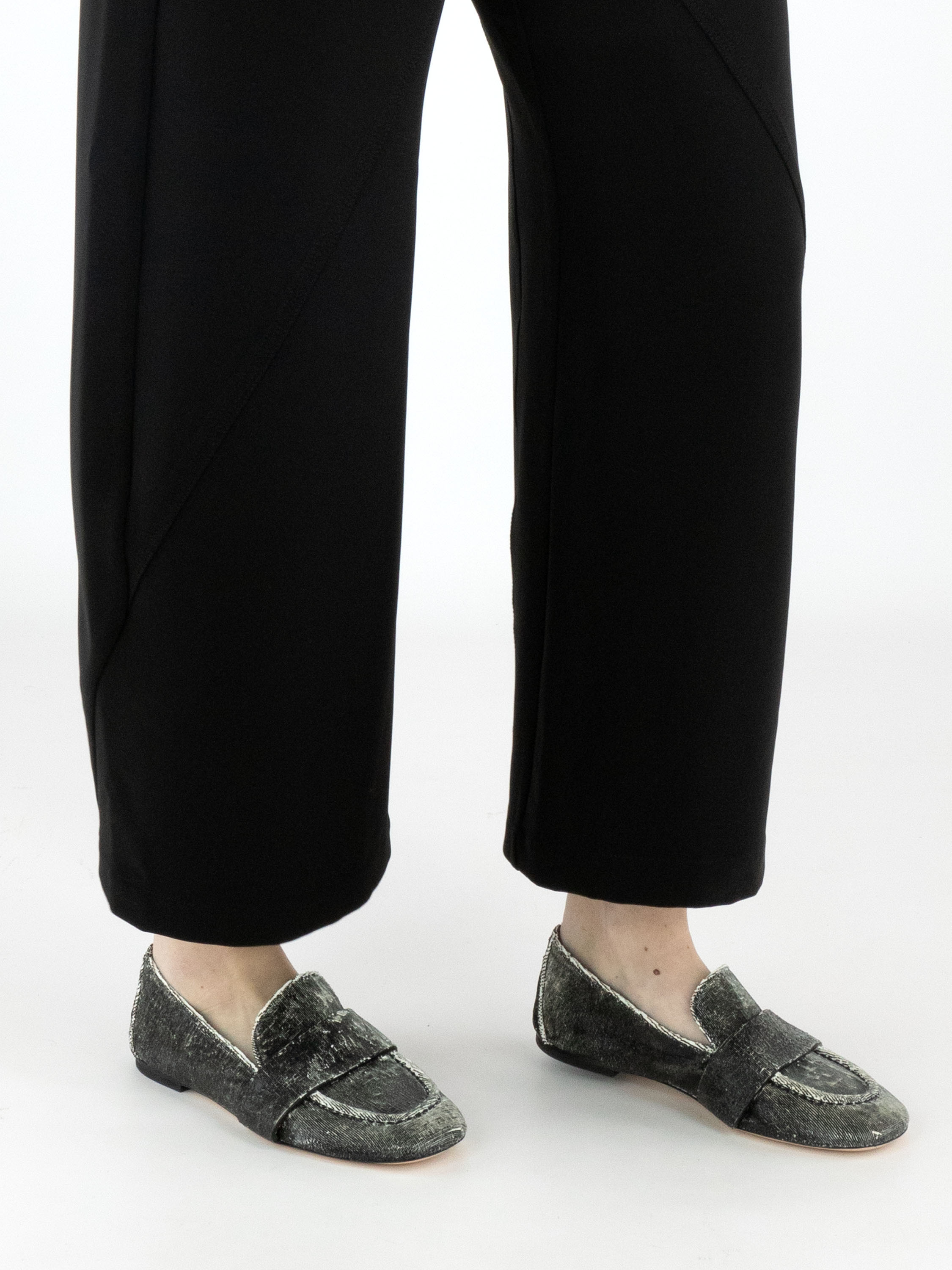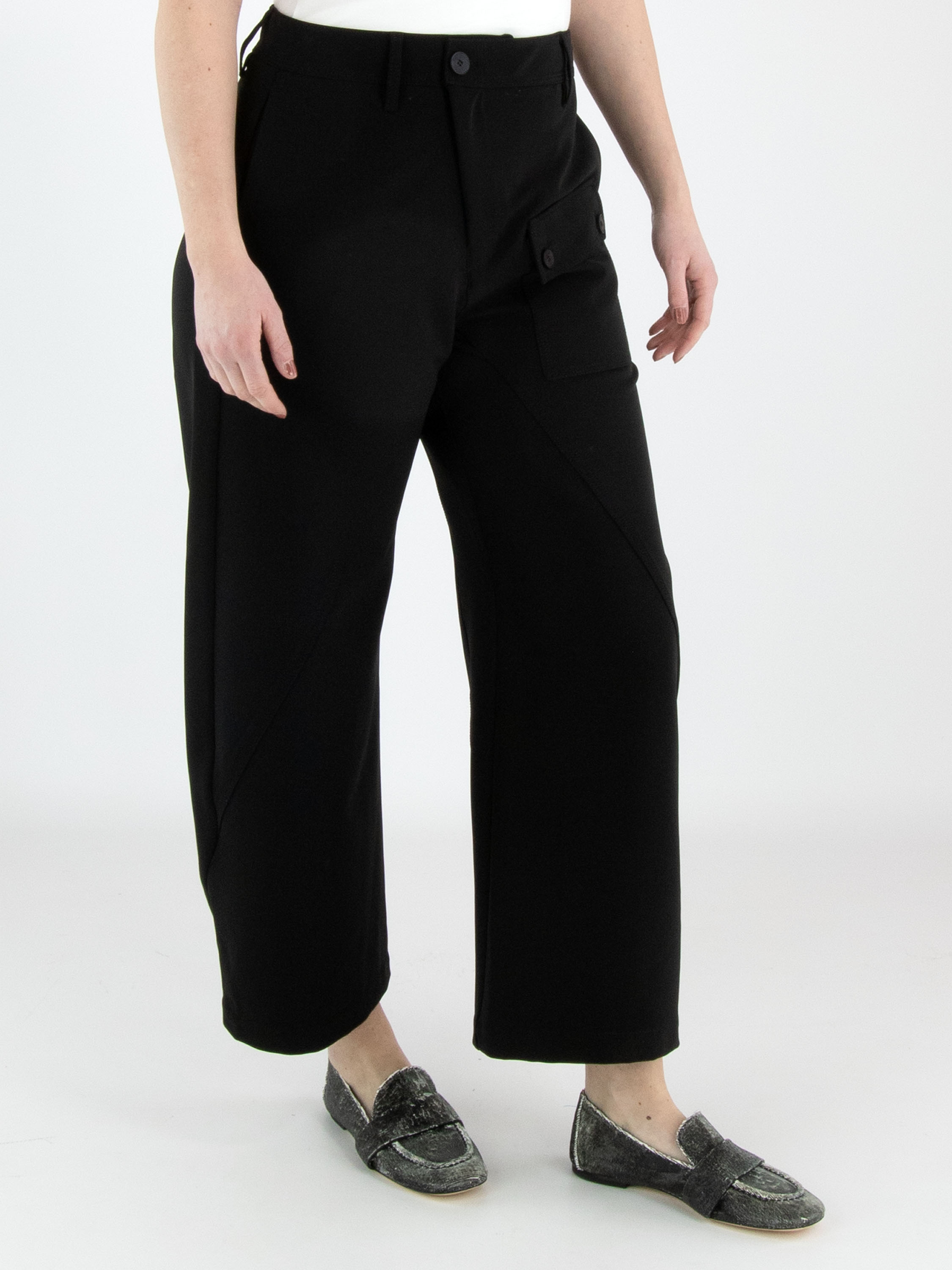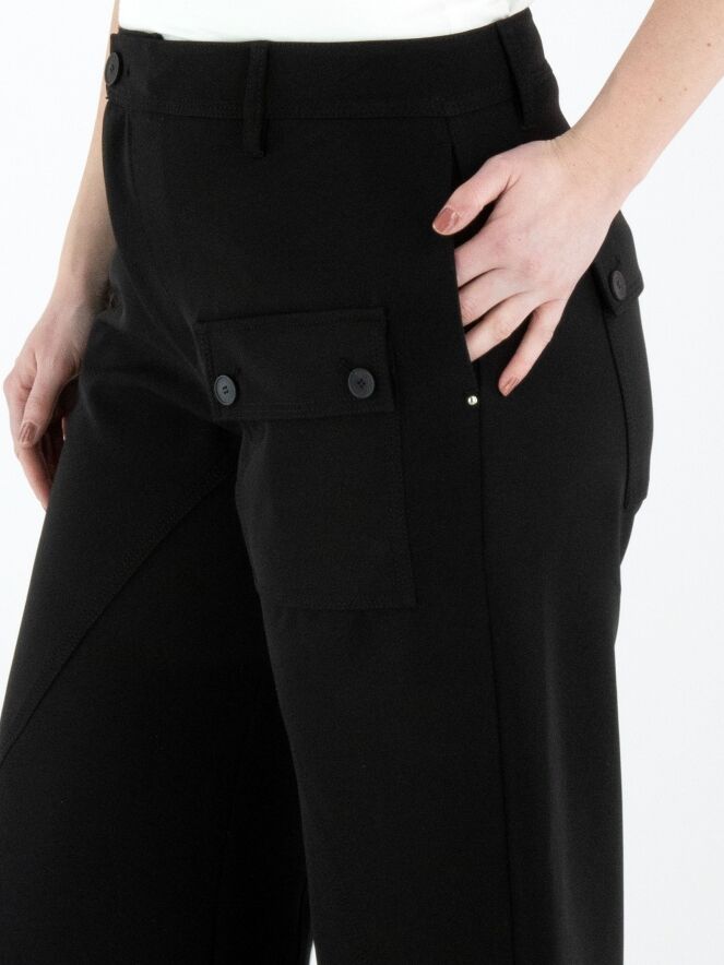 Eine Hose von High in Schwarz. Die Hose hat einen diagonalen Reißverschluss. Am unteren Rand der Eingrifftaschen ist ein silberfarbener Stud angebracht. Am linken Oberschenkel befindet sich eine Tasche. Auf der Vorderseite verläuft eine dekorative diagonale Naht. Diese Hose kann per Hand gewaschen werden.