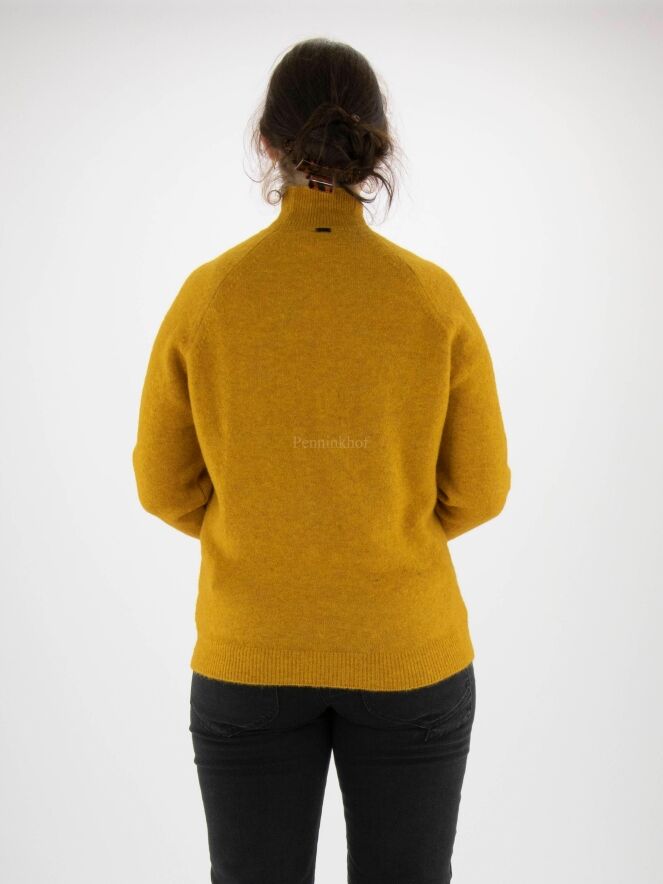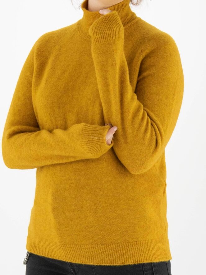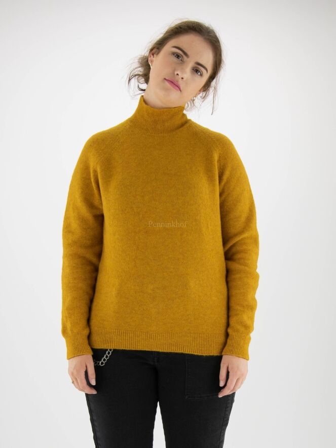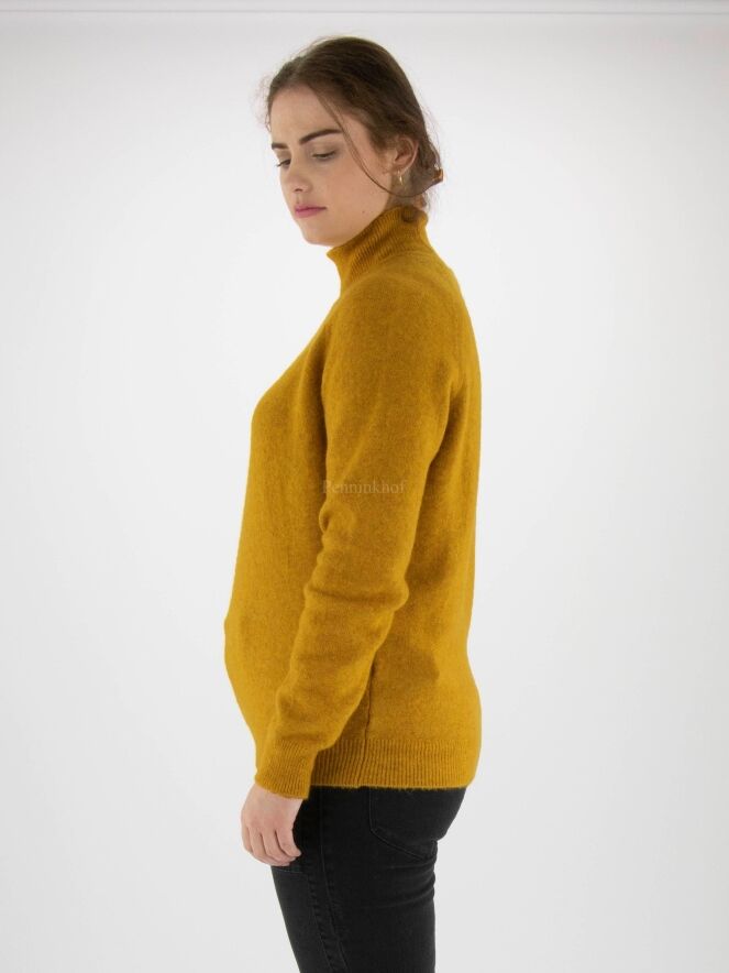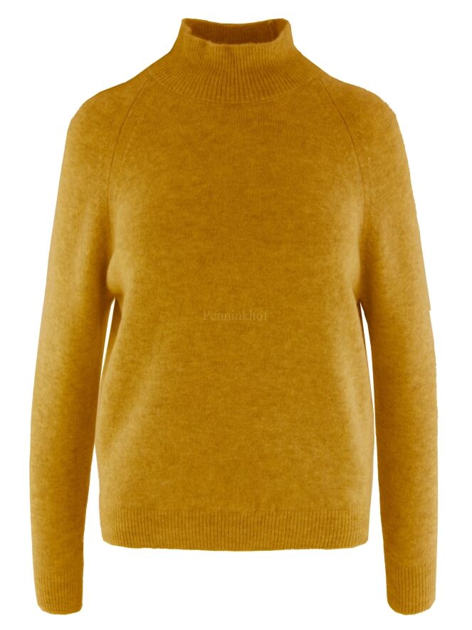 Ein hochwertiger, etwas melierter Pullover der Designermarke High in Ockergelb. Der Turtleneck-Kragen hat eine weiche Rippenstruktur, die sich am unteren Saum des Pullovers wiederholt. Dieser Pullover darf von Hand gewaschen werden.