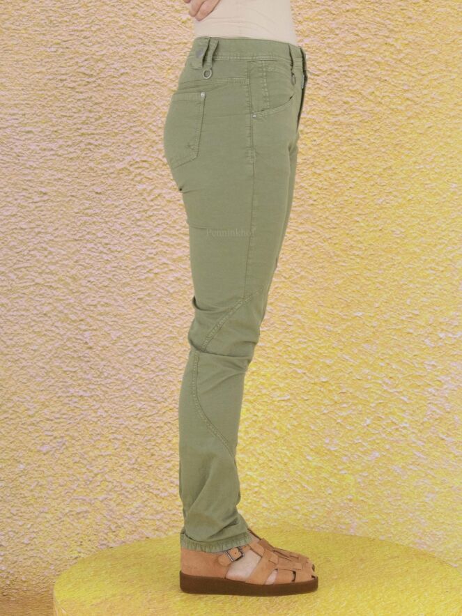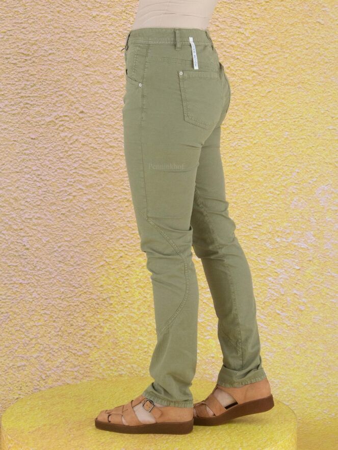 Eine schmale Hose der Designermarke High in Olivgrün. Die Hose ist mit einigen diagonalen Steppnähten versehen. Diese Hose kann bei 30 Grad gewaschen werden.