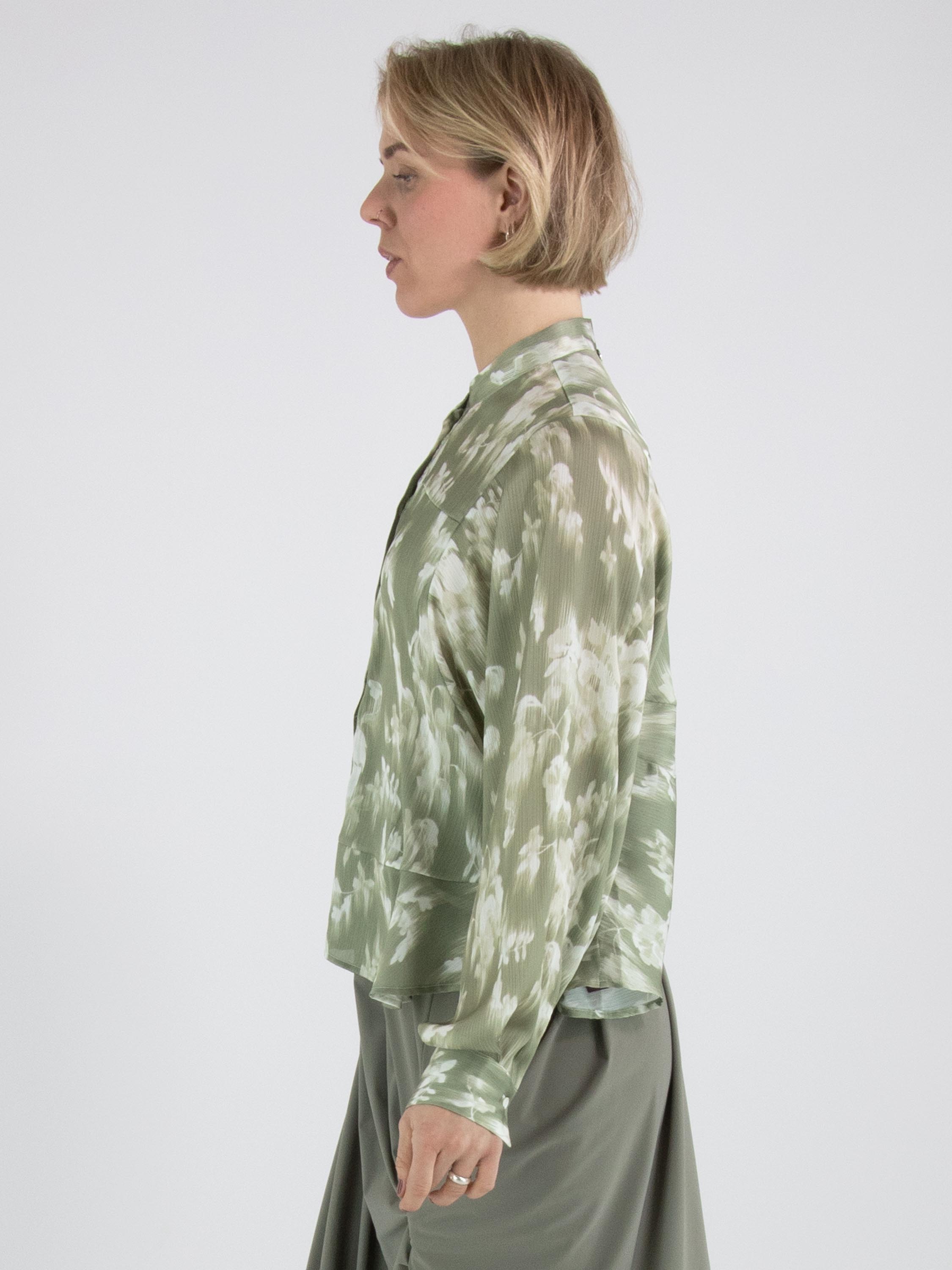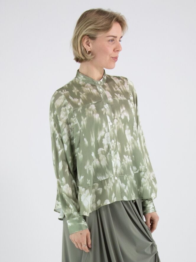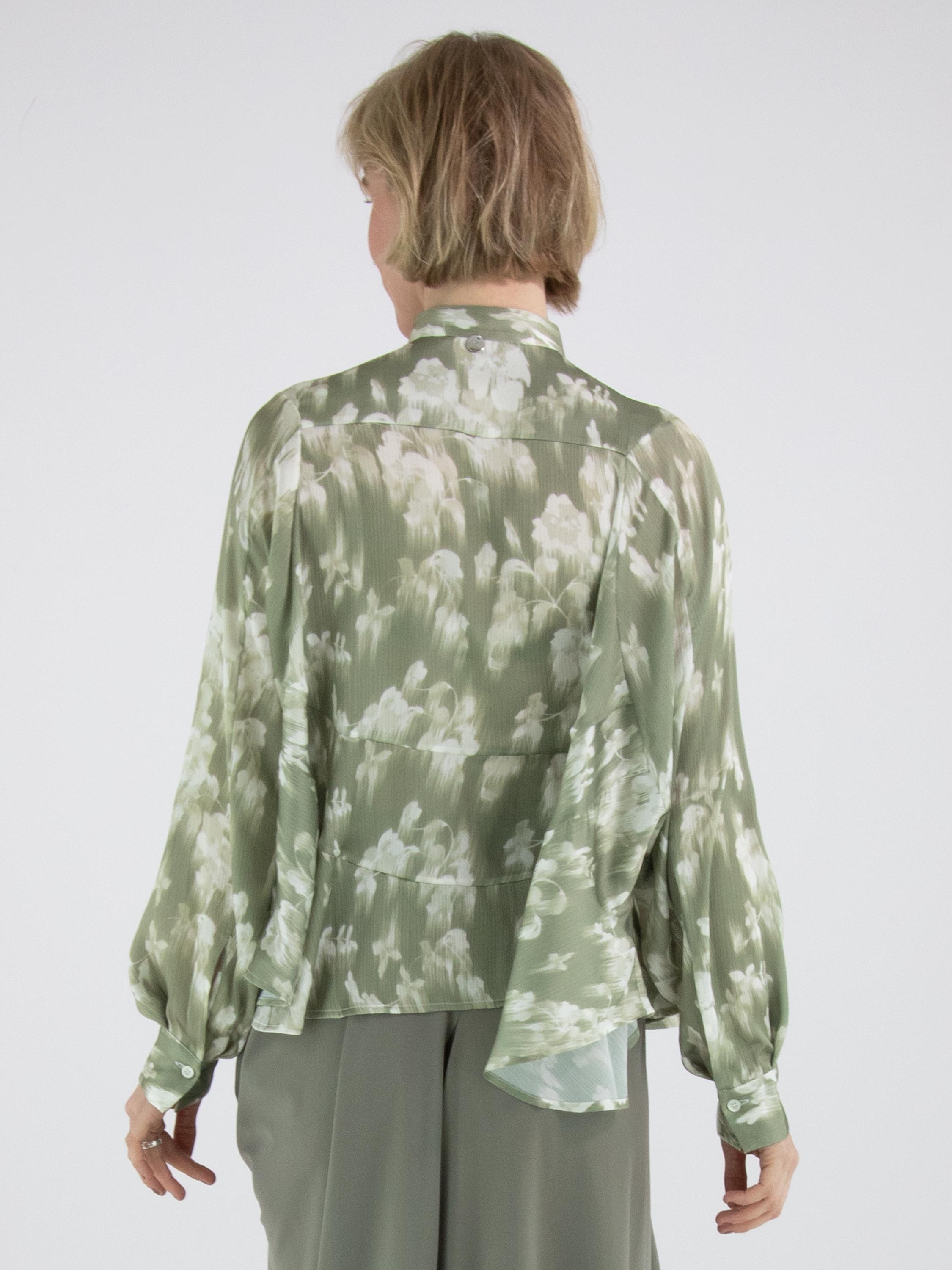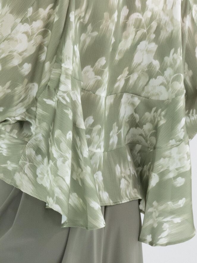 Eine leicht transparente Bluse von High mit einem verwischten Blumenprint in mehreren Olivgrün- und Weißtönen. Die Bluse hat Fledermausärmel und oberhalb der Brust eine Naht. Der Saum ist leicht wellenförmig gearbeitet. Diese Bluse kann per Hand gewaschen werden.