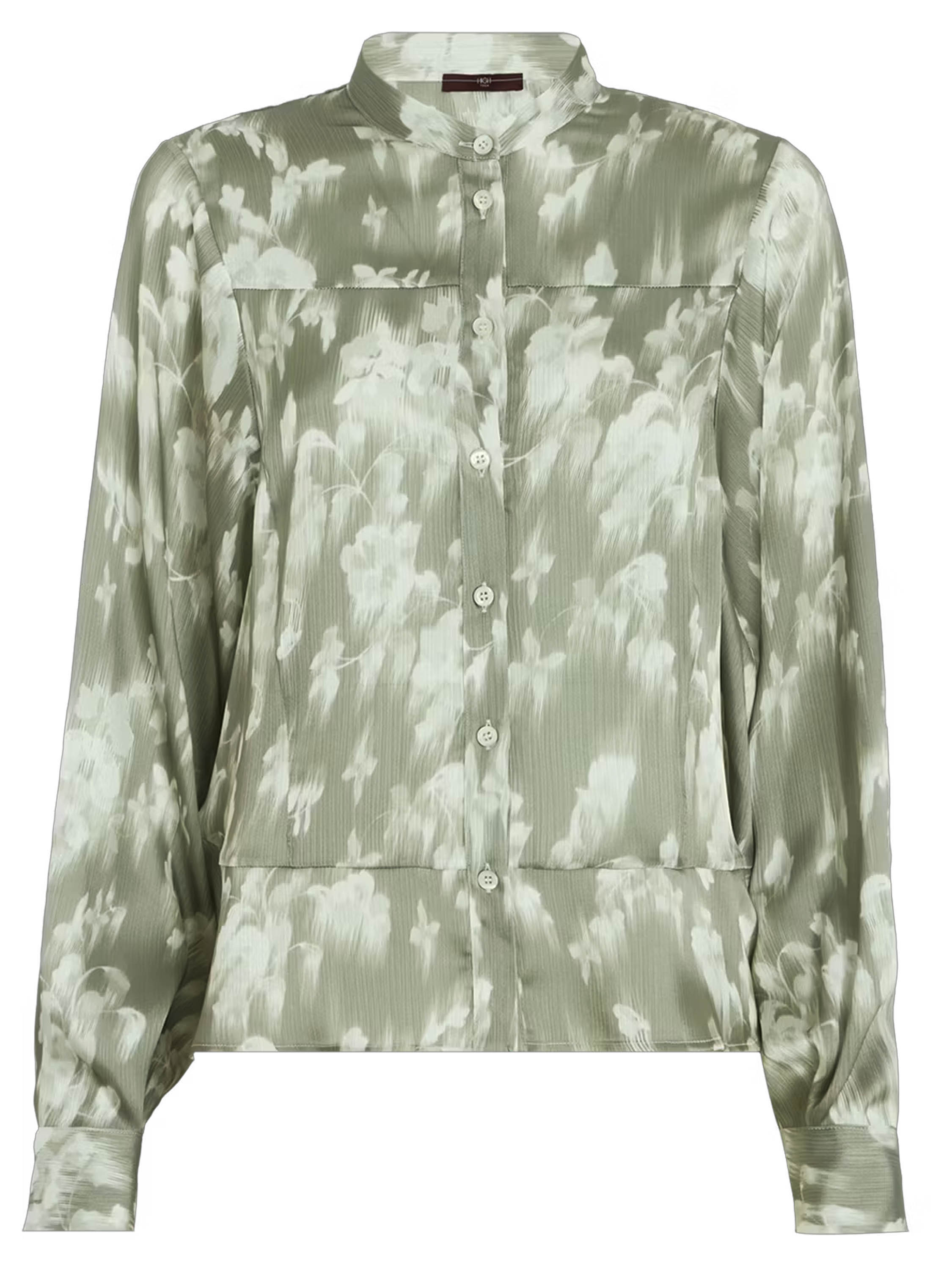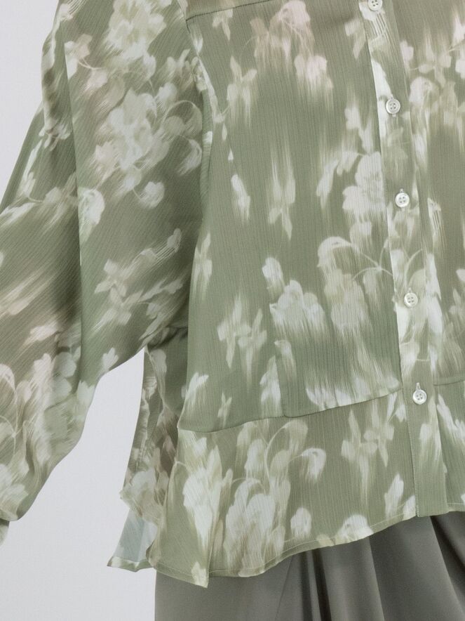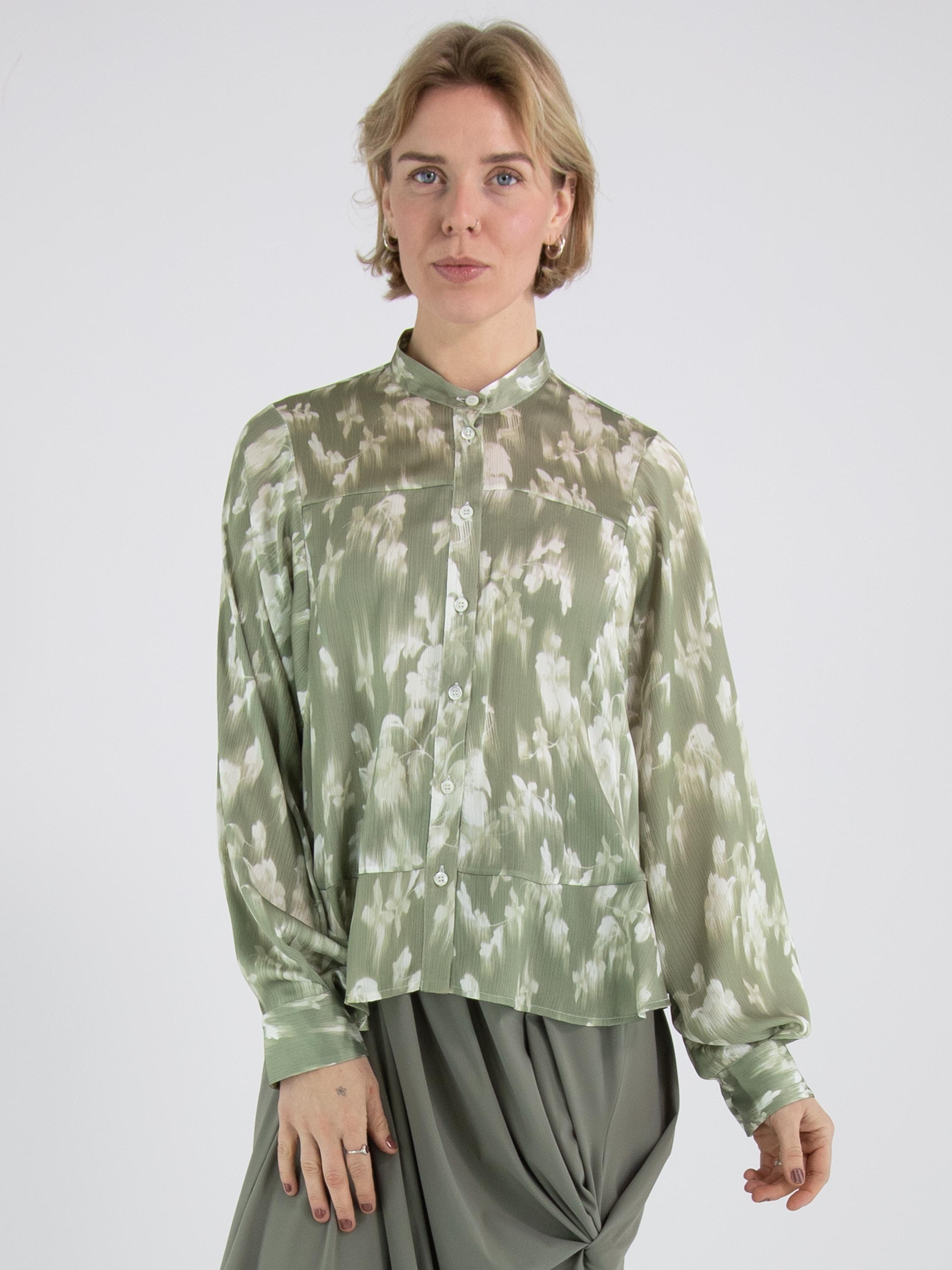 Eine leicht transparente Bluse von High mit einem verwischten Blumenprint in mehreren Olivgrün- und Weißtönen. Die Bluse hat Fledermausärmel und oberhalb der Brust eine Naht. Der Saum ist leicht wellenförmig gearbeitet. Diese Bluse kann per Hand gewaschen werden.
