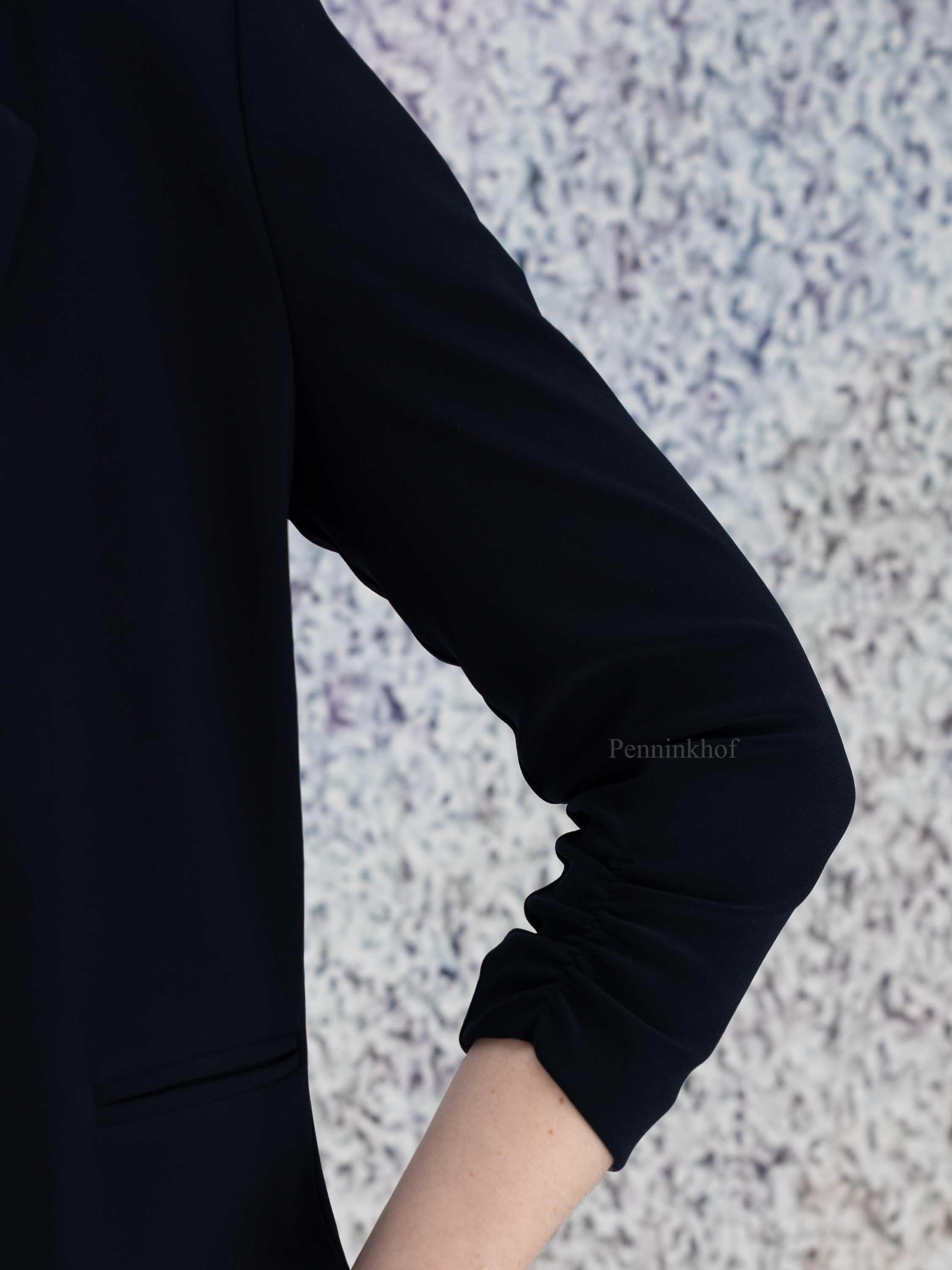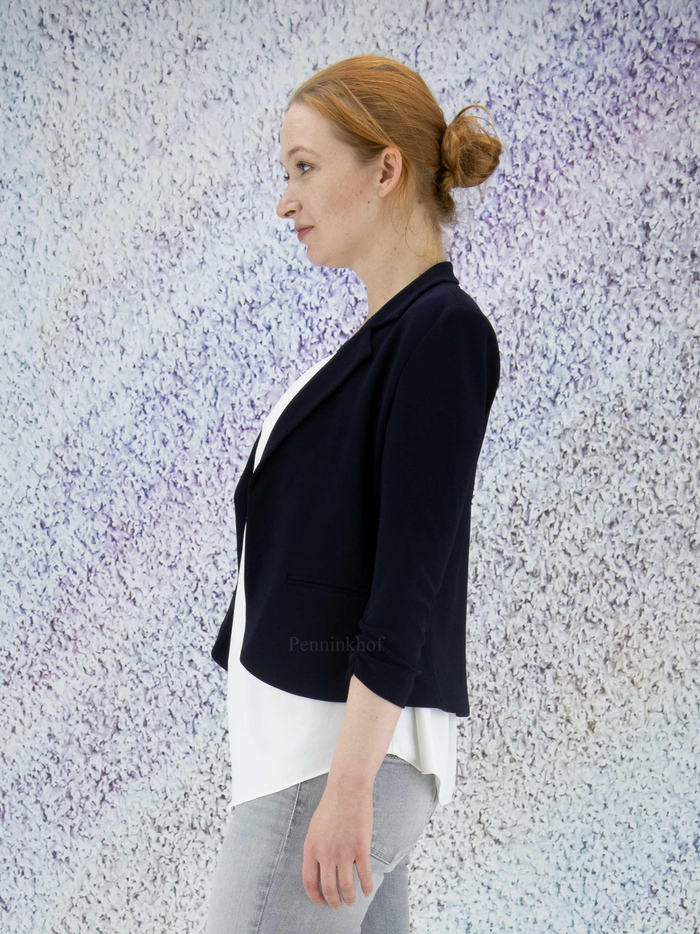 Ein Kurzblazer der Designermarke Joseph Ribkoff in Marineblau. Der Blazer hat halblange Ärmel mit feinen Falten an der Steppnaht am Ärmelabschluss. Dieser Blazer hat keinen Verschluss und darf von Hand gewaschen werden.
