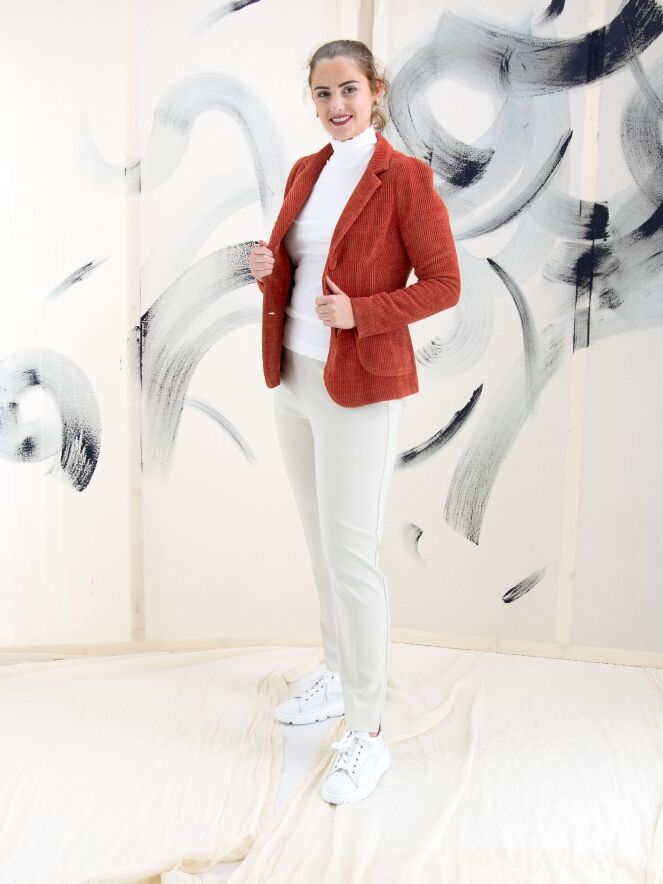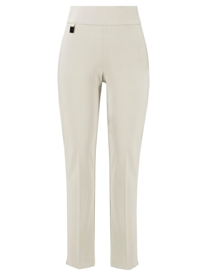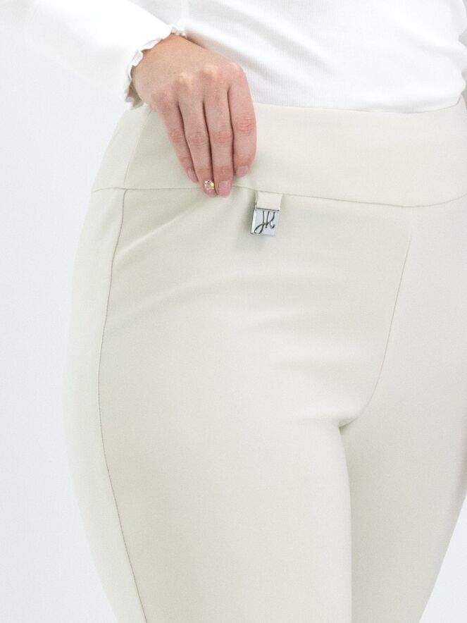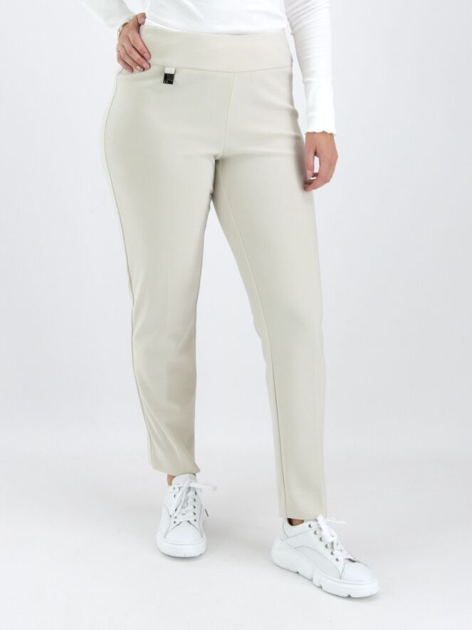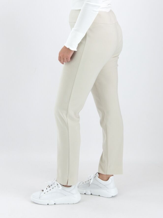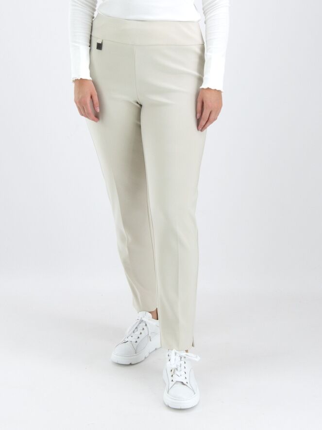 Eine luxuriöse Basis-Hose von Joseph Ribkoff in Beige. Der Bund ist mit einem breiten elastischen Band versehen. In der Mitte der Beine befindet sich eine eingebügelte Falte. Am unteren Ende gibt es an der Außenseite der Beine einen kleinen Schlitz. Diese Hose kann von Hand gewaschen werden.