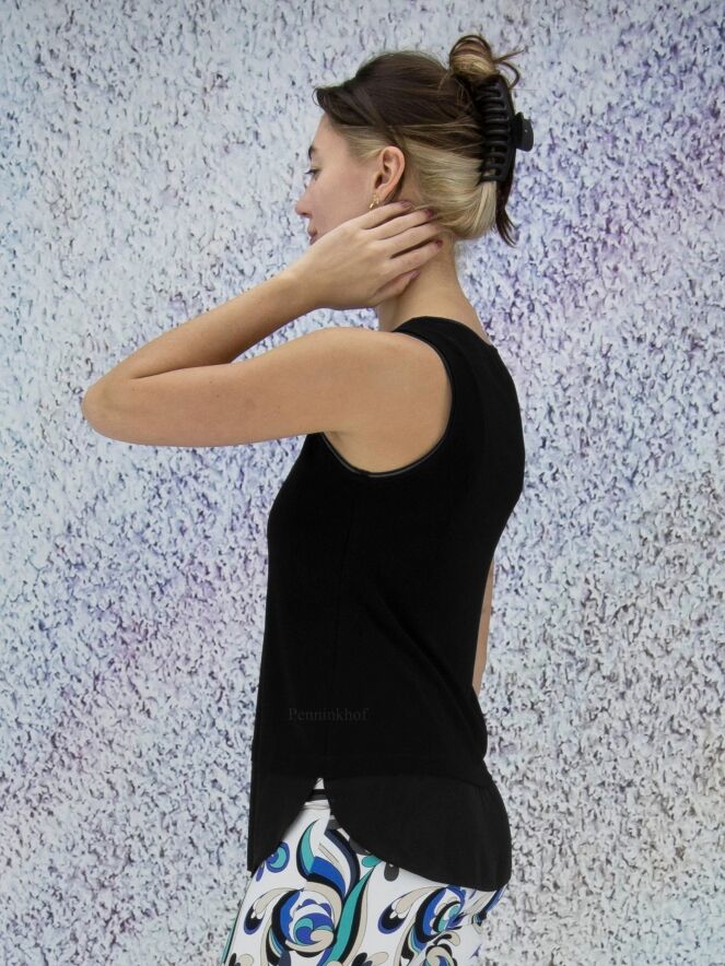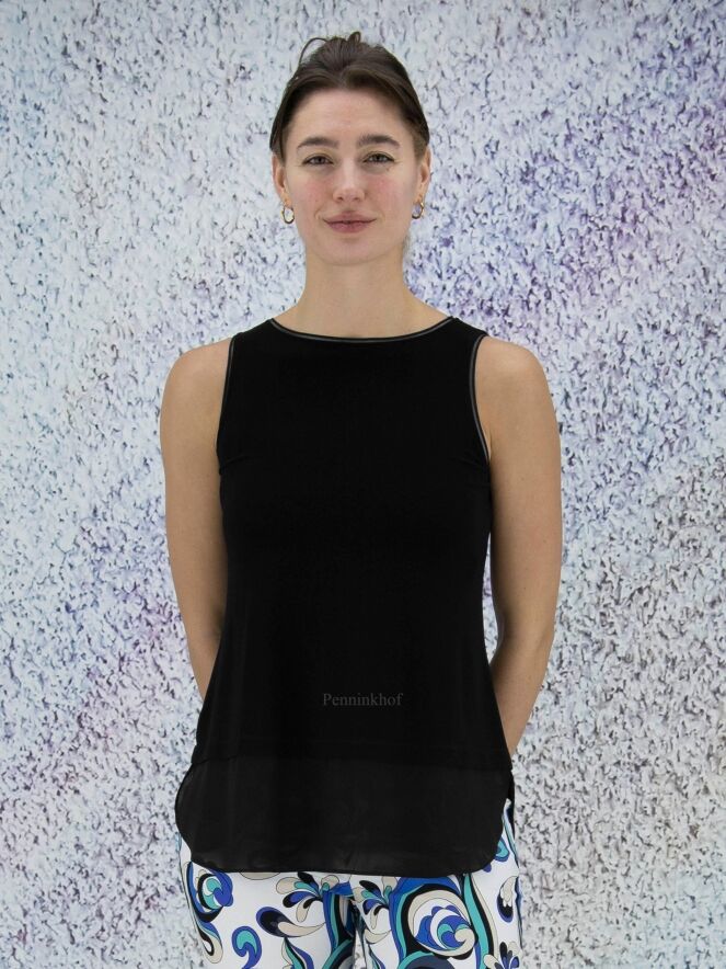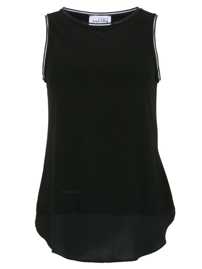 Schwarzes Top der Designermarke Joseph Ribkoff. Ein transparenter Bund akzentuiert die Kante des Ärmelansatzes. Den unteren Rand des Tops bildet ein breiter, durchsichtiger Streifen. Dieses Top darf von Hand gewaschen werden.