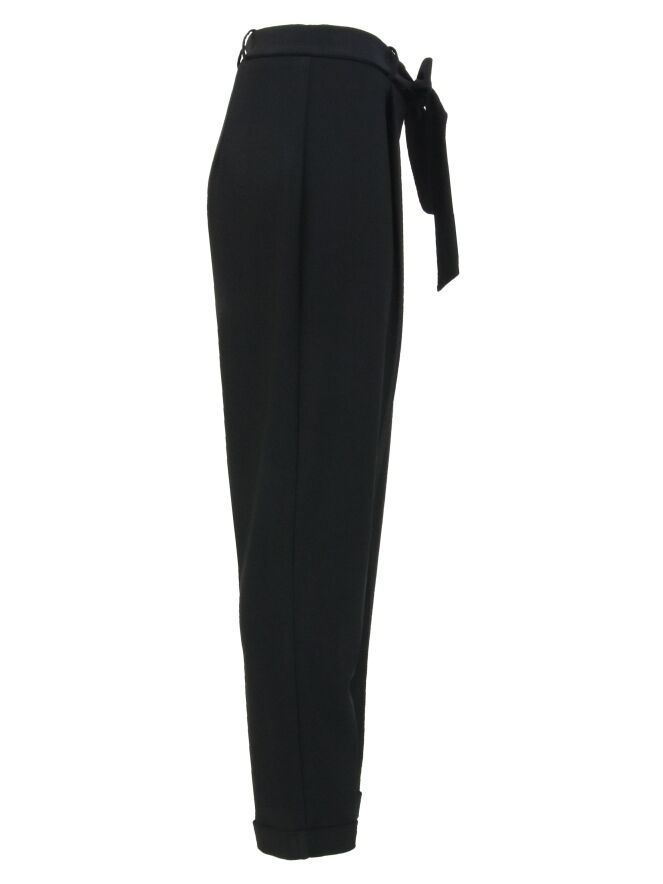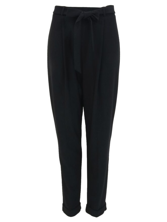 Schwarze Hose der Designermarke Joseph Ribkoff. Der breite Gürtel besteht aus demselben Stoff wie die Hose. Die Hosenbeine sind mit einem schmalen Umschlagsaum versehen. Diese Hose darf von Hand gewaschen werden.