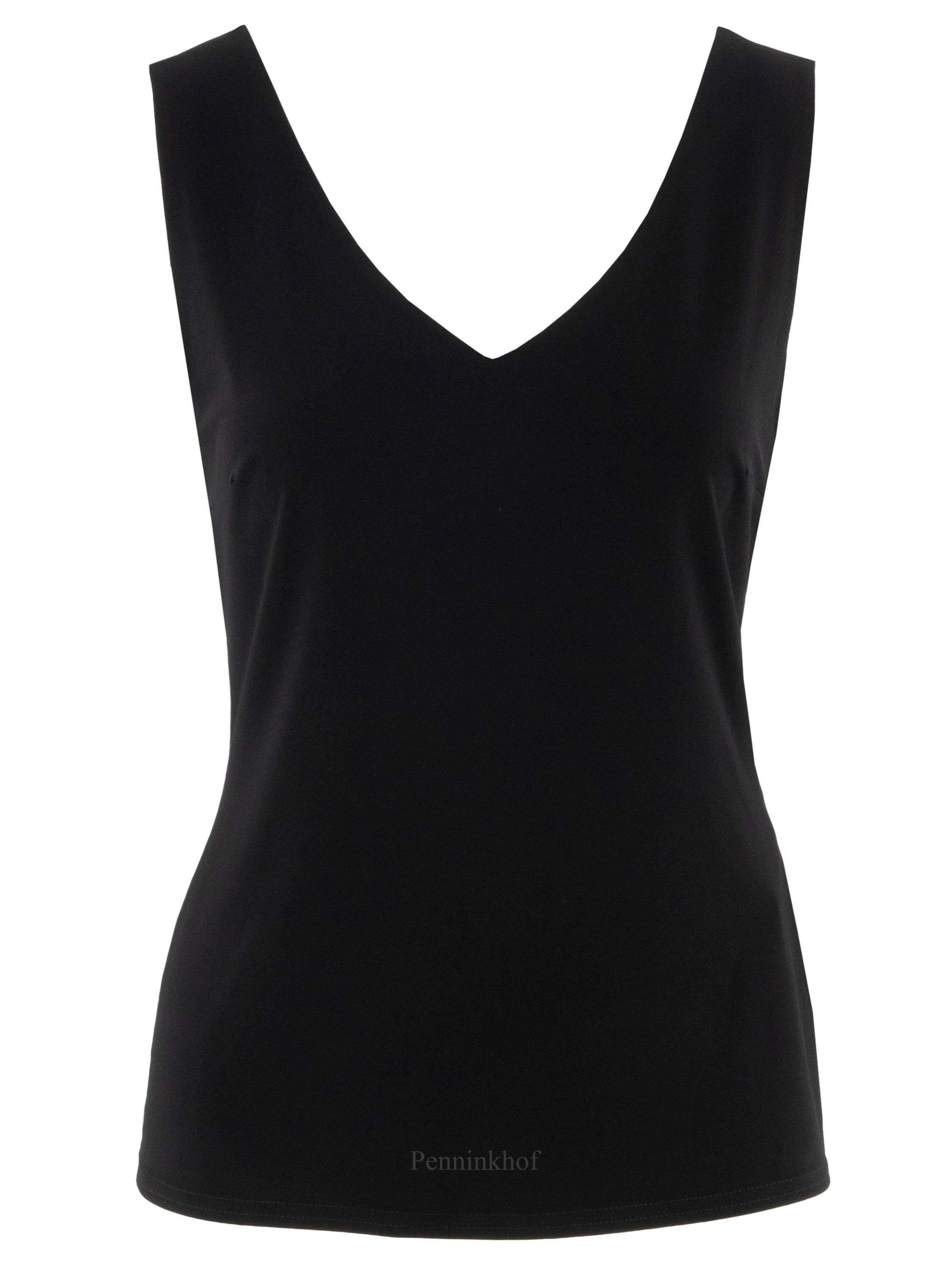 Ein schwarzes Basic-Top der Designermarke Joseph Ribkoff. Die Oberteil hat vorne und hinten einen V-Ausschnitt. Die Träger sind 5 cm breit. Dieses Top darf von Hand gewaschen werden.