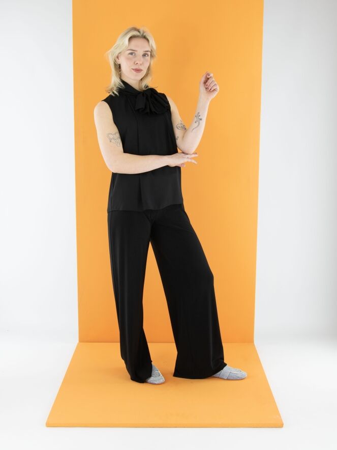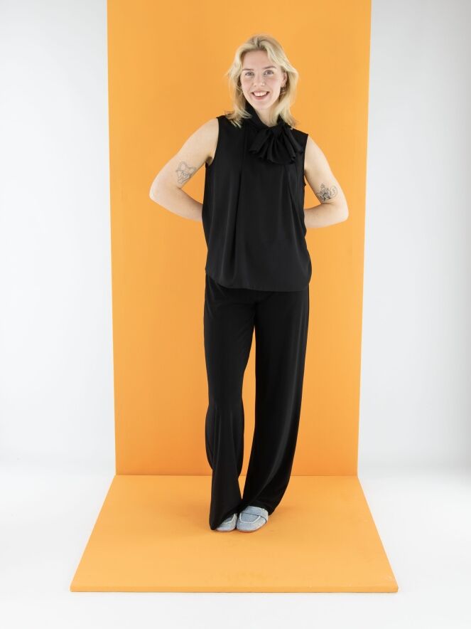Eine Hose mit geradem Bein vom Marken Joseph Ribkoff in Schwarz. Der Bund hat ein elastisches Band. Diese Hose darf von Hand gewaschen werden.