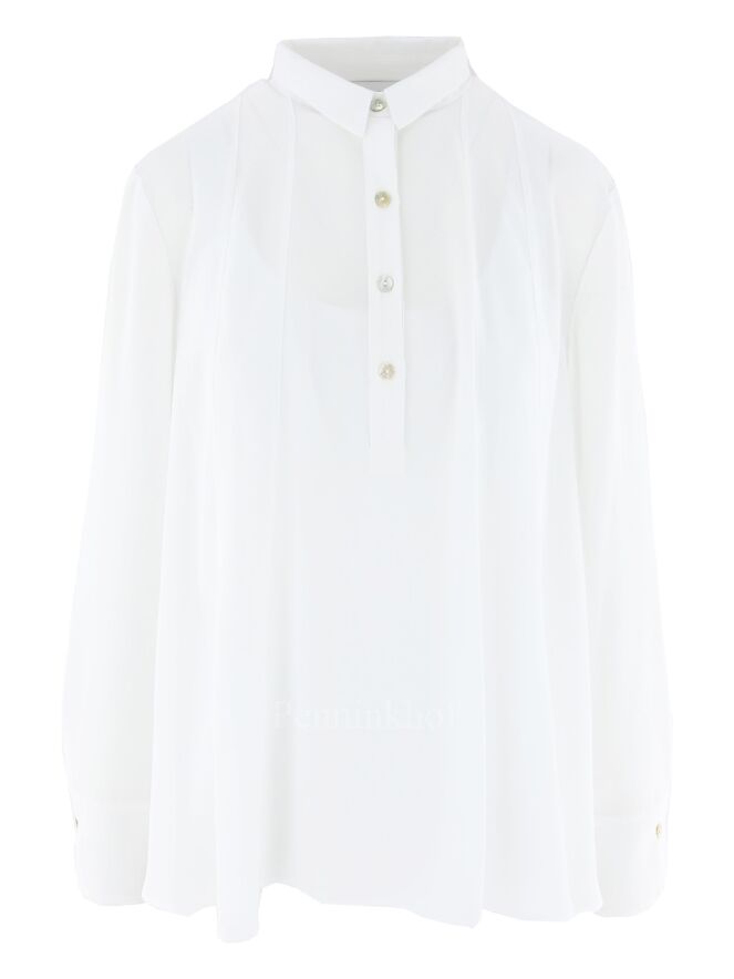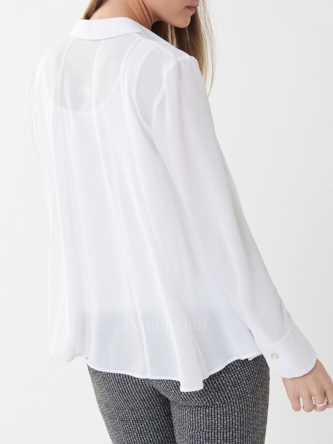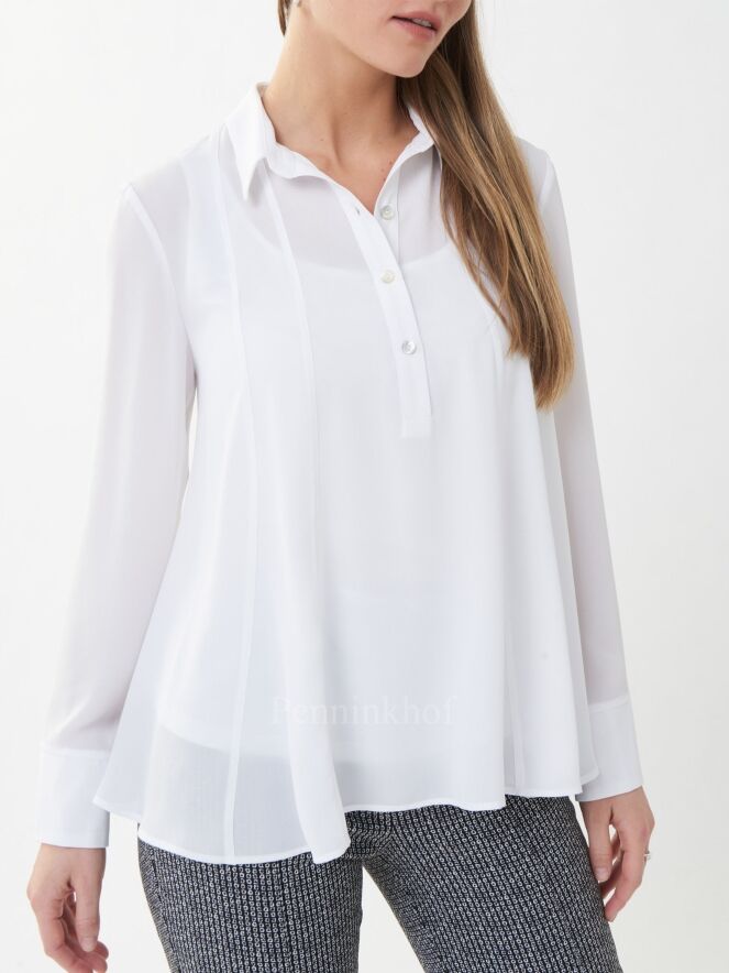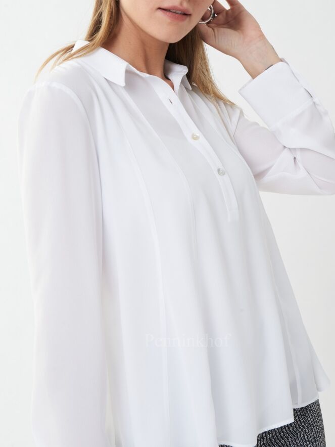 Eine weiße Bluse der Designermarke Joseph Ribkoff. Die Bluse hat einen Poloverschluss und eine A-Linie. Diese Bluse kann von Hand gewaschen werden.