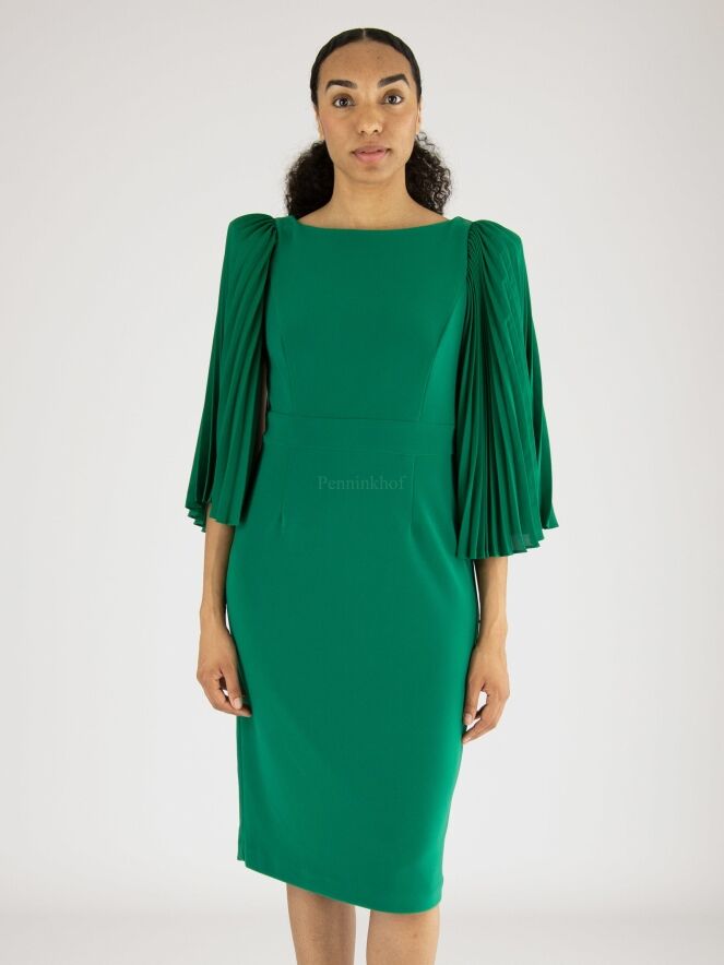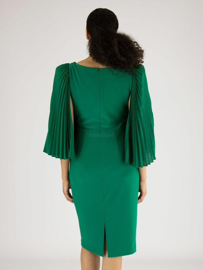 Ein grünes Kleid der Designermarke Joseph Ribkoff. Das Kleid hat halblange plissierte Fledermausärmel, die unten offen sind. Der Bund ist doppelt abgesteppt. Dieses Kleid darf von Hand gewaschen werden.