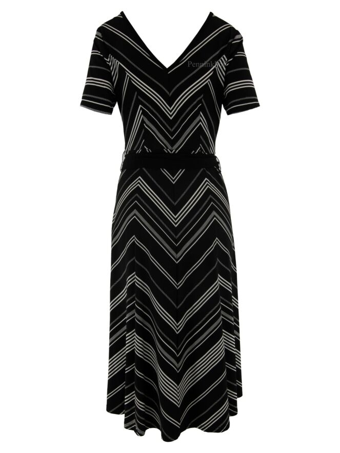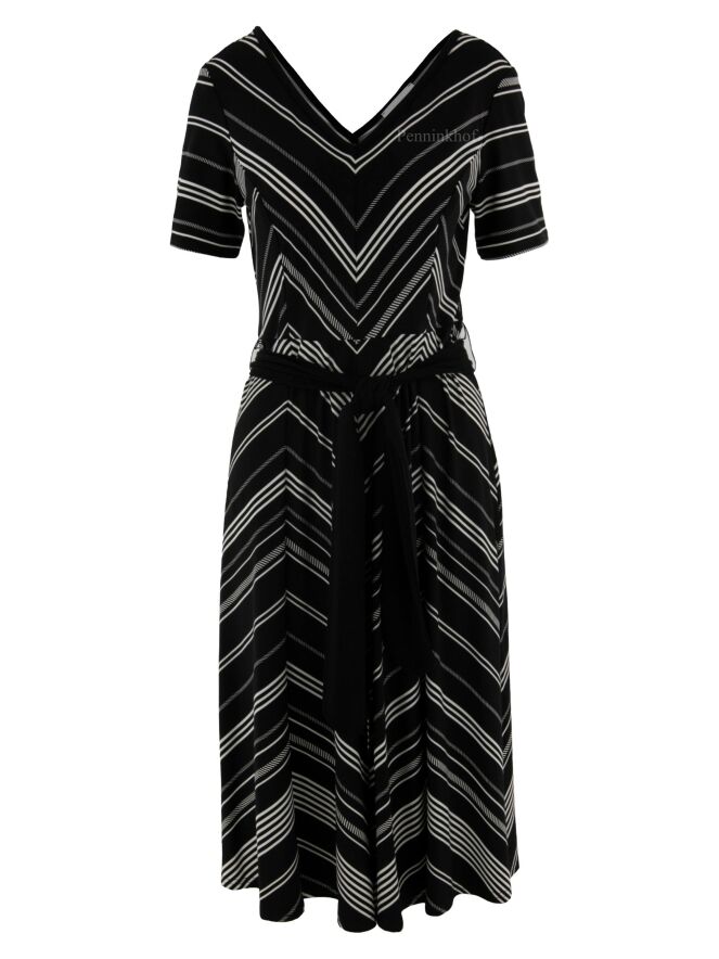 Ein Kleid der Designermarke Joseph Ribkoff mit diagonalen Streifen in den Farben Schwarz und Weiß. Das Kleid hat auf der Vorder- und Rückseite einen V-Ausschnitt. An der Taille befindet sich ein schwarzer Stoffgürtel. Ab der Taille hat das Kleid eine A-Linie und am unteren Saum befinden sich Schlitze an den Seiten. Dieses Kleid darf von Hand gewaschen werden.