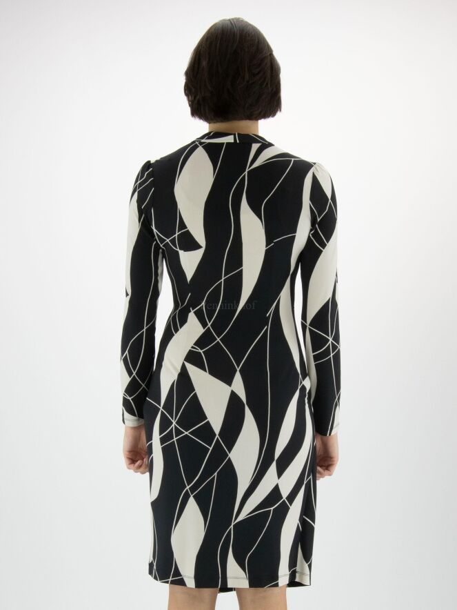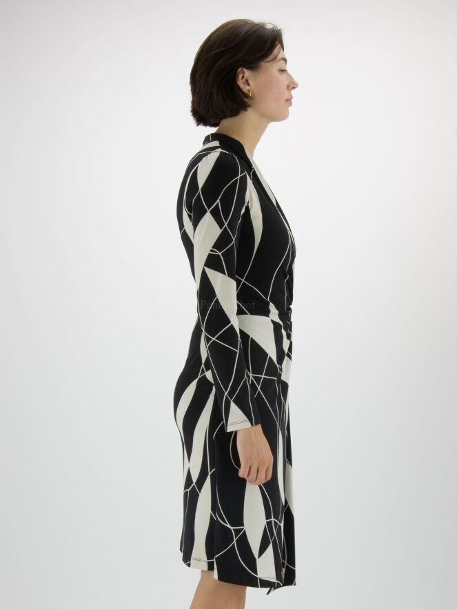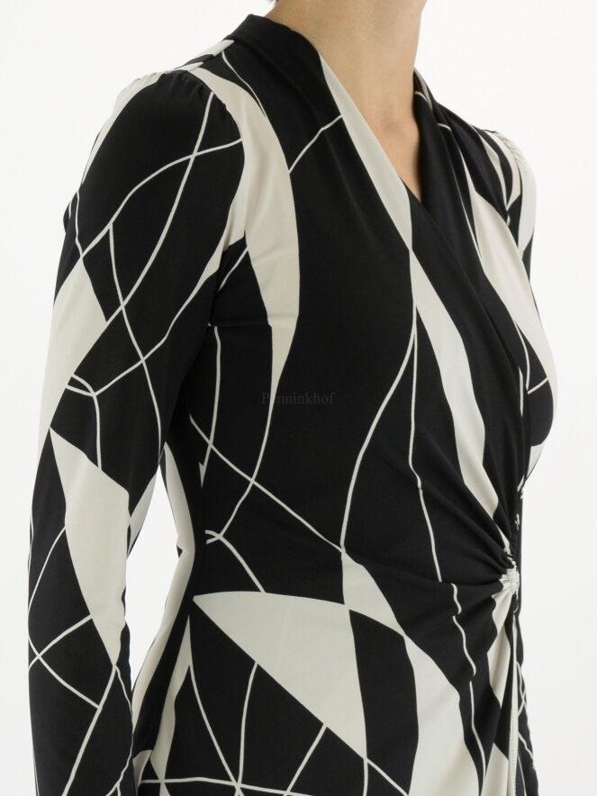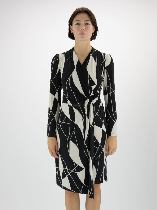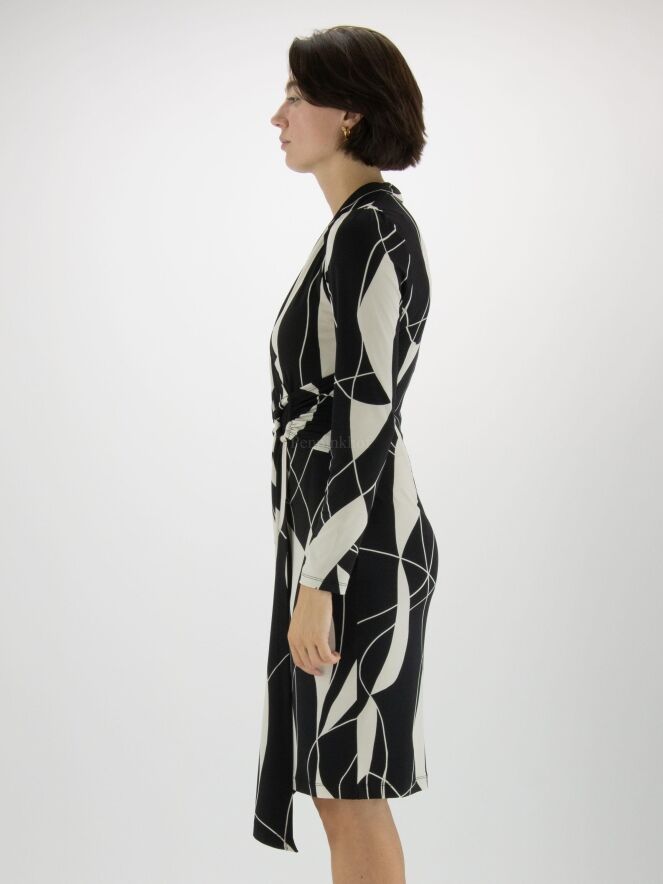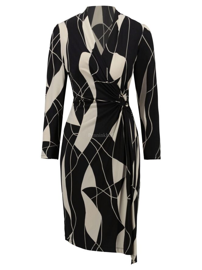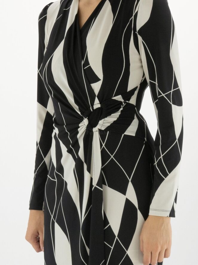 Ein Wickelkleid von Joseph Ribkoff mit einem grafischen Druck in Schwarz und Kit oder Hellgrau. An der Taille ist eine Metallschnalle in der Mitte angebracht, an der der Sof in Falten gelegt ist. Das Kleid hat einen V - Ausschnitt und kann mit der Hand gewaschen werden.