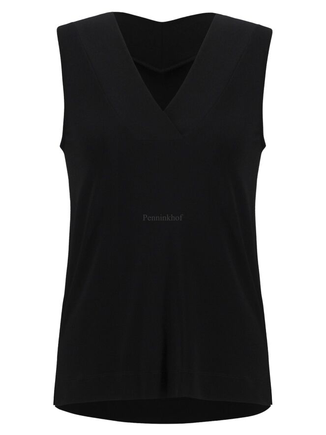 Ein Top von Joseph Ribkoff in Schwarz. Der V-Ausschnitt hat eine kurze Überlappung in der Mitte. Dieses Top kann von Hand gewaschen werden.