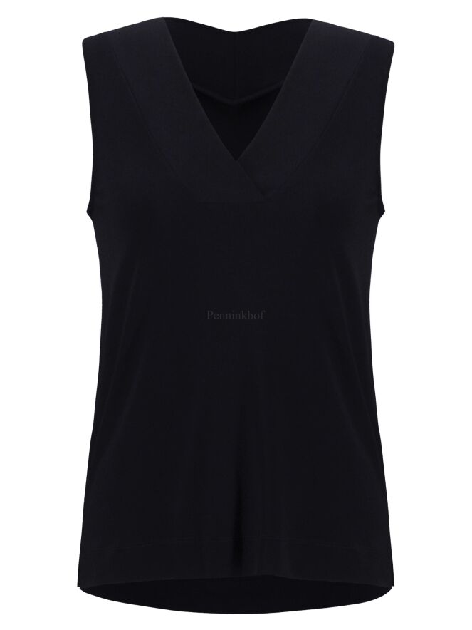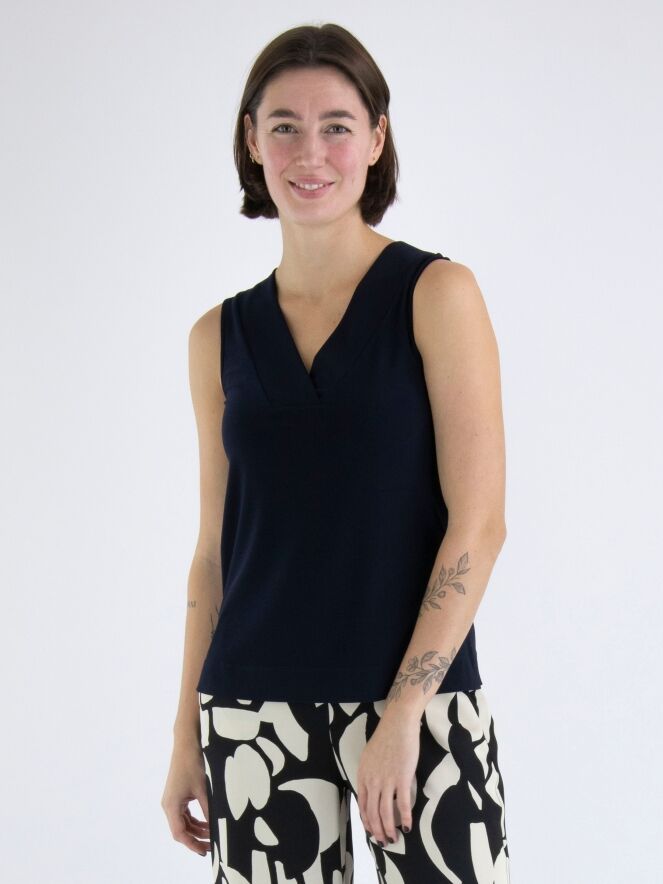 Ein Top von Joseph Ribkoff in Marineblau. Der V-Ausschnitt hat eine kurze Überlappung in der Mitte. Dieses Top kann von Hand gewaschen werden.