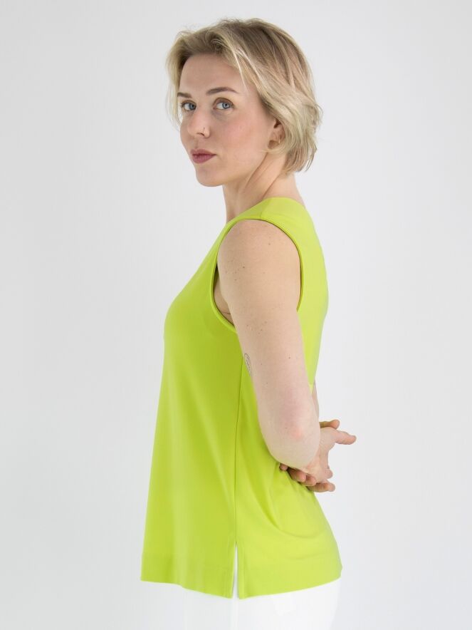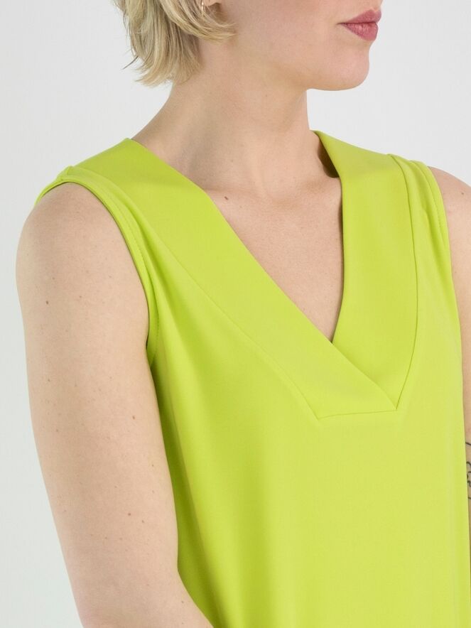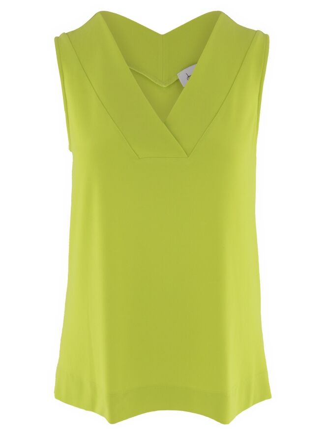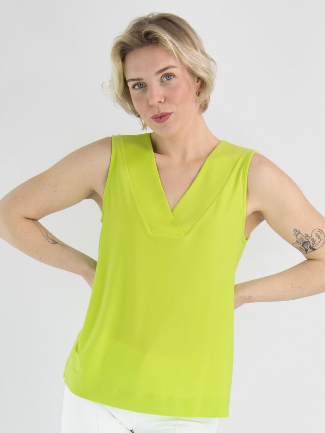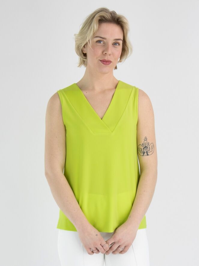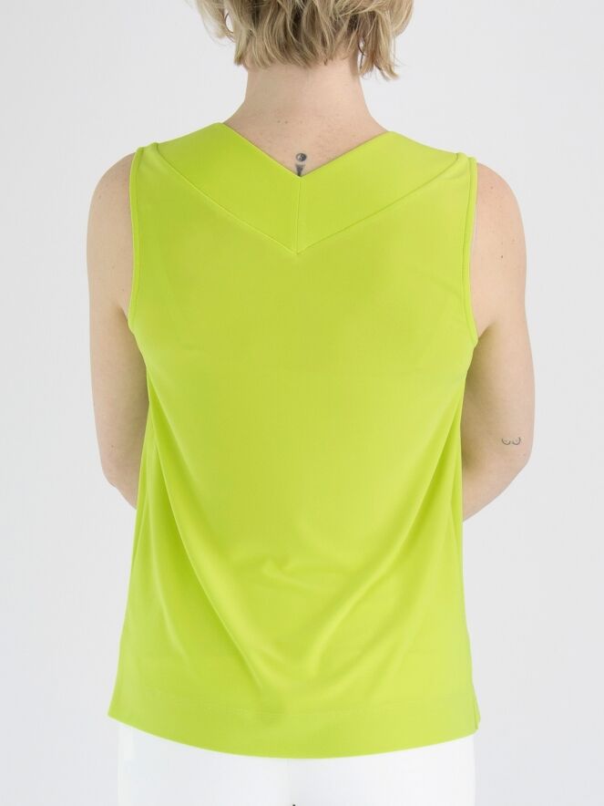Ein Top von Joseph Ribkoff in Limettenfarbe. Der V-Ausschnitt hat eine kurze Überlappung in der Mitte. Dieses Top kann von Hand gewaschen werden.