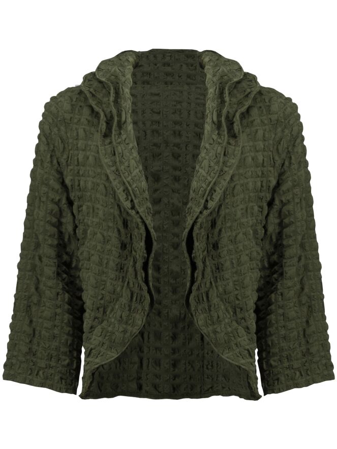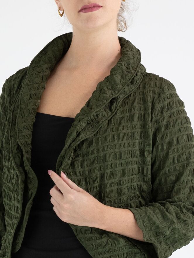 Eine kurz gesmokte Strickjacke von Joseph Ribkoff in Khakifarbe. Der Stoff ist in einem Waffelmuster gesmokt, und die Strickjacke hat keinen Verschluss. Die Strickjacke hat einen doppelten Kragen mit Verstärkung im Rand. Diese Strickjacke kann von Hand gewaschen werden.