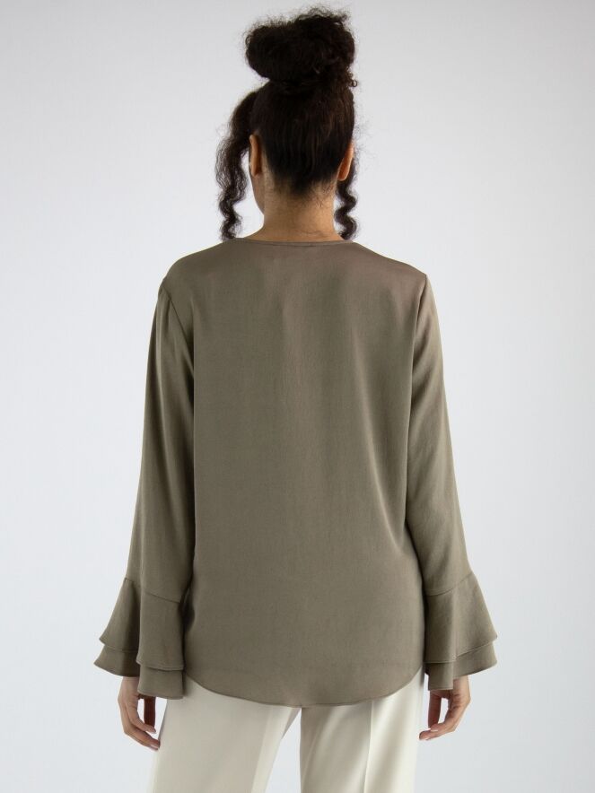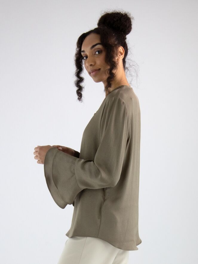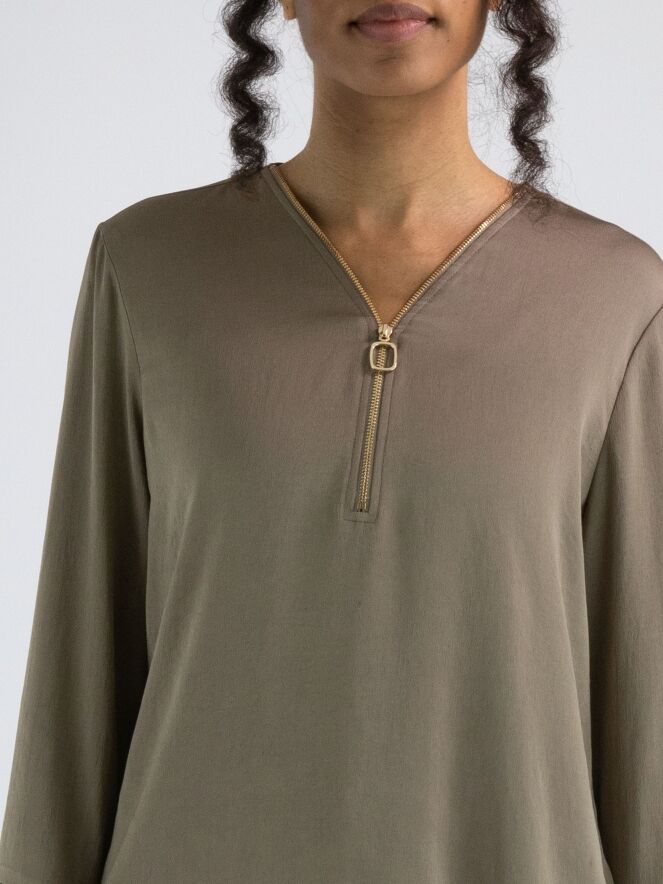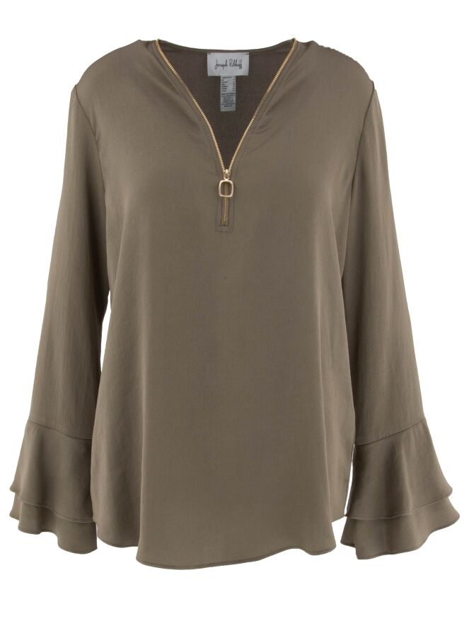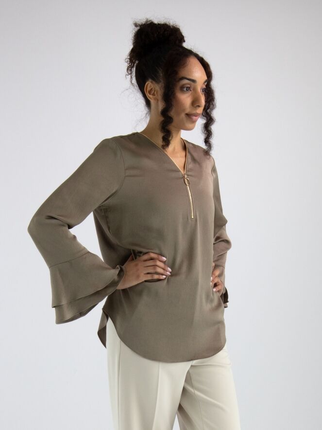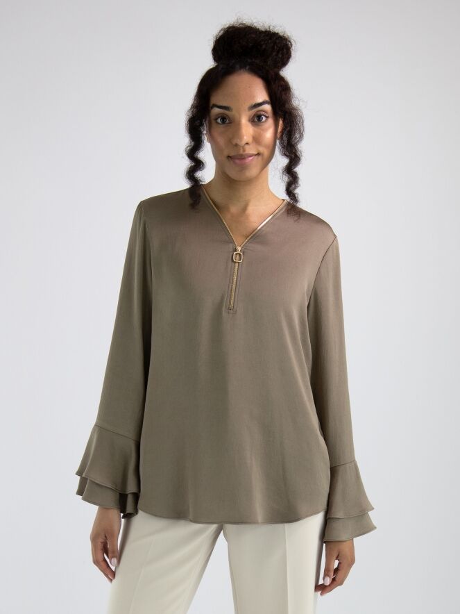 Ein mattes Satinhemd von Joseph Ribkoff in Taupe. Entlang des Randes des V-Ausschnitts befindet sich eine dekorative Reißverschlussleiste. Die langen Ärmel haben am Ende Trompetenmanschetten aus doppellagigem Stoff. Dieses Hemd kann von Hand gewaschen werden.