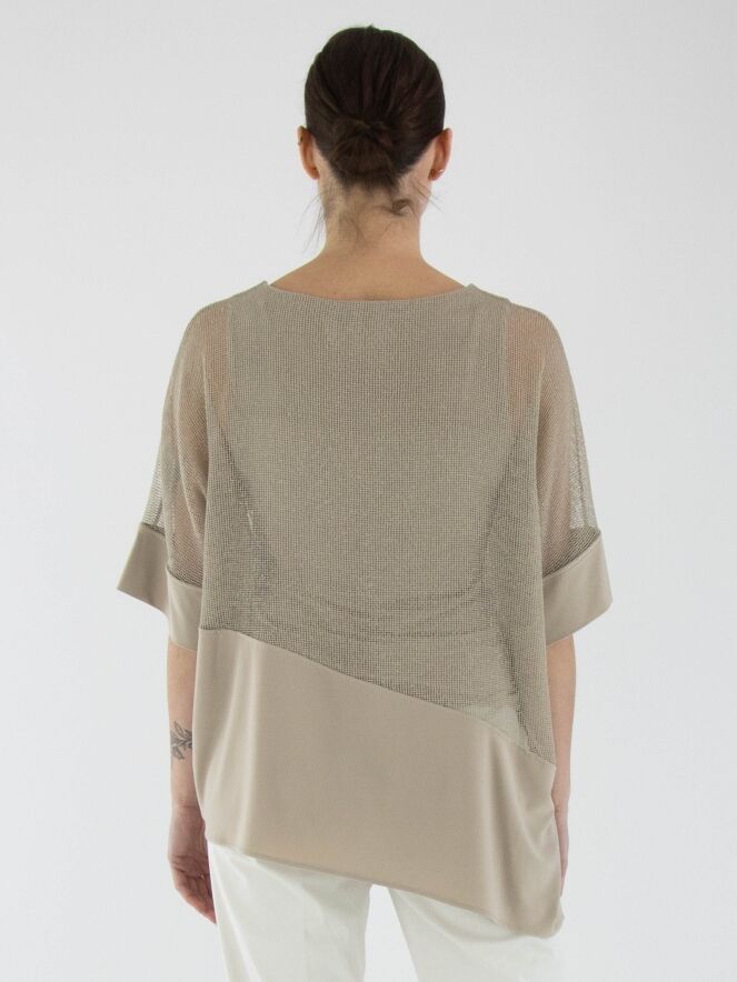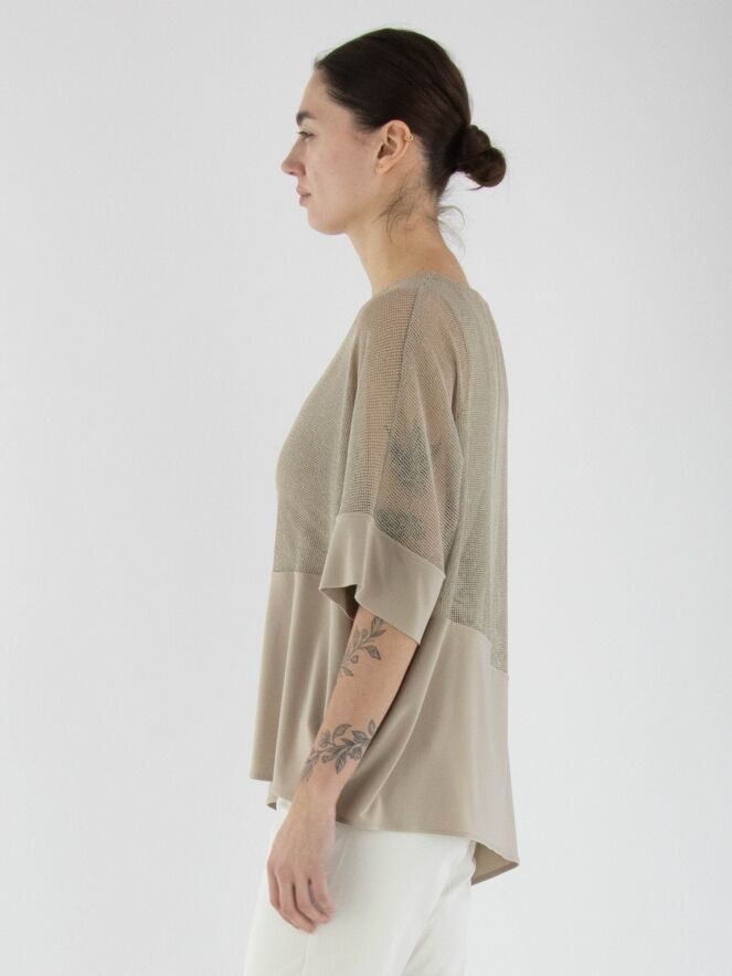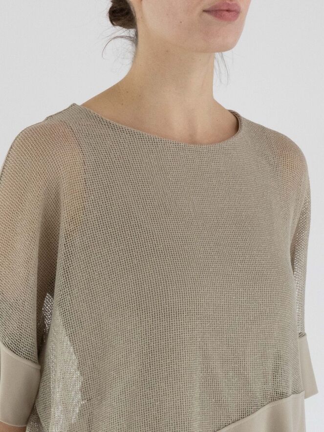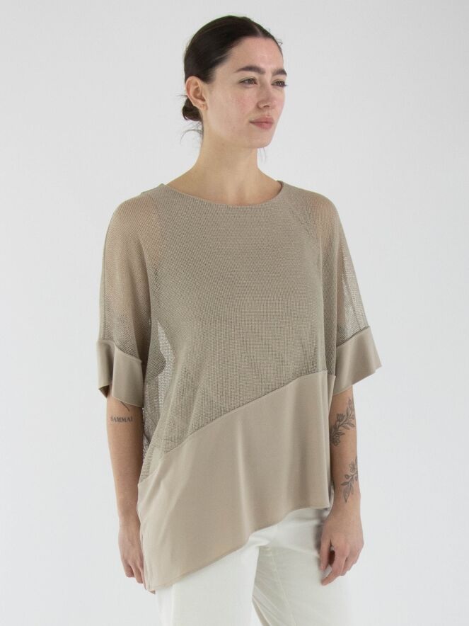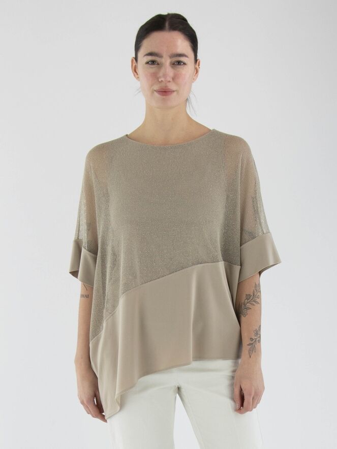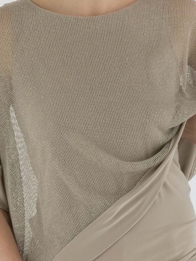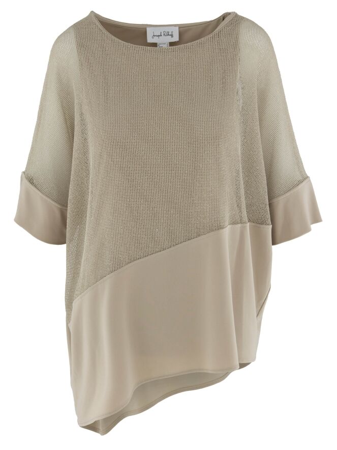 Ein offen gewebter Pullover von Joseph Ribkoff in Taupe. Unter dem Pullover befindet sich ein einfarbig schwarzes Top. Die offen gewebte Struktur reicht bis zur Taille, wo eine diagonale Linie in ein einfarbig schwarzes Material übergeht. Die kurzen Ärmel sind mit einer breiten Biese aus demselben schwarzen Stoff versehen. Dieser Pullover sollte von Hand gewaschen werden.