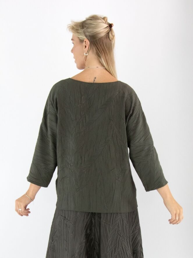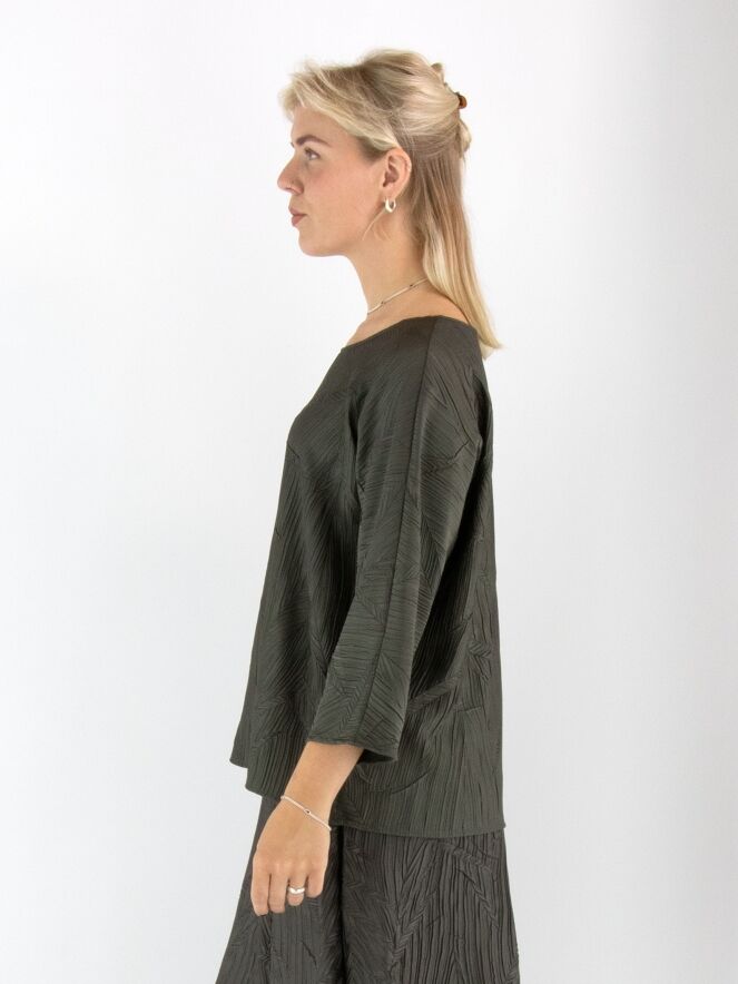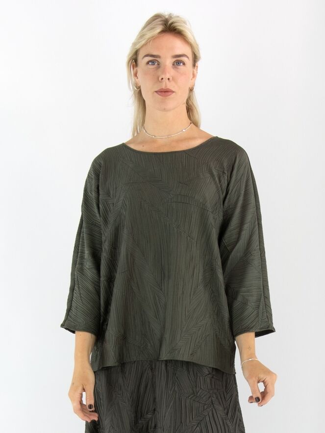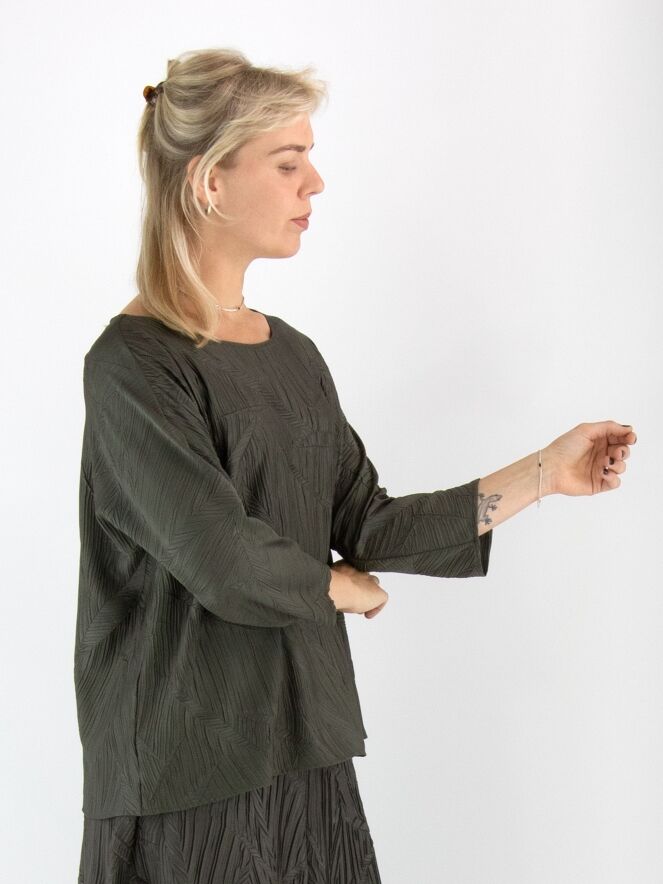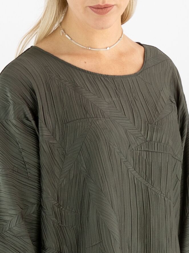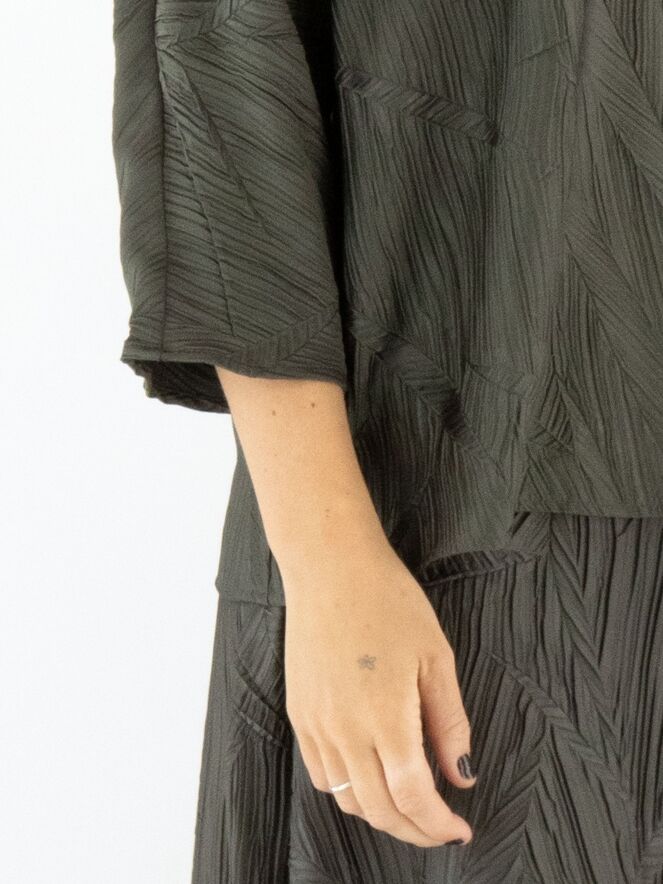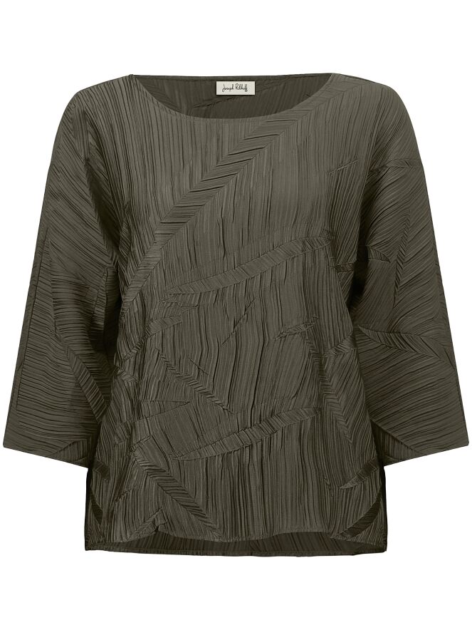 Ein Shirt von Joseph Ribkoff in Olivgrün. Der Stoff ist fein plissiert in einem blattförmigen Muster. Das Shirt hat einen runden Ausschnitt und halblange Ärmel. Dieses Shirt sollte von Hand gewaschen werden.