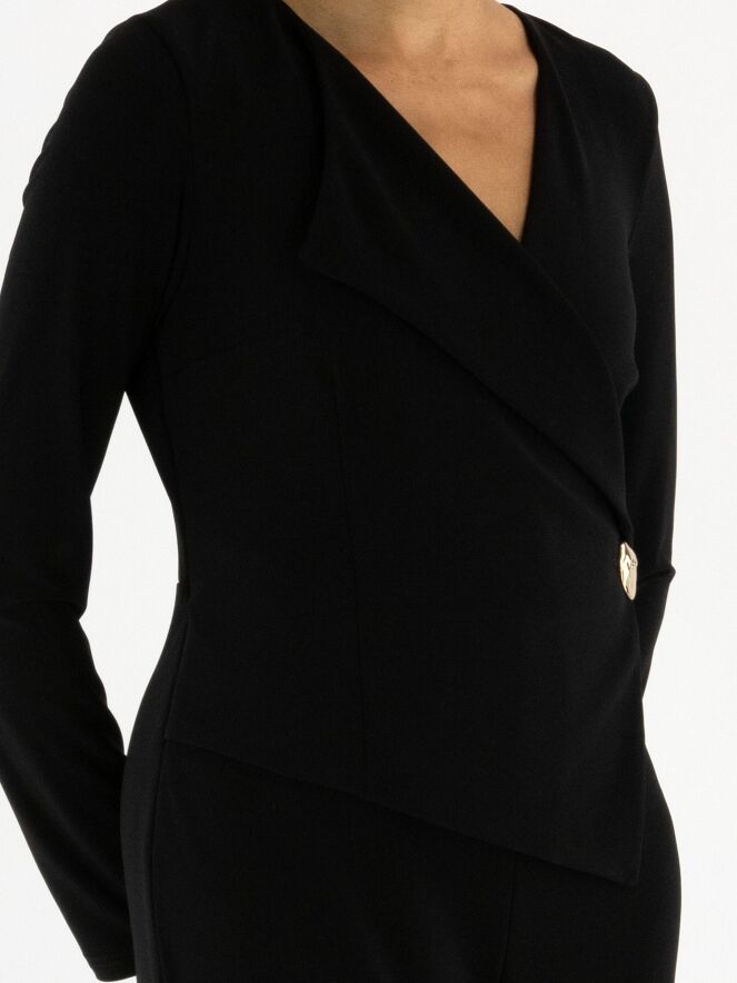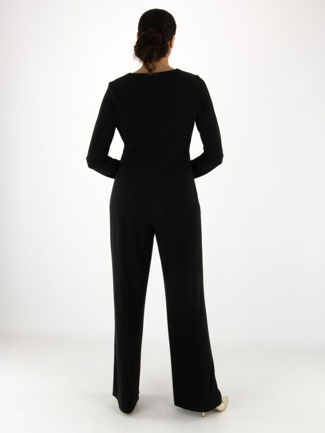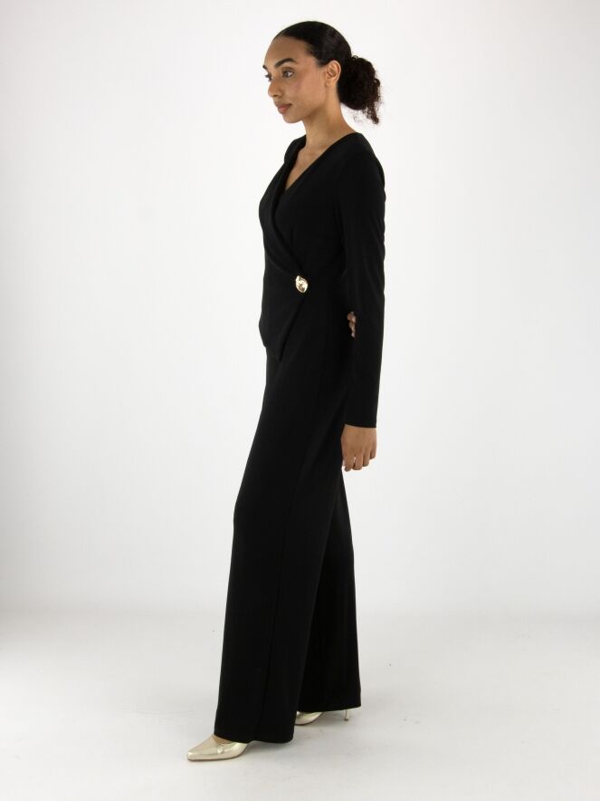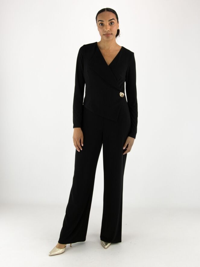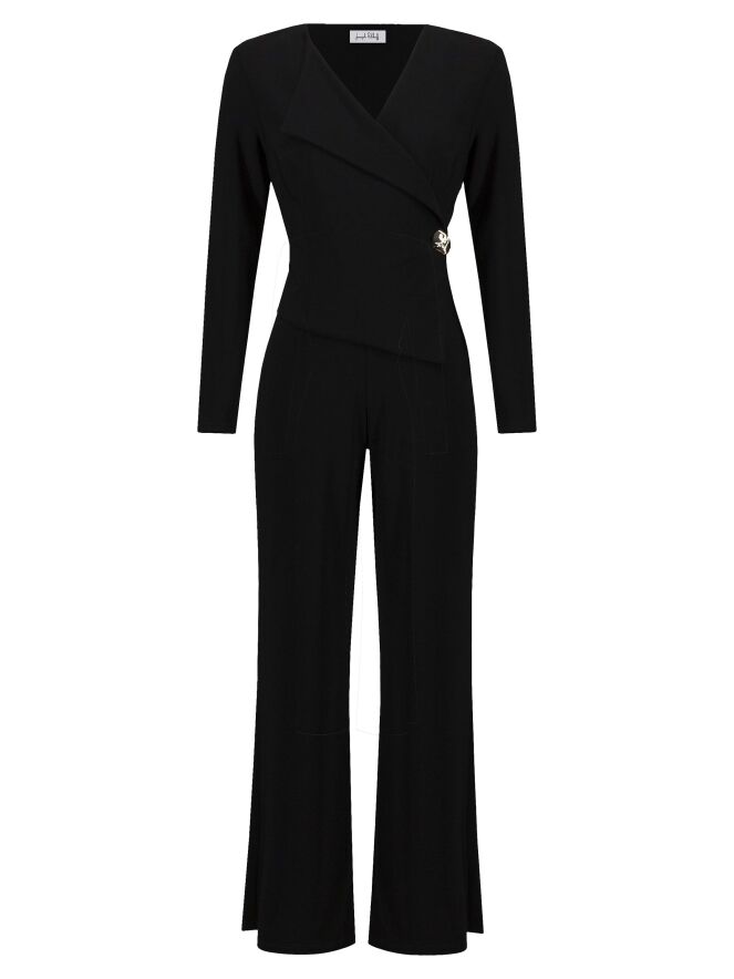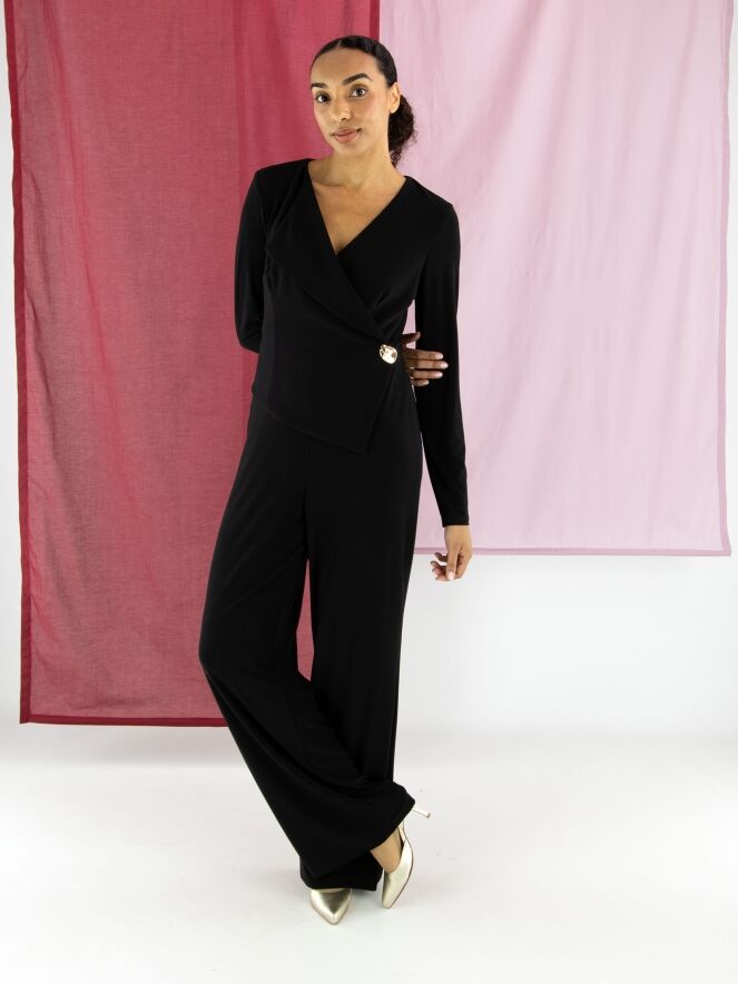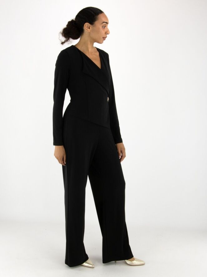 Ein schwarzer Jumpsuit von Joseph Ribkoff. Vom Halsausschnitt verläuft auf der rechten Seite ein Kragen mit breitem Revers bis zur Taille, mit einer Wickelpartie, die dekorativ durch einen goldfarbenen Knopf betont wird. Dieser Jumpsuit sollte von Hand gewaschen werden.