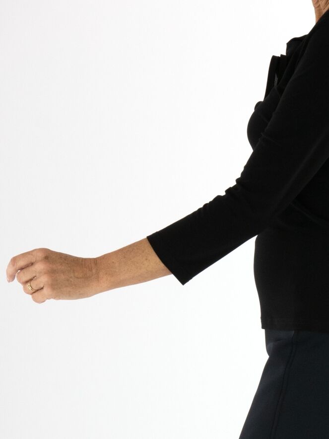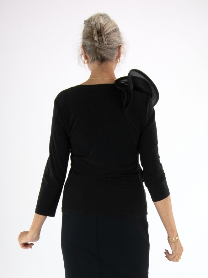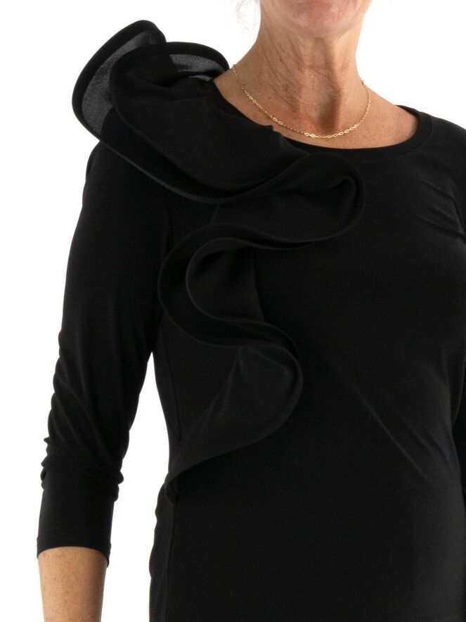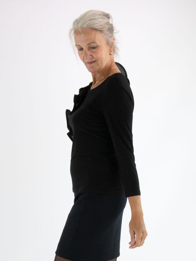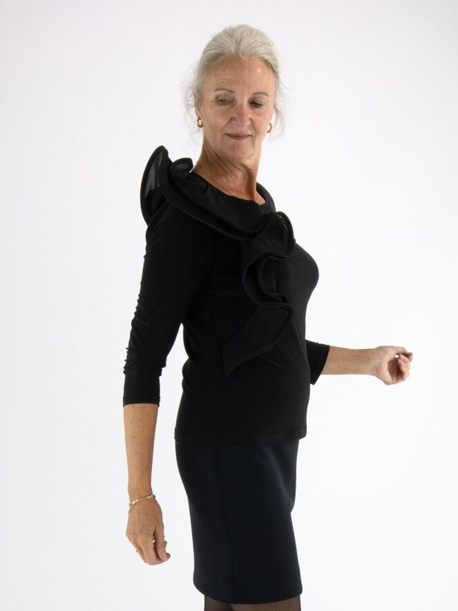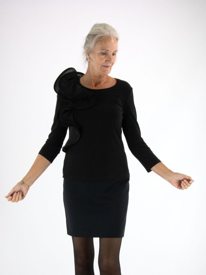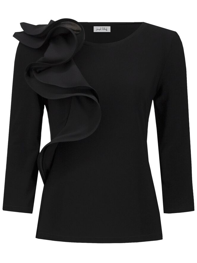 Ein schwarzes Shirt von Joseph Ribkoff. Das Shirt hat lange Ärmel und einen runden Ausschnitt. Vom Rücken der rechten Schulter verläuft eine wellenförmige Volant mit geformtem Rand seitlich nach vorne bis zum unteren Saum. Dieses Shirt sollte von Hand gewaschen werden.