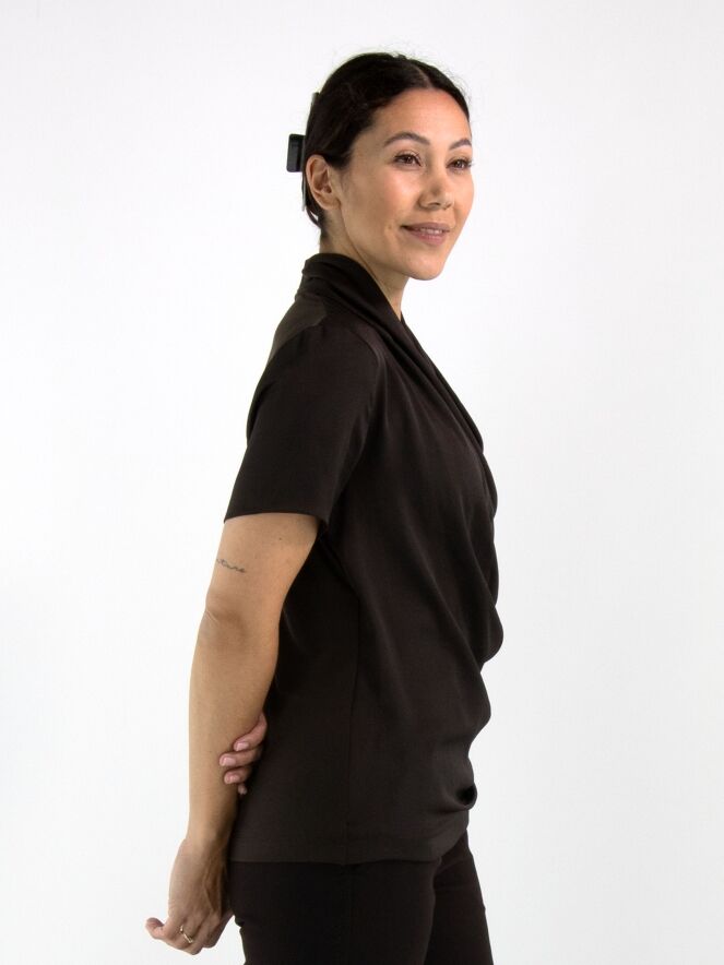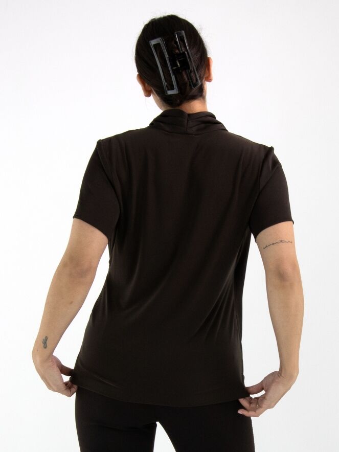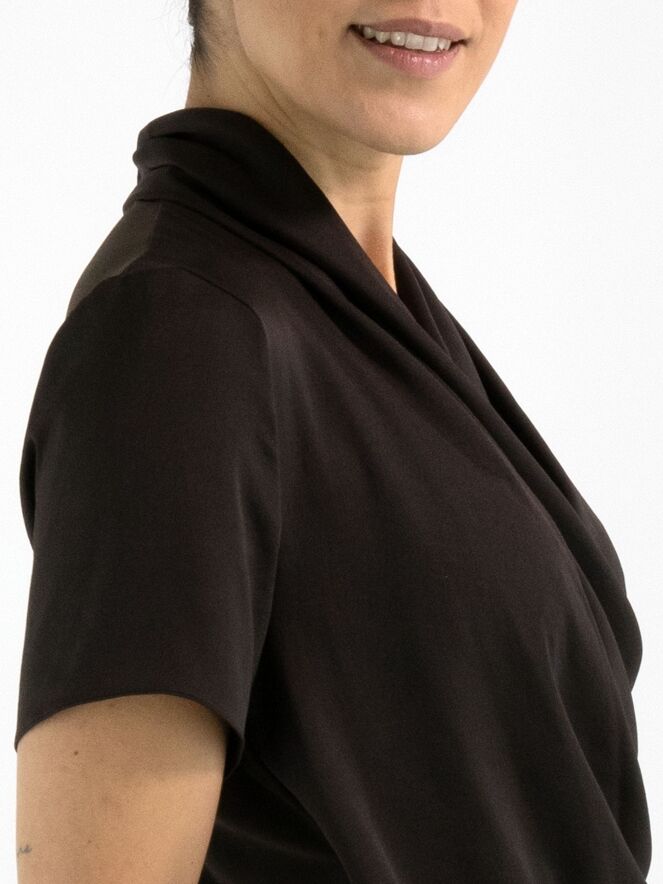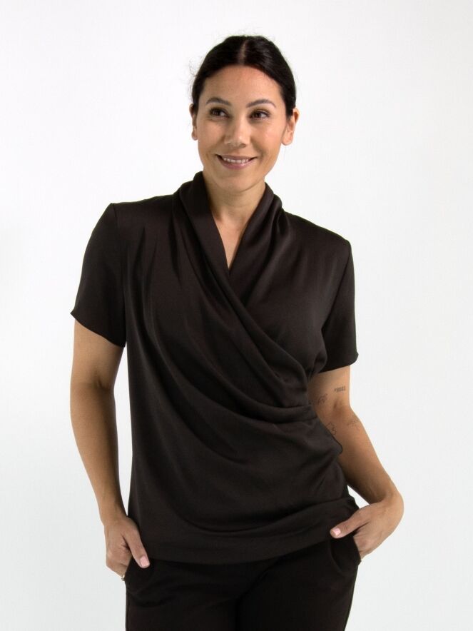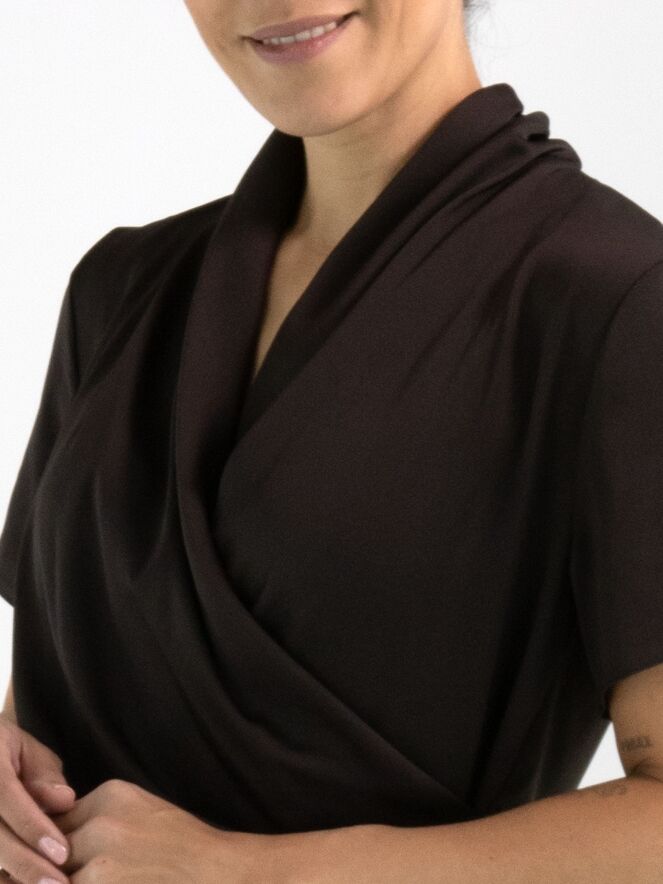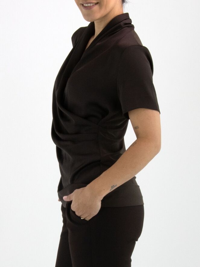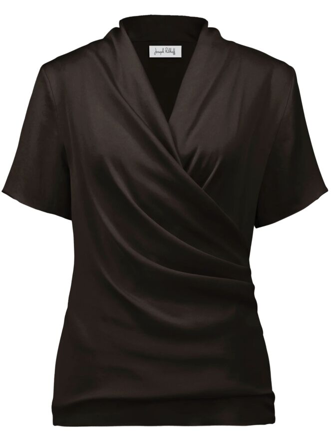 Ein Wickelshirt von Joseph Ribkoff in Mokkabraun. In der Taille ist die Wickelpartie an der linken Seite mit mehreren Falten fixiert, wodurch ein eleganter Drapierungseffekt entsteht. Das Shirt hat kurze Ärmel und kann per Hand gewaschen werden.