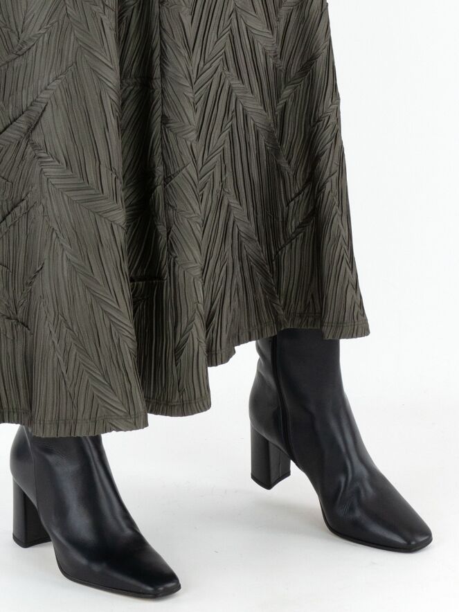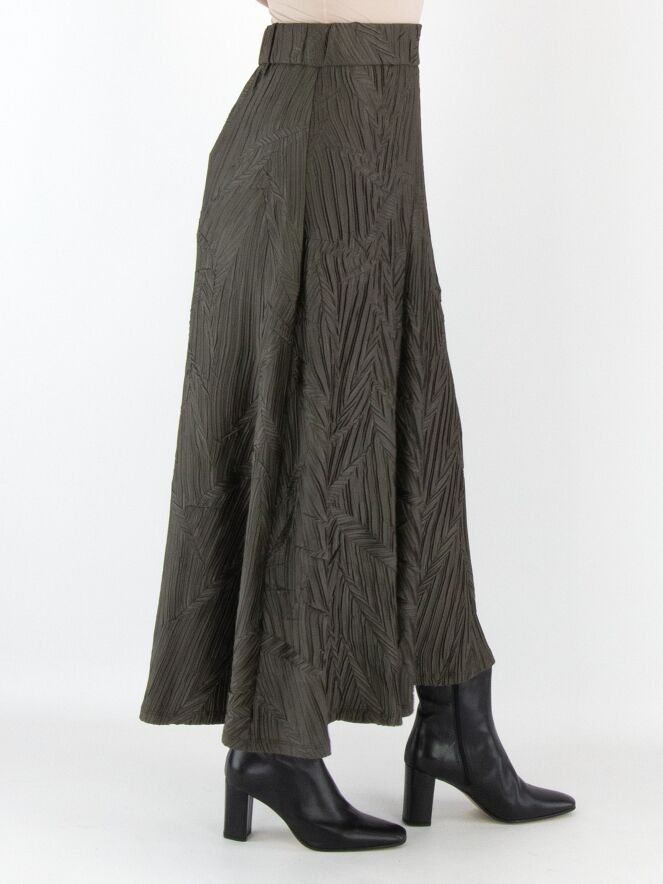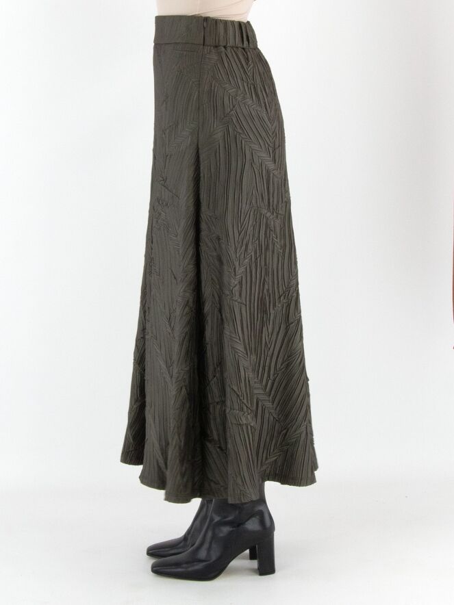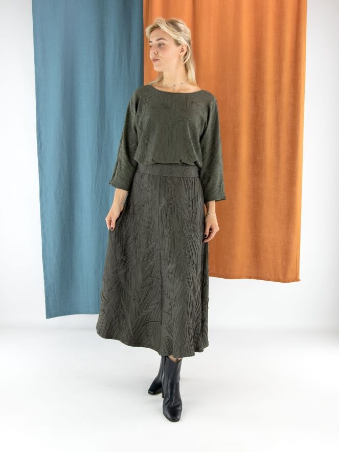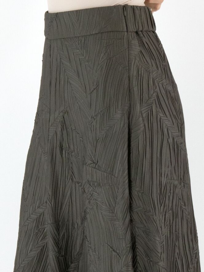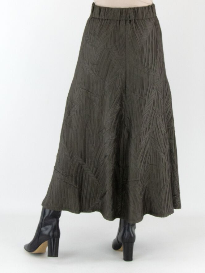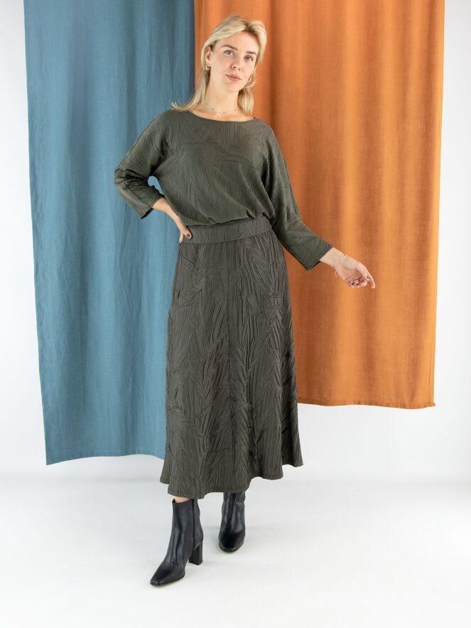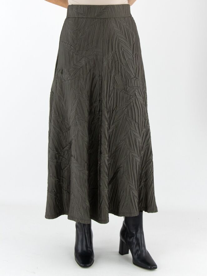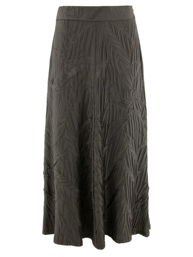Rock von Joseph Ribkoff in Olivgrün. Der Stoff ist fein in einem Blattmuster plissiert. Der Rock hat einen breiten elastischen Bund, ist ungefüttert und sollte von Hand gewaschen werden.
