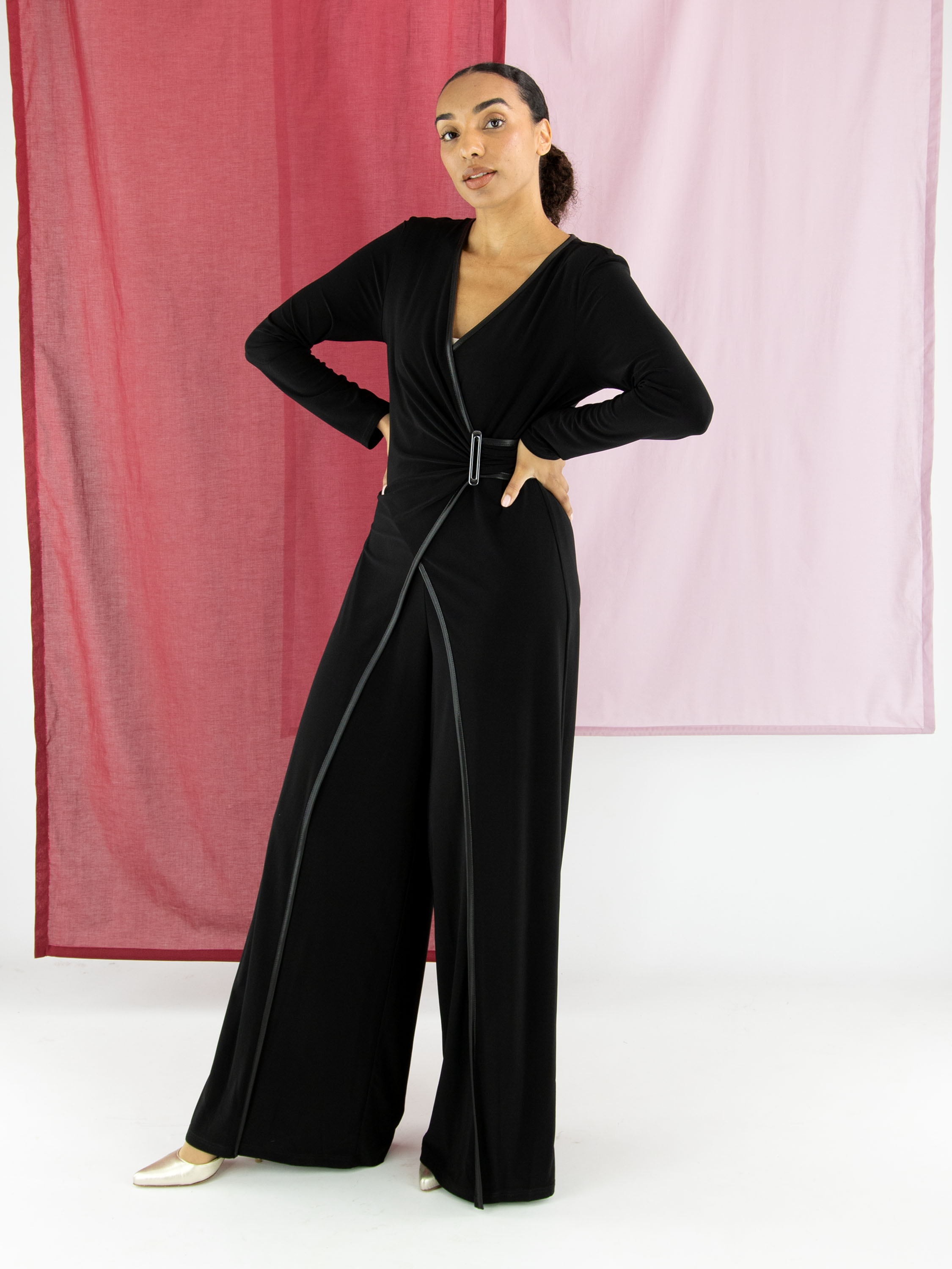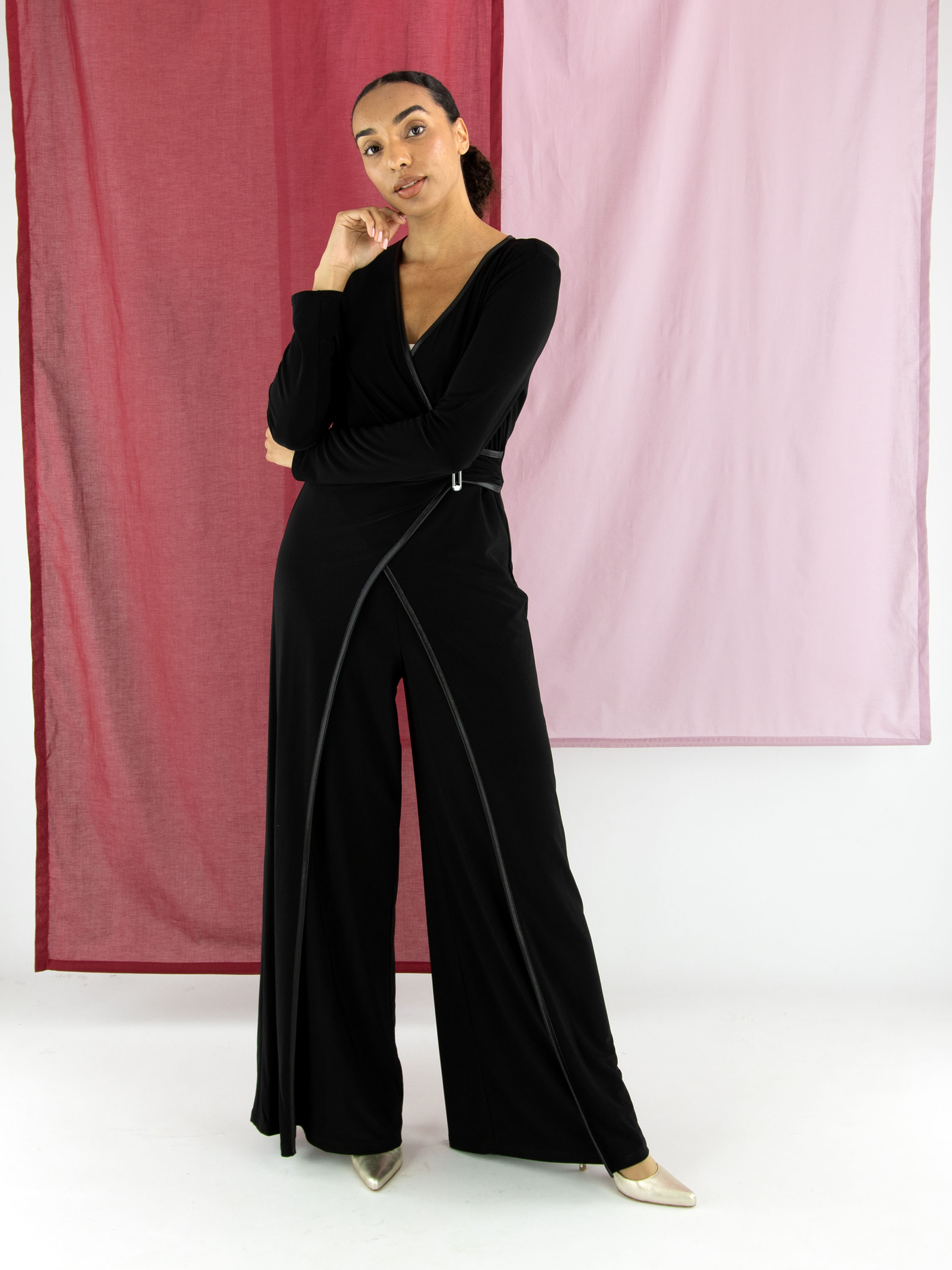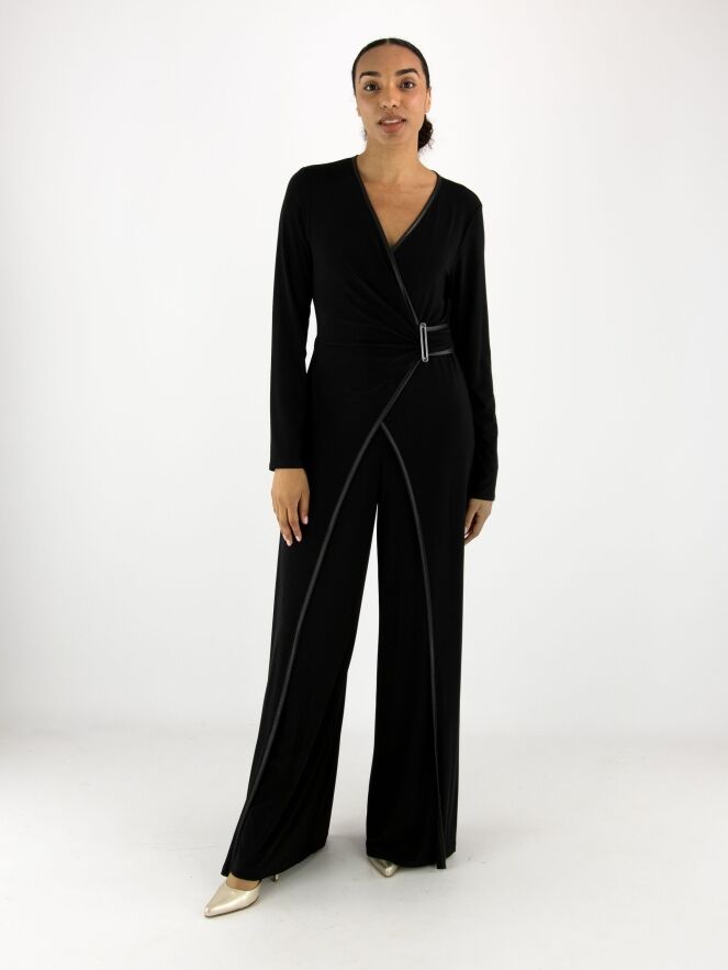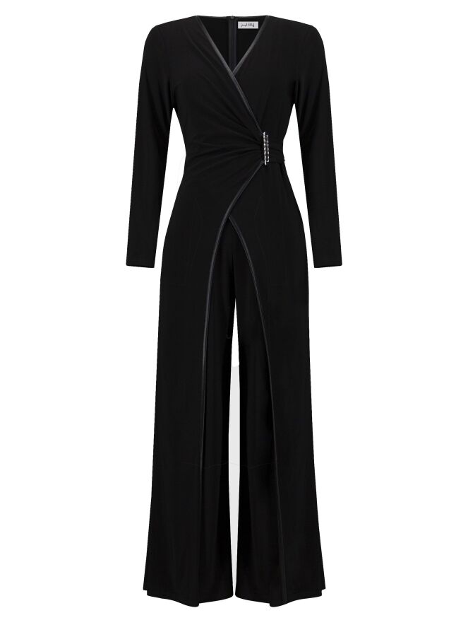 Wickel-Jumpsuit von Joseph Ribkoff in Schwarz. Entlang des Halsausschnitts verläuft eine Kunstlederpaspel nach unten. In der Taille befindet sich eine schmale, rechteckige Schnalle. Dieser Jumpsuit sollte von Hand gewaschen werden.