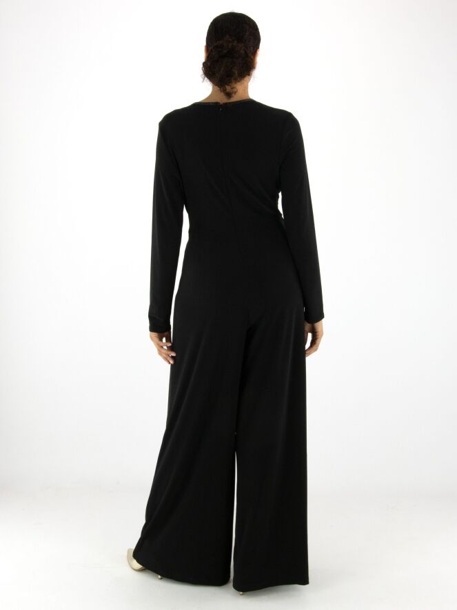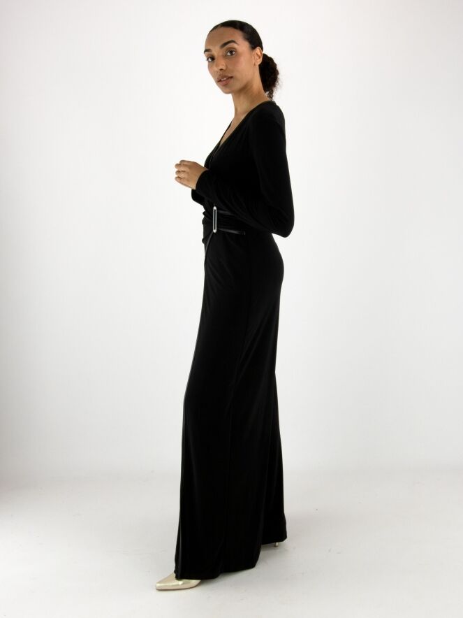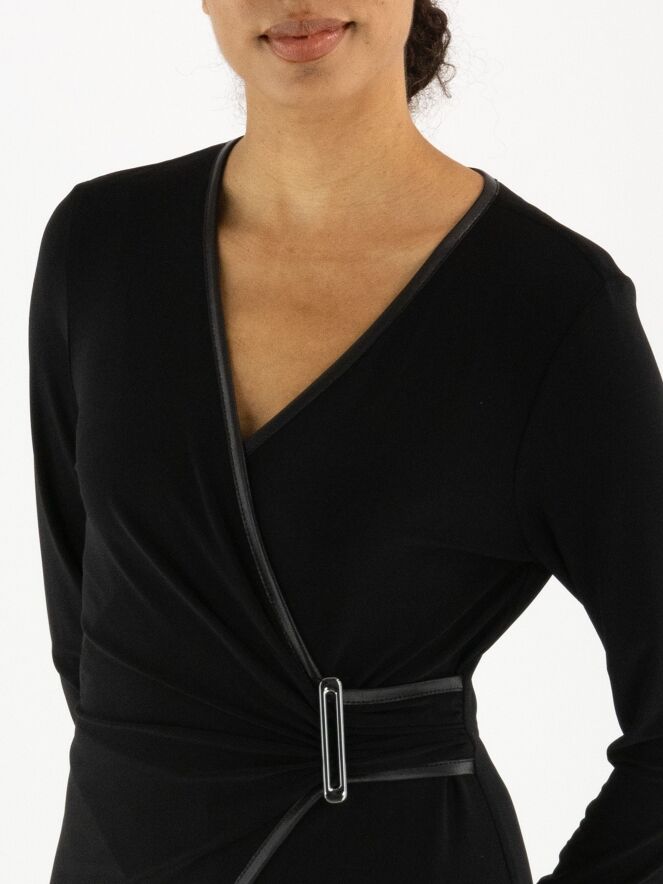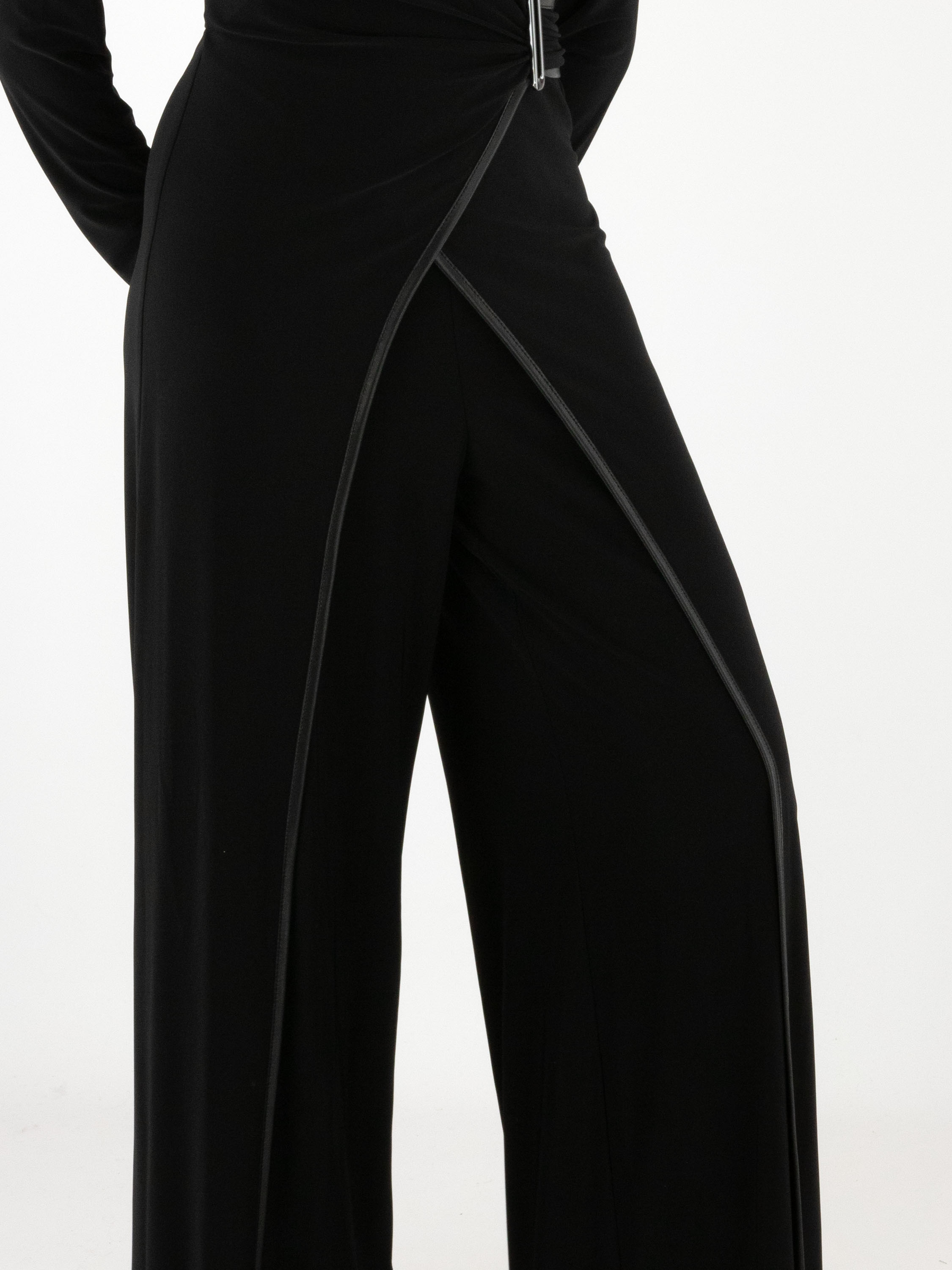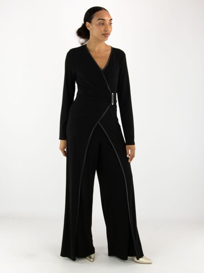 Wickel-Jumpsuit von Joseph Ribkoff in Schwarz. Entlang des Halsausschnitts verläuft eine Kunstlederpaspel nach unten. In der Taille befindet sich eine schmale, rechteckige Schnalle. Dieser Jumpsuit sollte von Hand gewaschen werden.