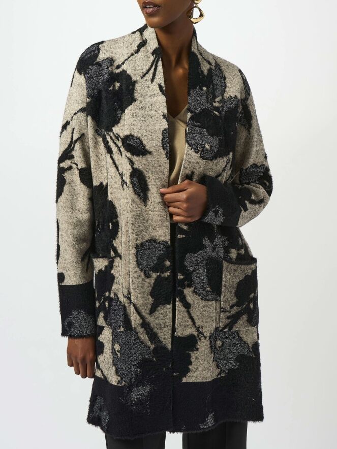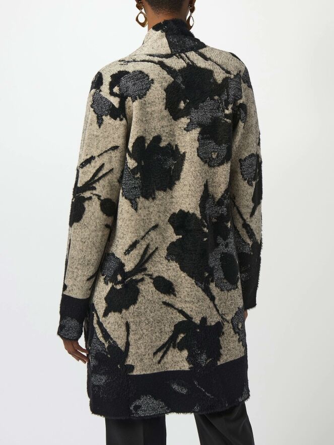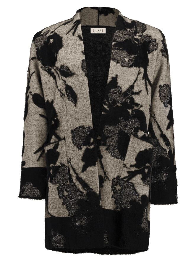Halblange Strickjacke von Joseph Ribkoff mit einem grafischen Blumenmuster in verschiedenen Grau- und Schwarztönen. In die Blütenpartien ist Silberfaden eingearbeitet. Die Jacke hat keinen Verschluss und sollte von Hand gewaschen werden.