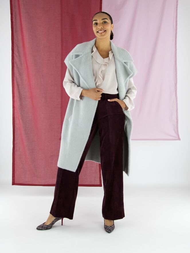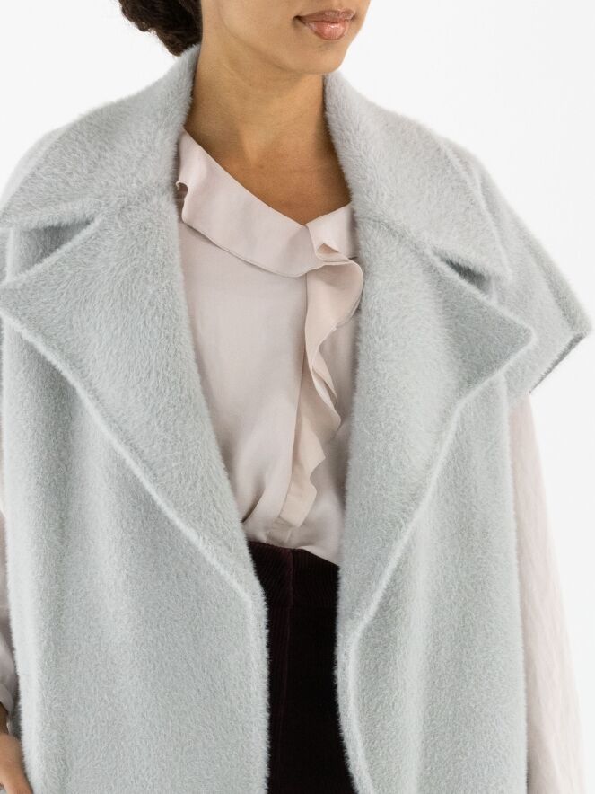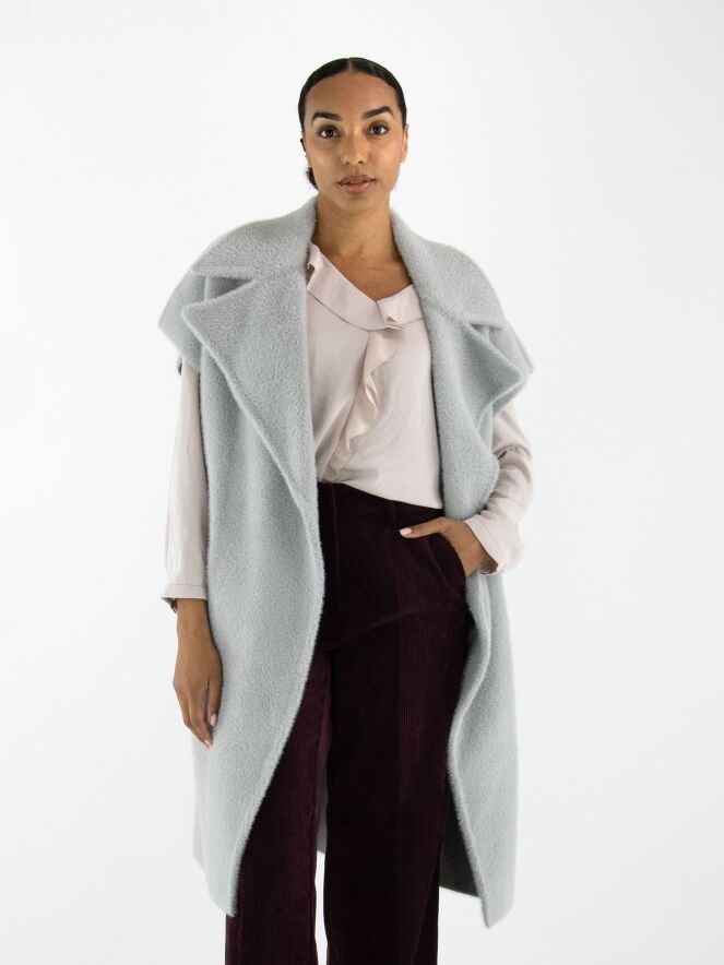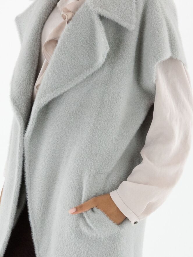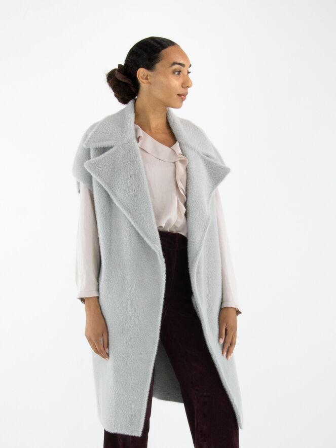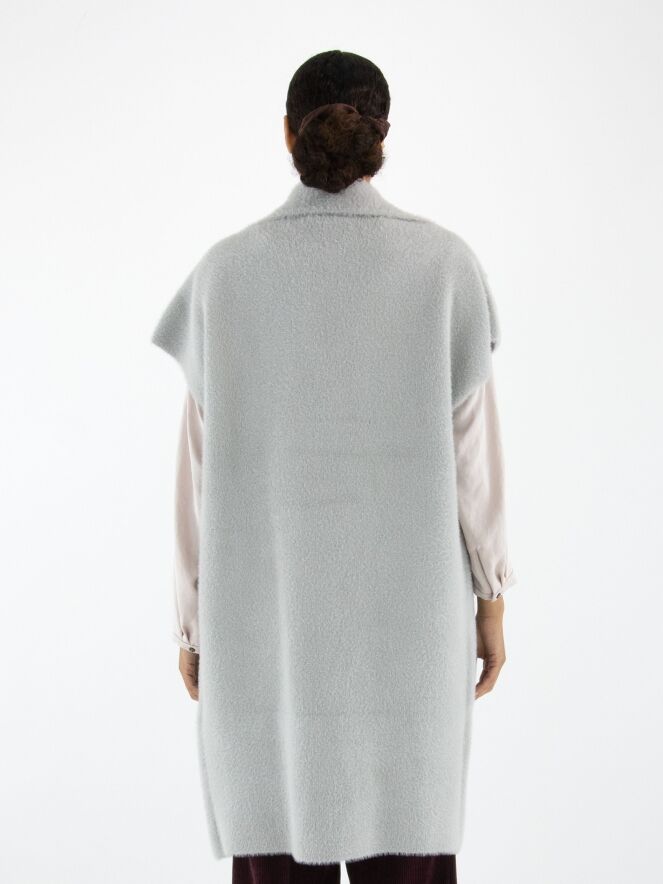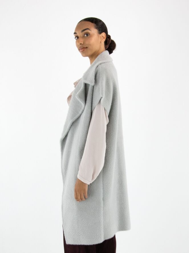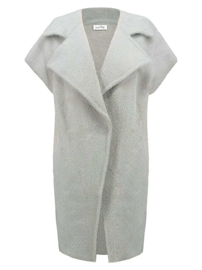 A mid-length bodywarmer by Joseph Ribkoff in light grey. It features a wide collar and has no closure. There are slit pockets at the waist. This bodywarmer should be hand-washed.