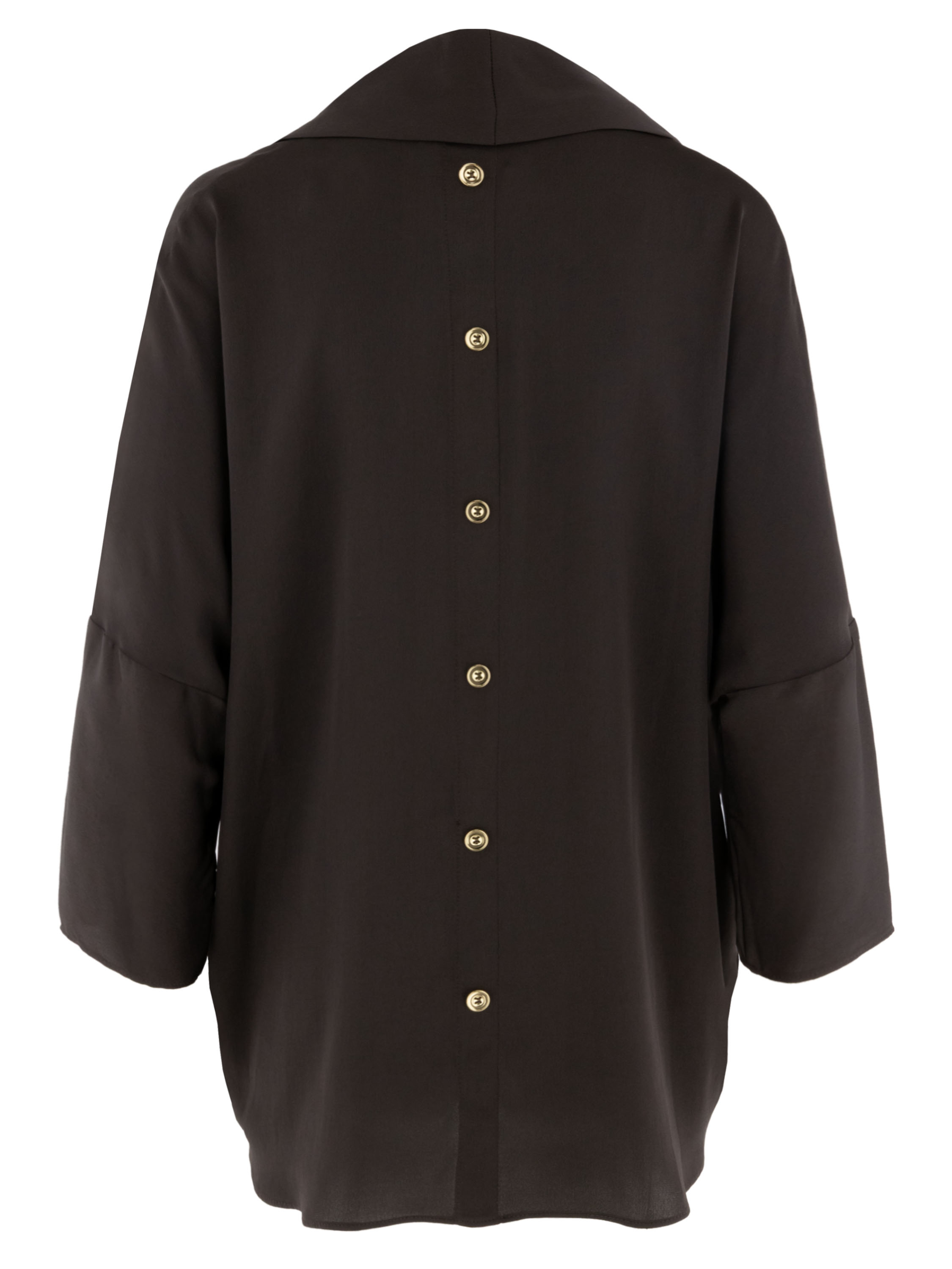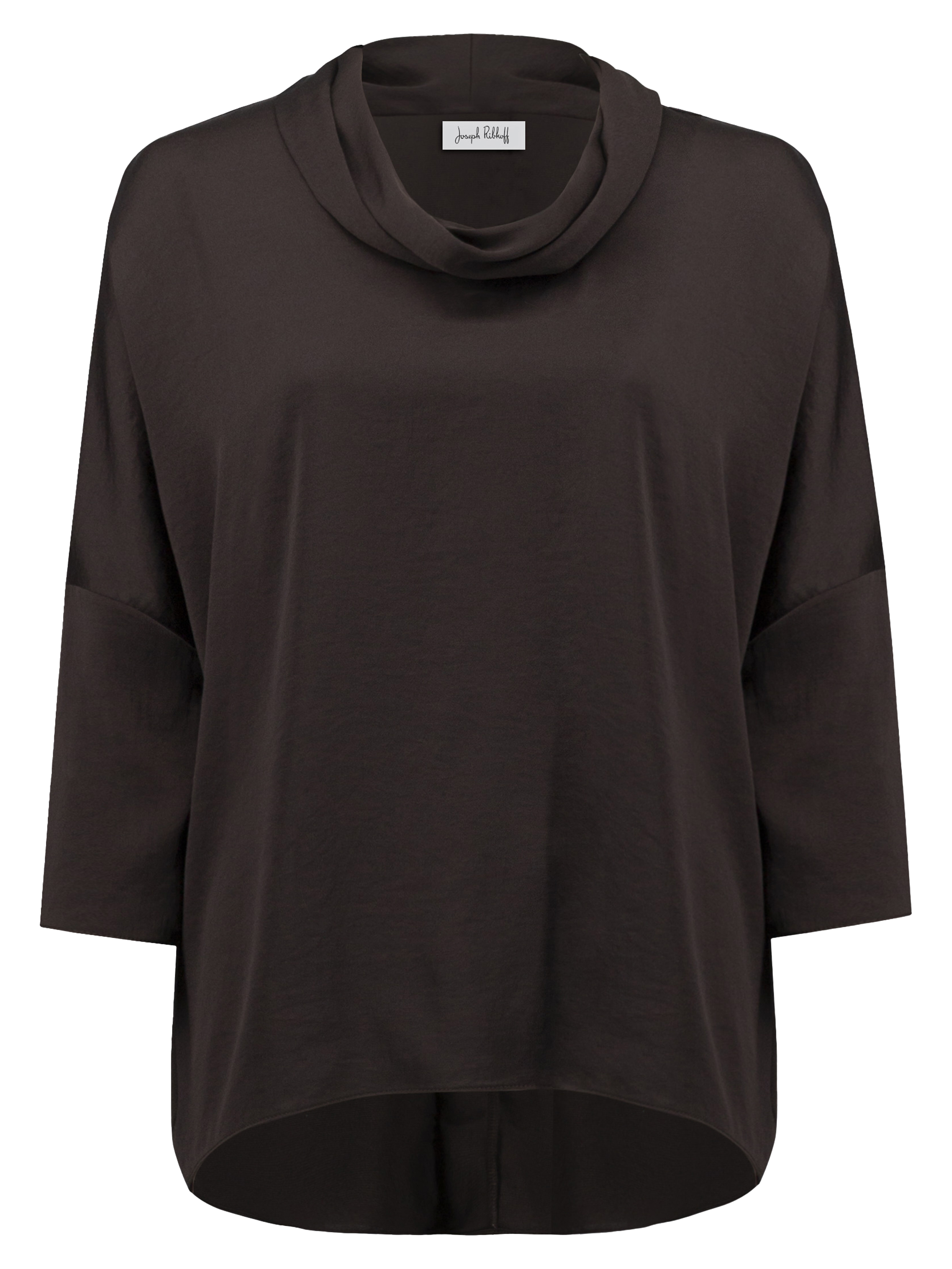 Ein mattes Satinshirt von Joseph Ribkoff in Mokkabraun. Das Shirt hat einen elegant fallenden Kragen und halblange Ärmel, was ihm eine feminine und raffinierte Ausstrahlung verleiht. Dieses Shirt kann per Hand gewaschen werden.